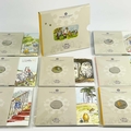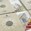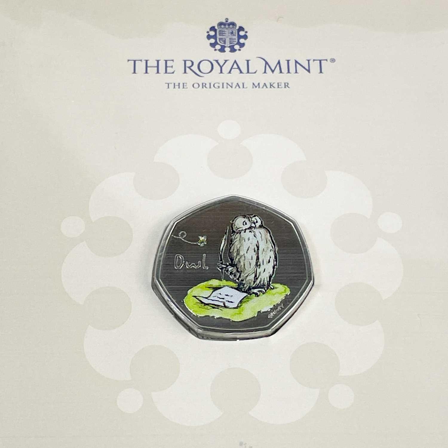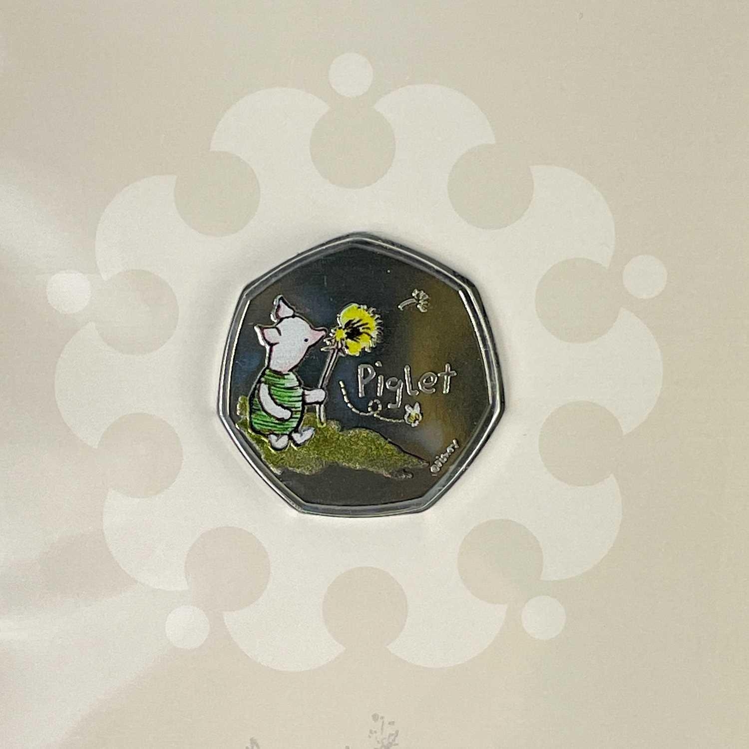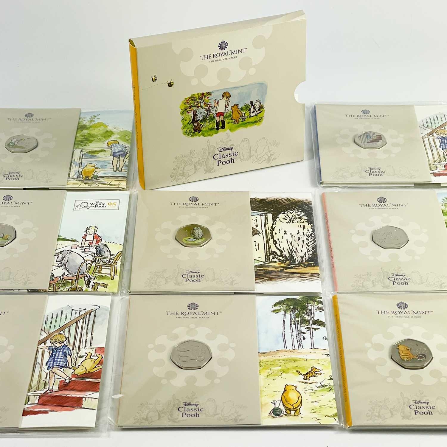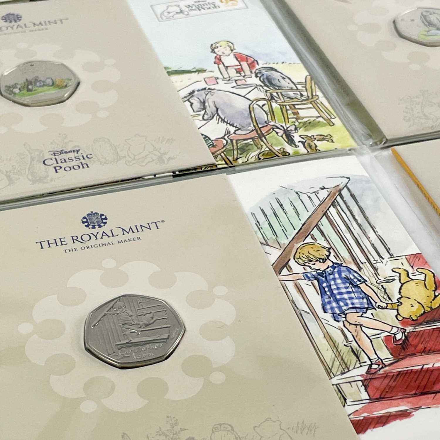 UK 2020 & 2021 50 pence Disney Classic Pooh colourised and uncolourised uncirculated coins in Royal Mint packaging (x8) Comprising: 1: A cardboard sleeve of 3 colourised 2020 coins: Winnie the Pooh, Christopher Robin and Piglet. 2: 2x 2021 colourised coins: Winnie the Pooh and Owl. 3: 3x 2020 uncolourised coins. Christopher Robin, Piglet and Winnie the Pooh.