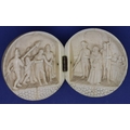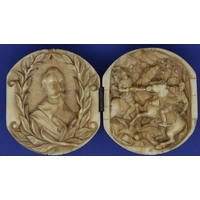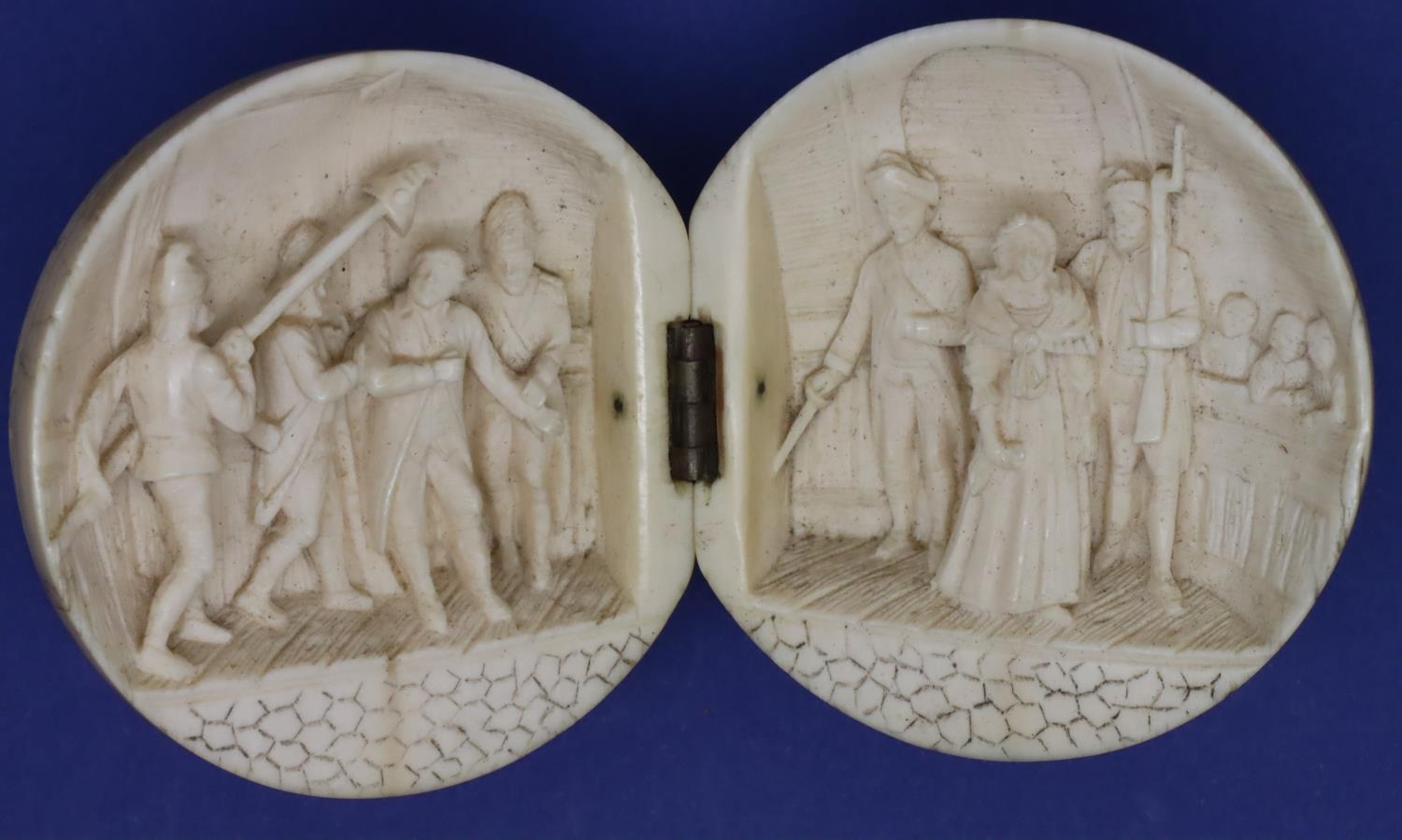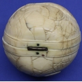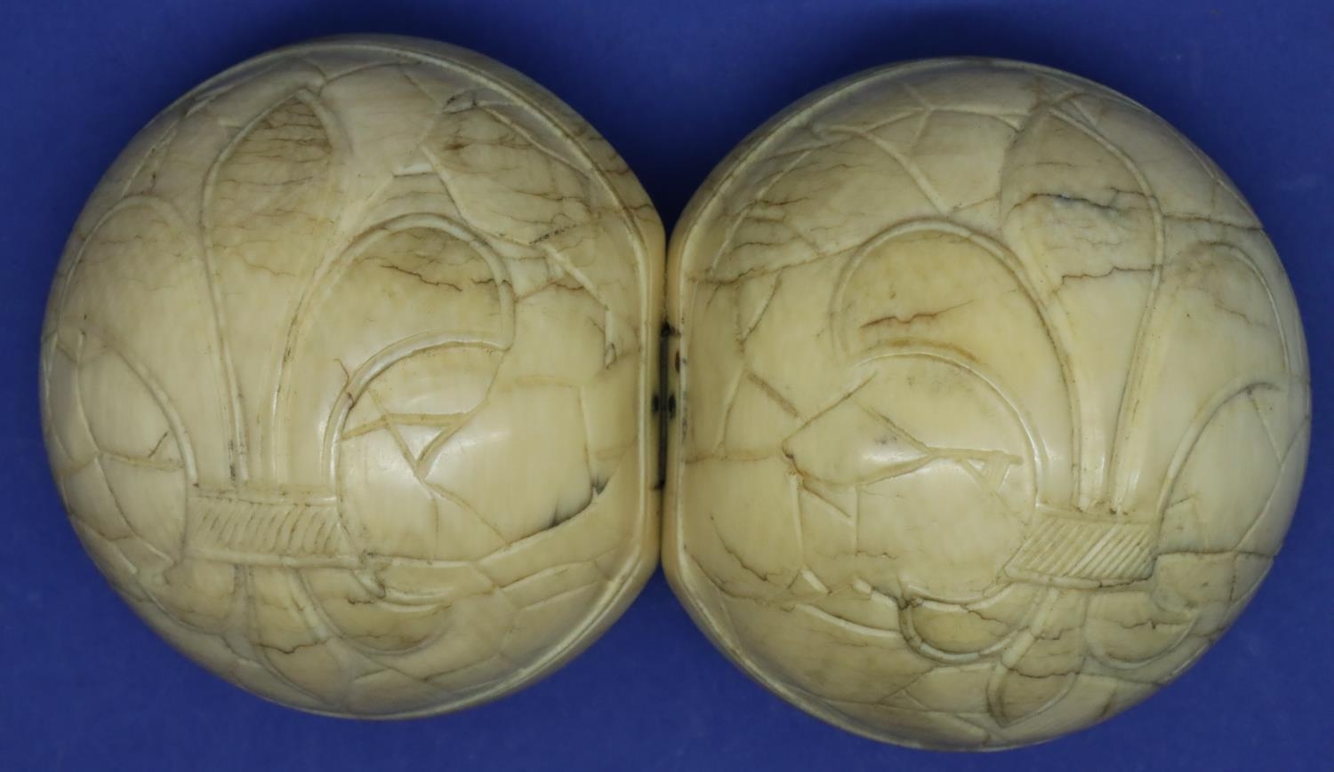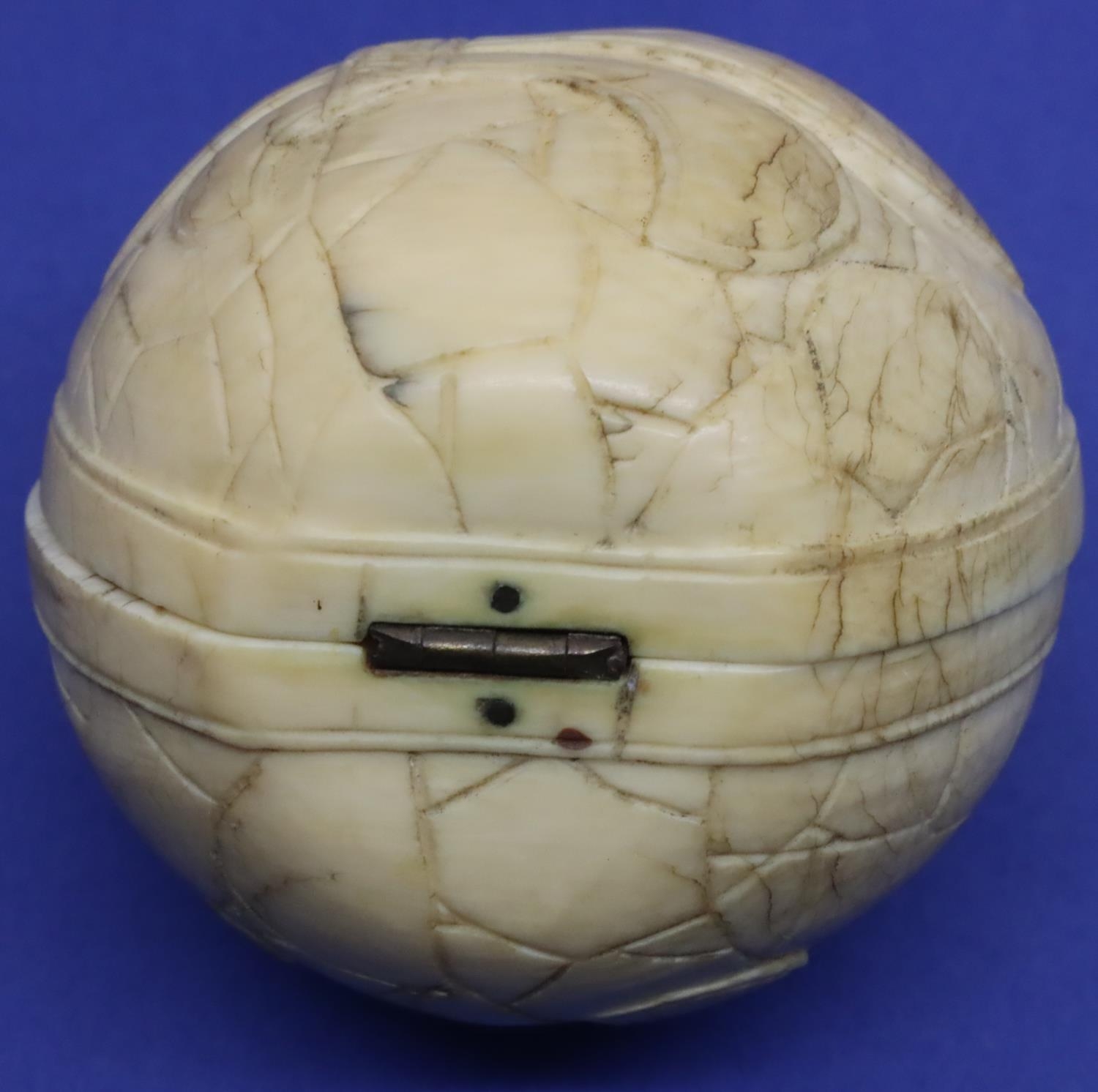 Dieppe ivory hinged ball internally carved with an arrest and a courtroom scene, L: 600 mm (closed). P&P Group 1 (£14+VAT for the first lot and £1+VAT for subsequent lots)