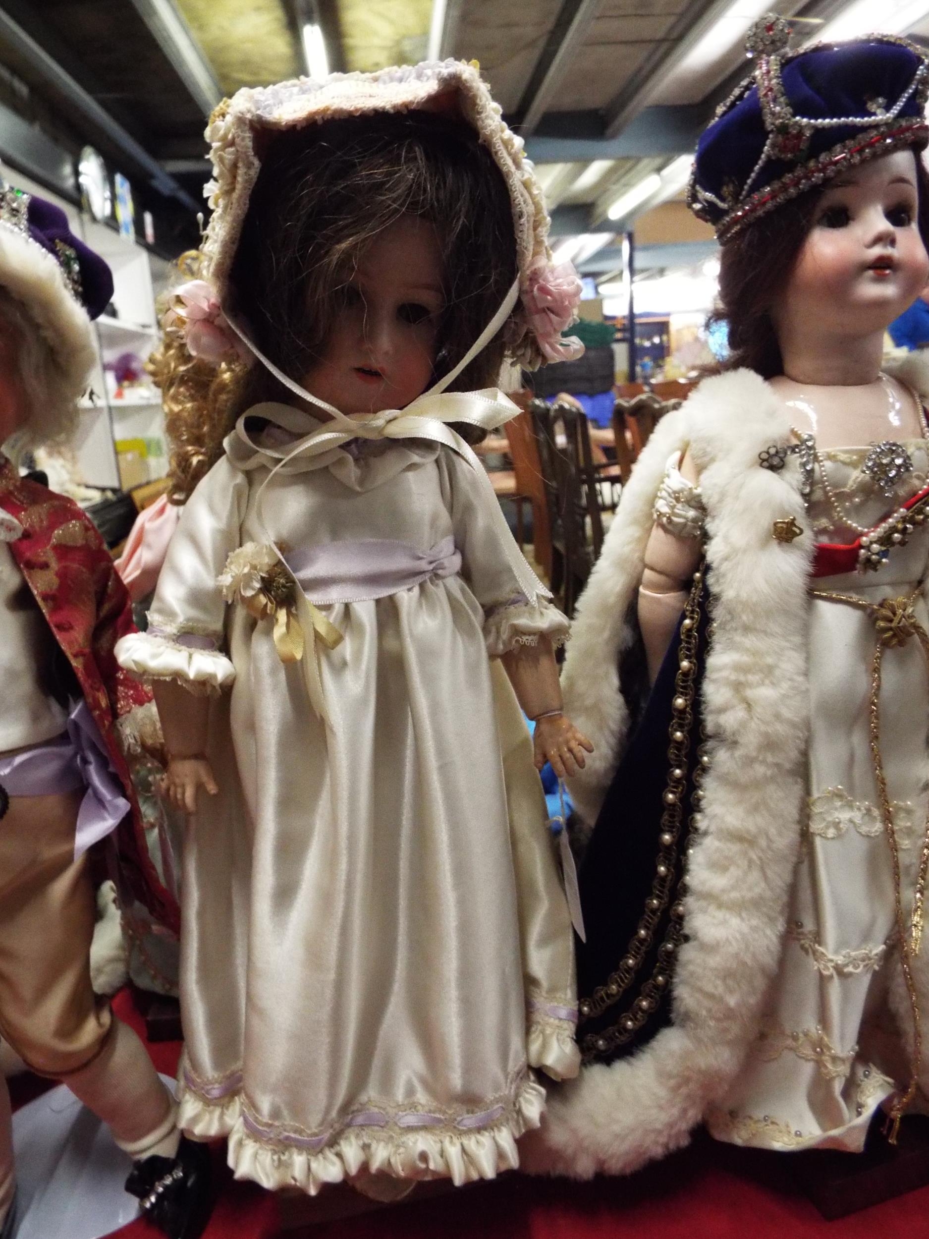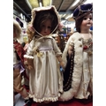 A vintage 18” Heubach Köppelsdorf 250.3/0 German bisque head doll (not in original costume) on wooden stand