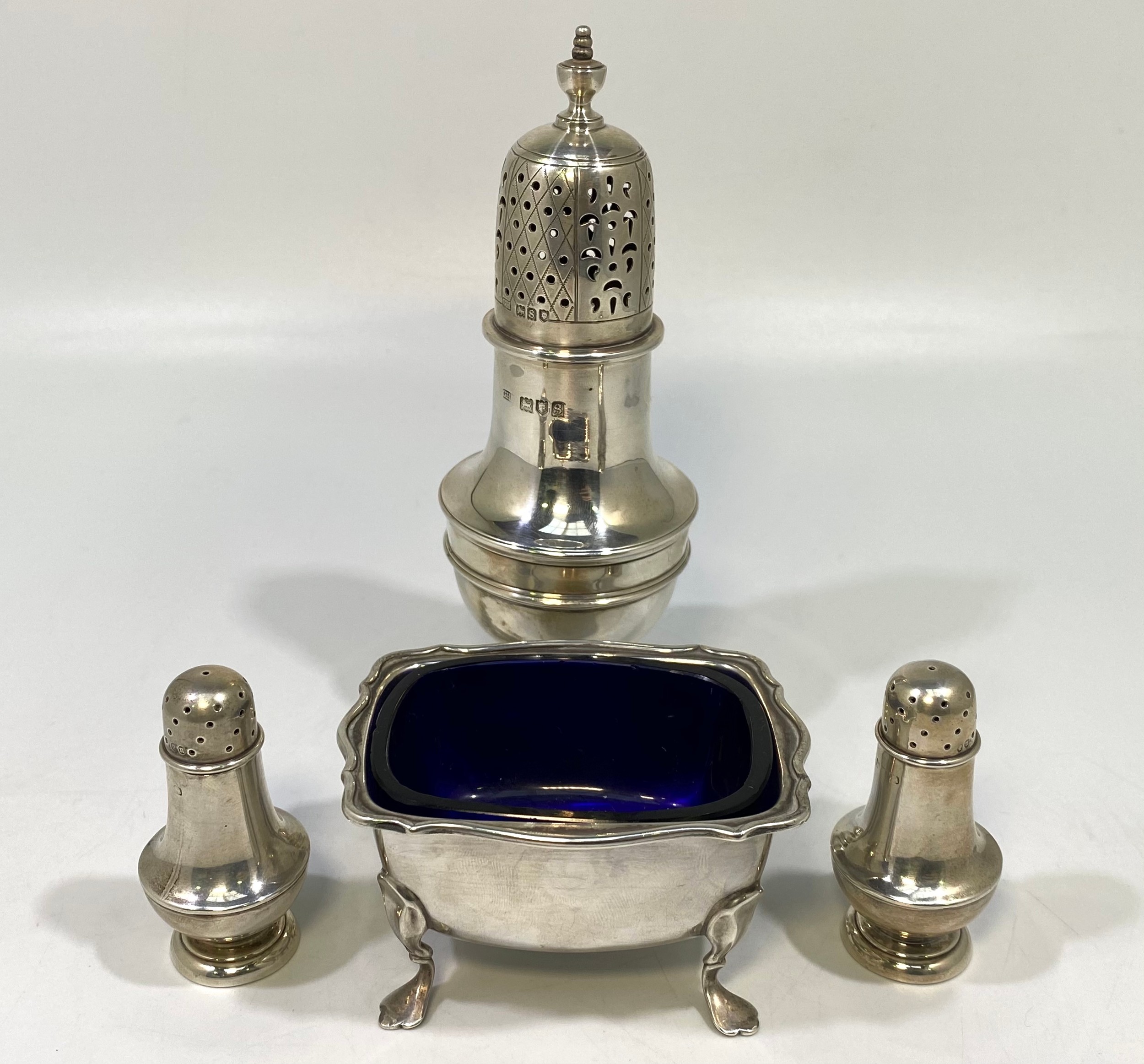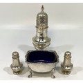 A pair of Victorian silver baluster-shaped peppers, London, 1887, and silver baluster sugar caster, London, 1913, together with an Edwardian silver open salt with blue-glass liner, London, 1908, 8.49ozt