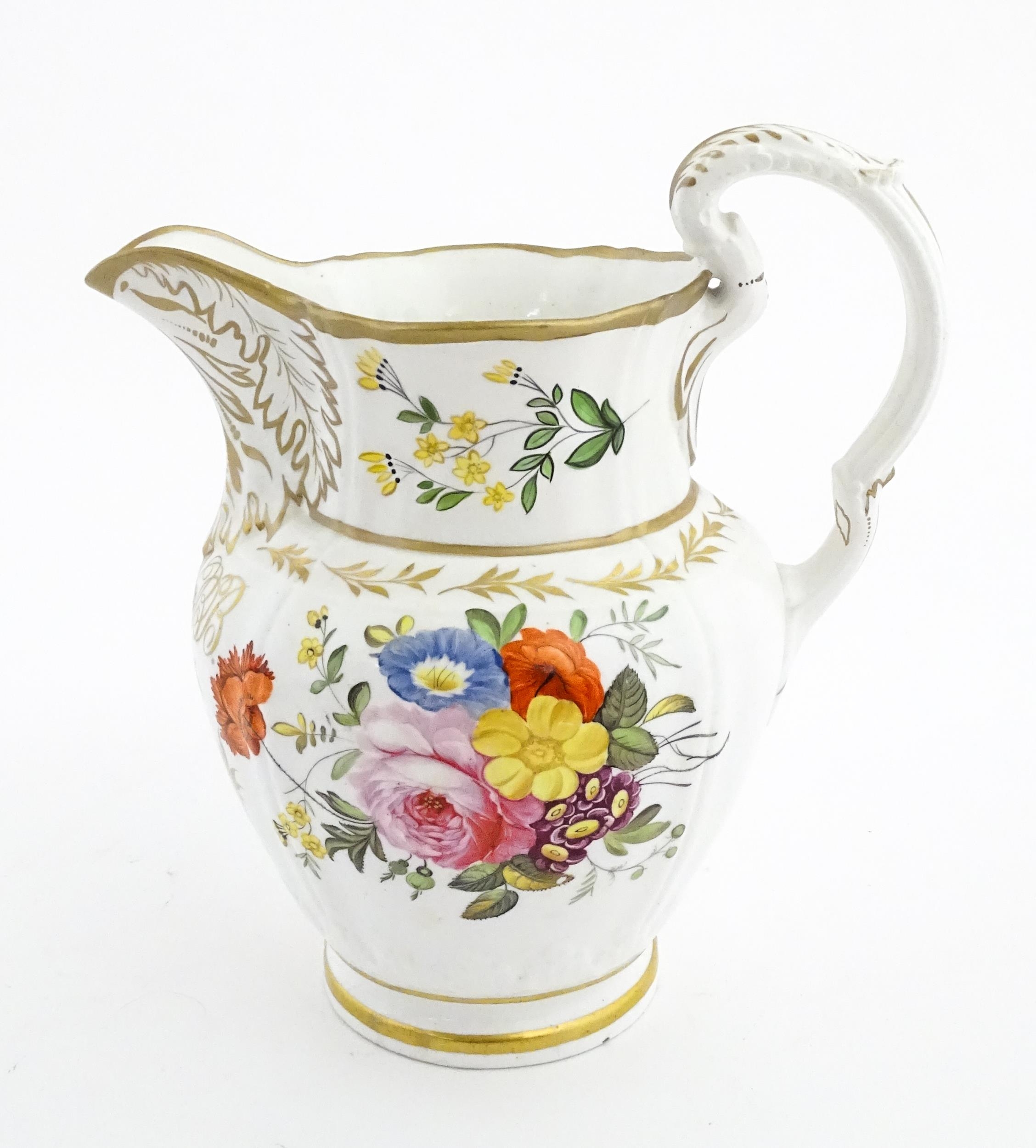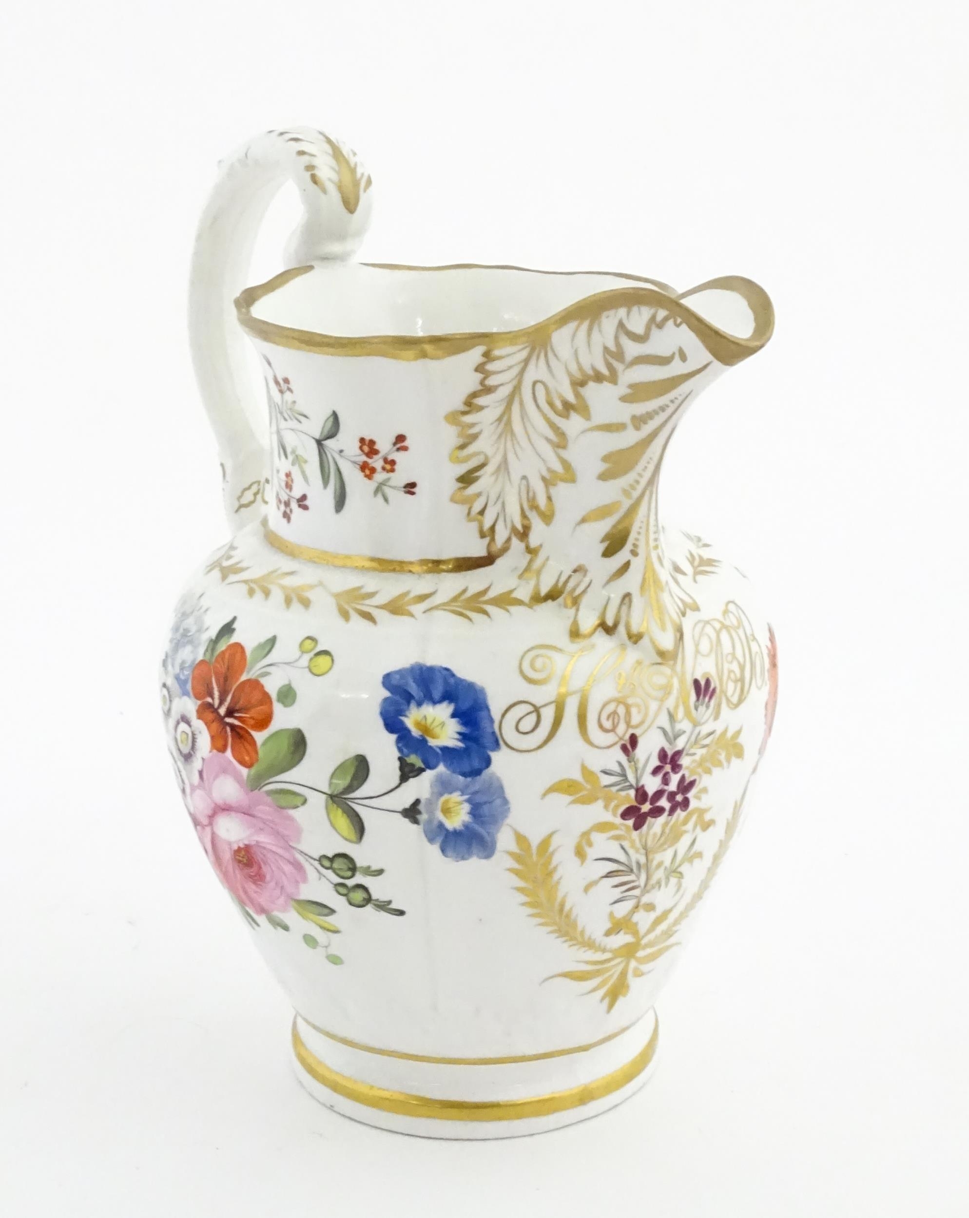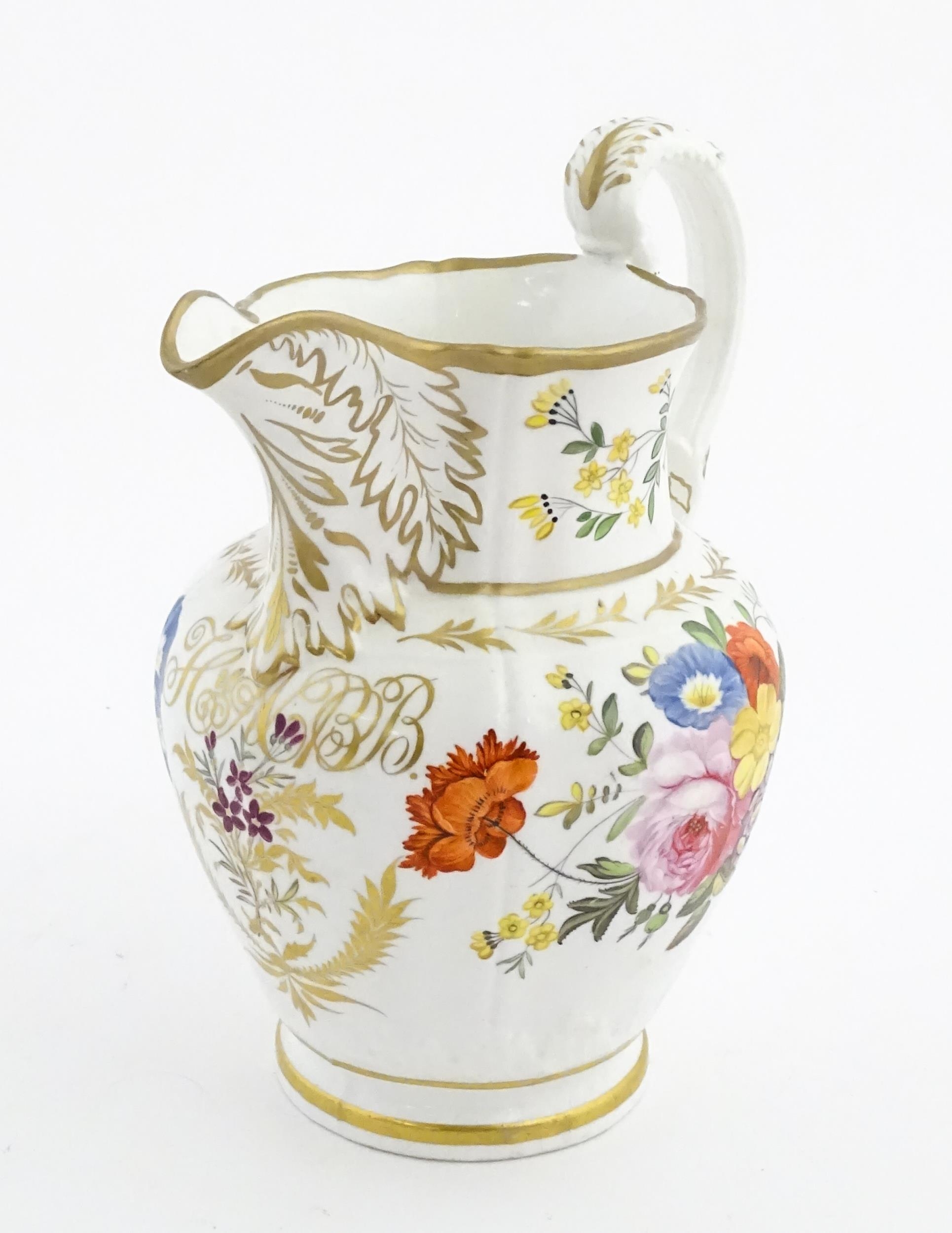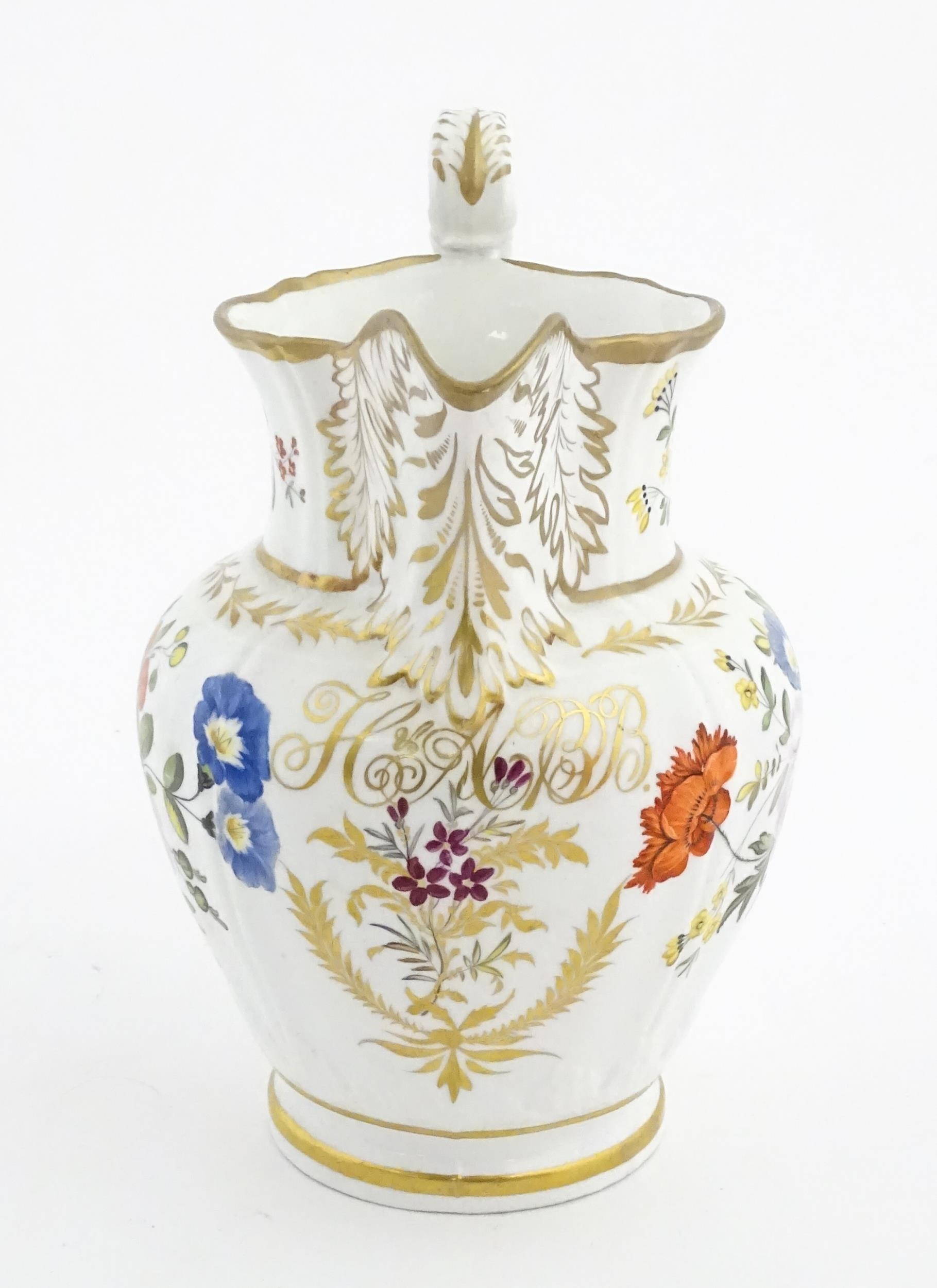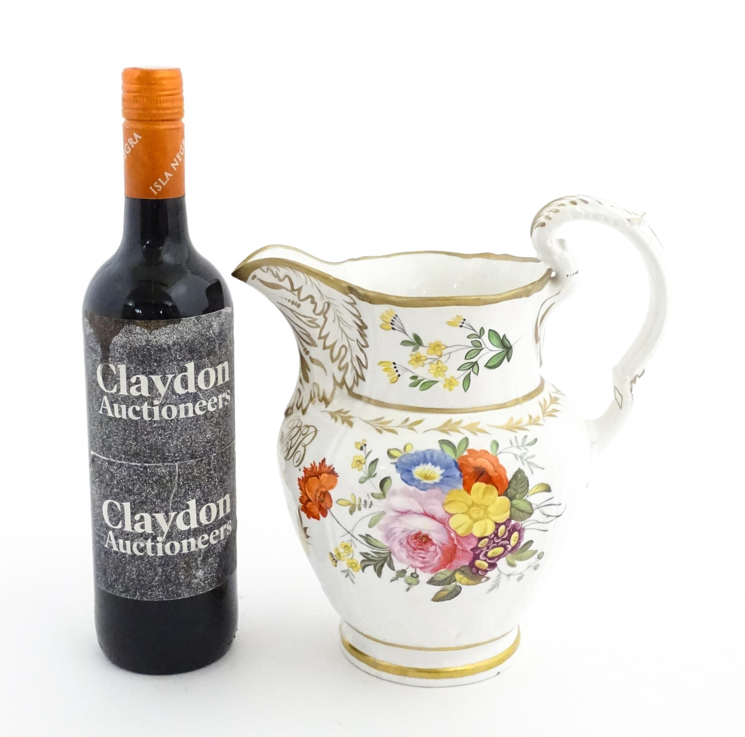 A Victorian jug / pitcher with hand painted flower decoration and gilt initials HABB. Approx. 9 1/4" high