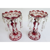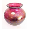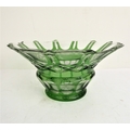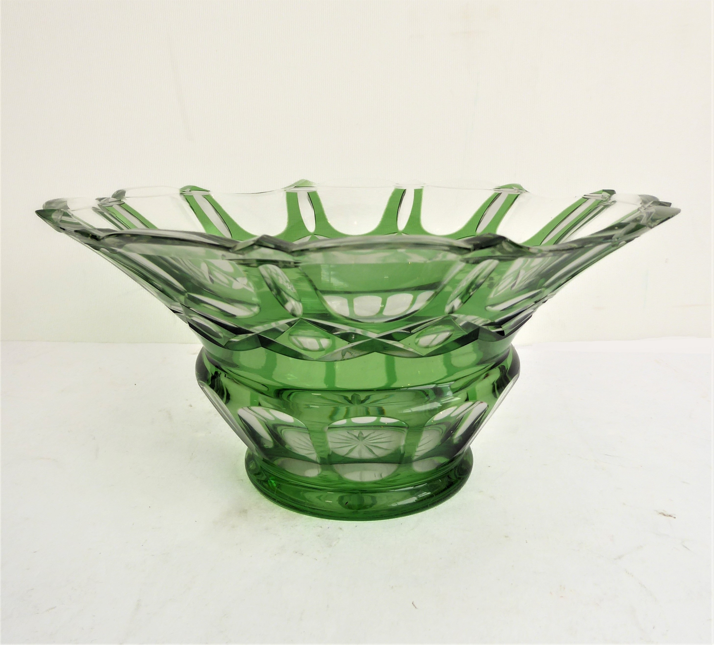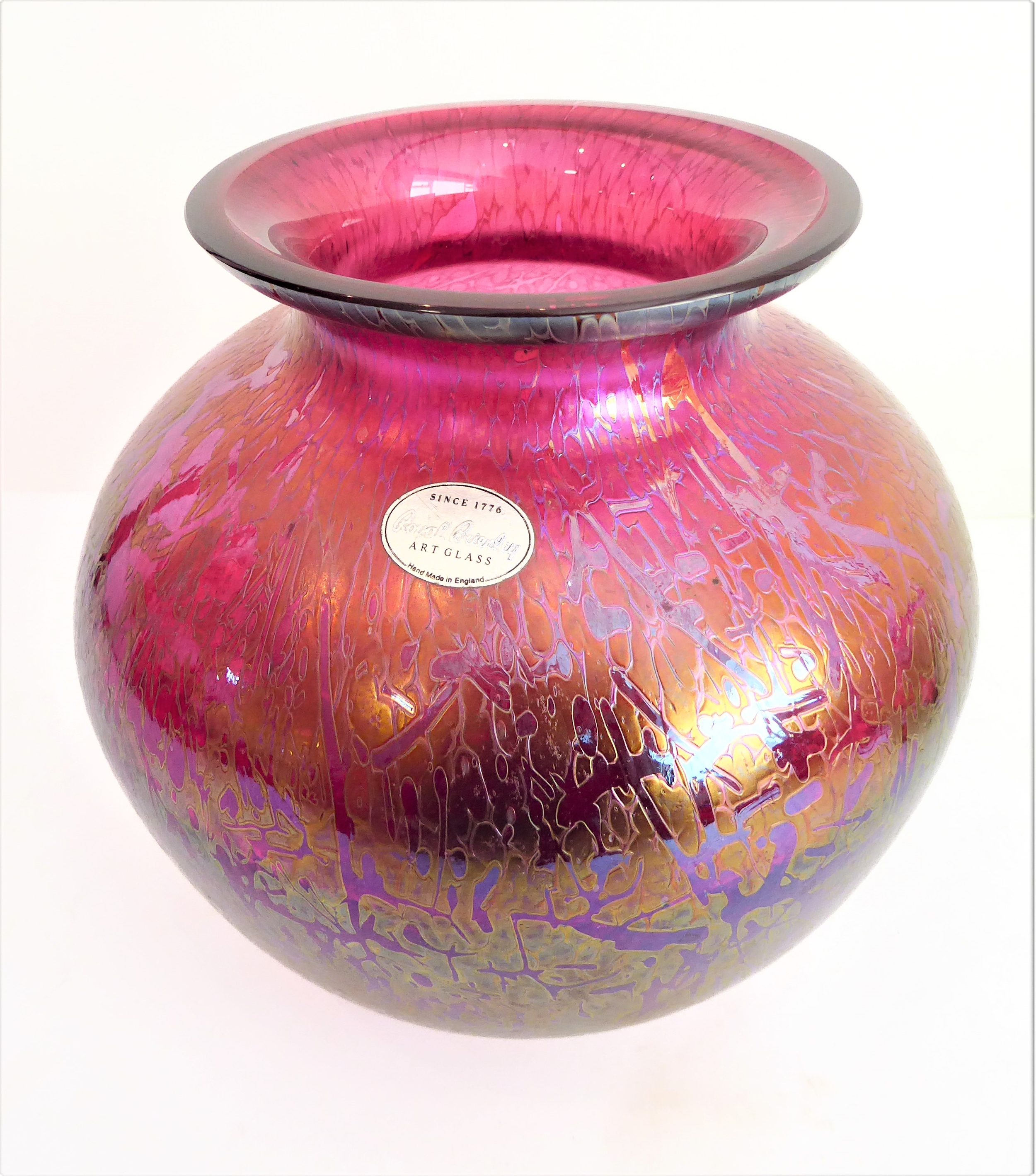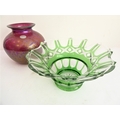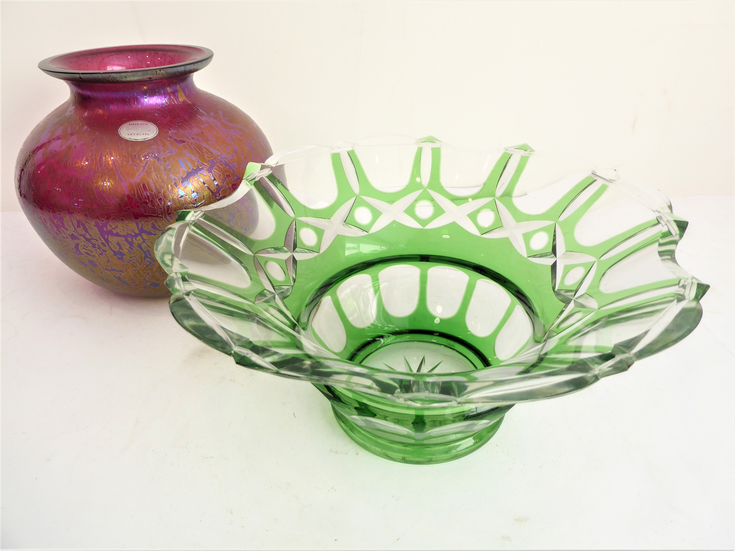 An iridescent red etched glass vase with Royal Brierley Art Glass label, and a Stourbridge large heavy-cut green and clear glass fruit bowl