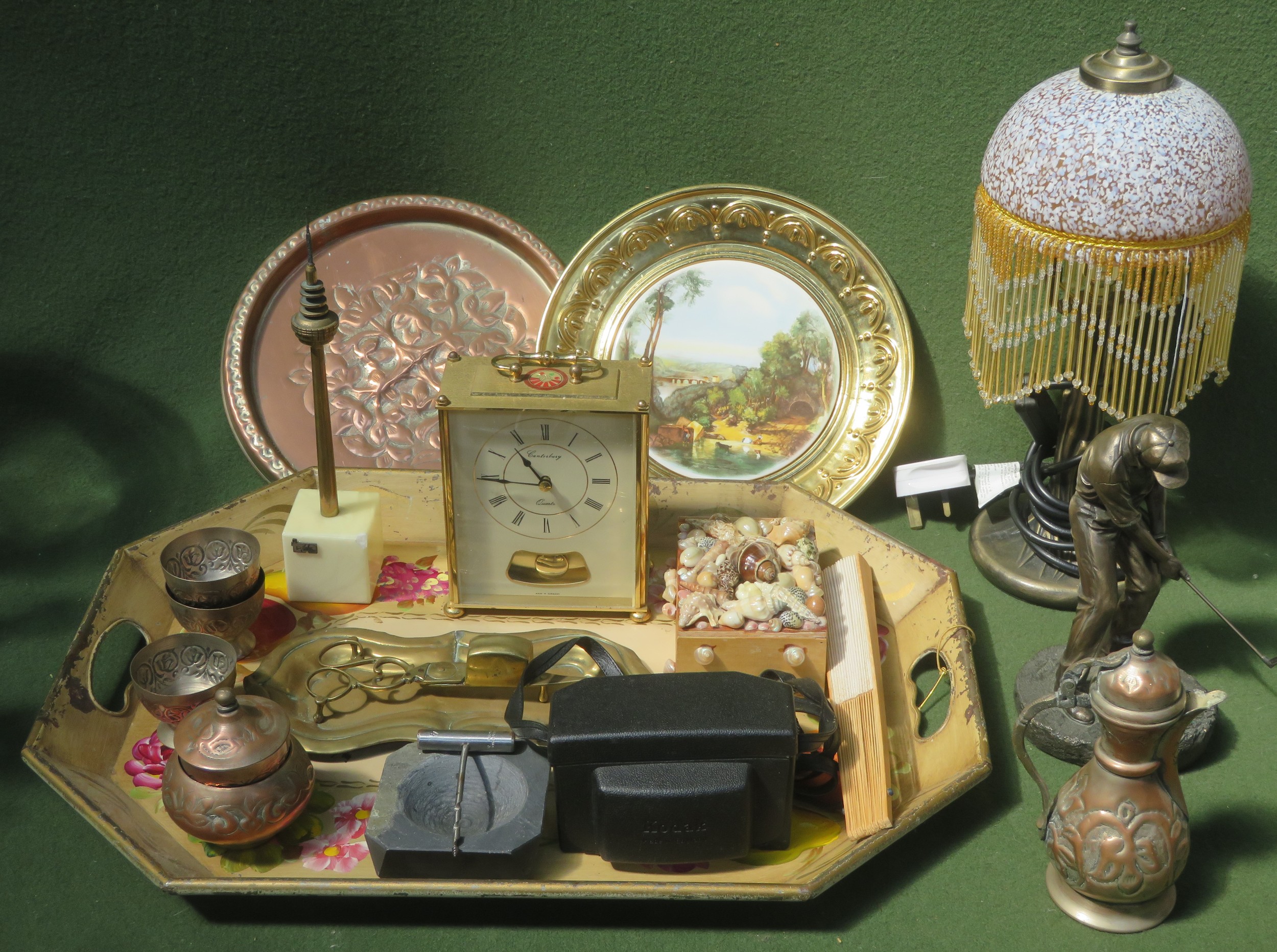 Sundry lot including table lamp, golfing figure, brassware, mantle clock etc