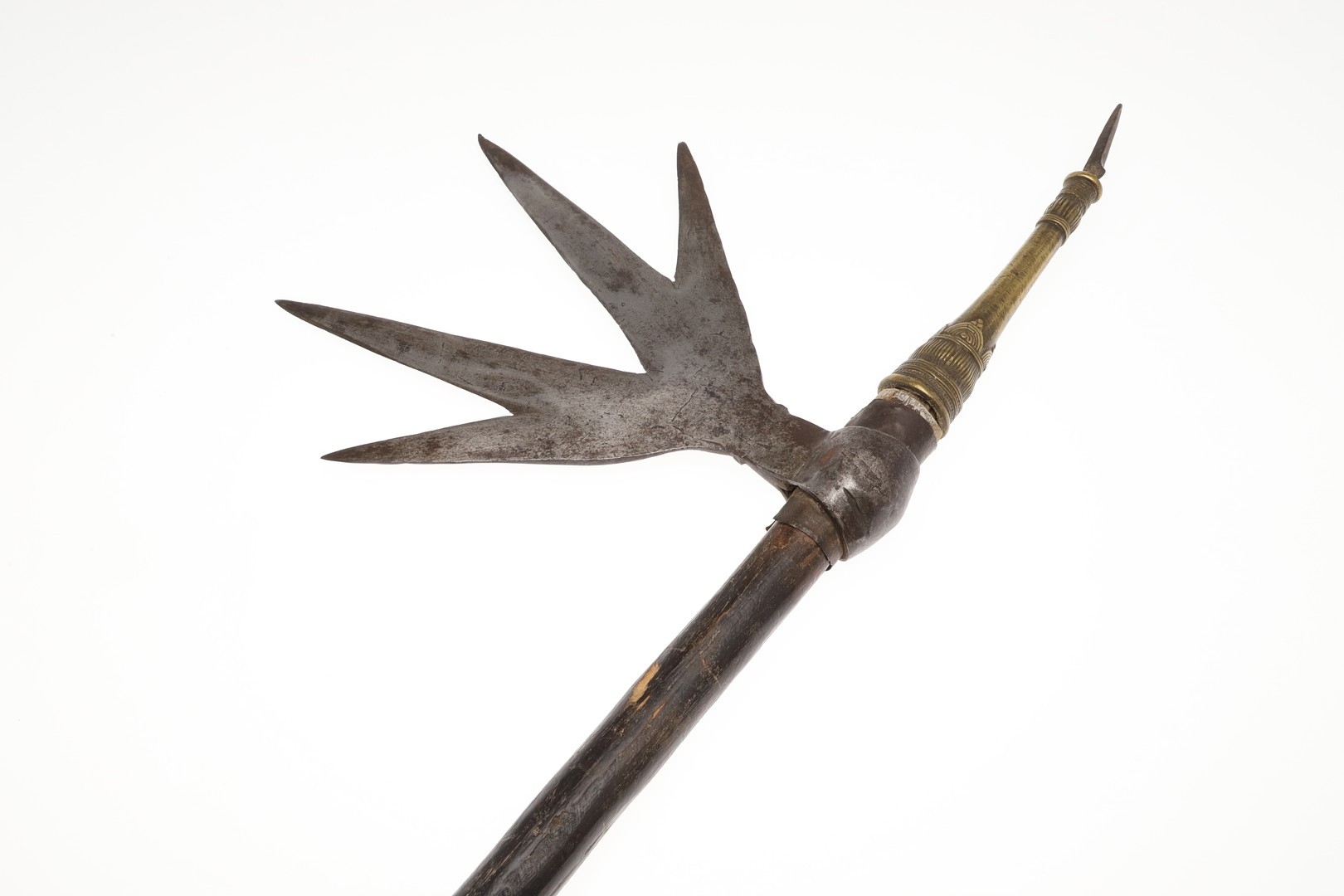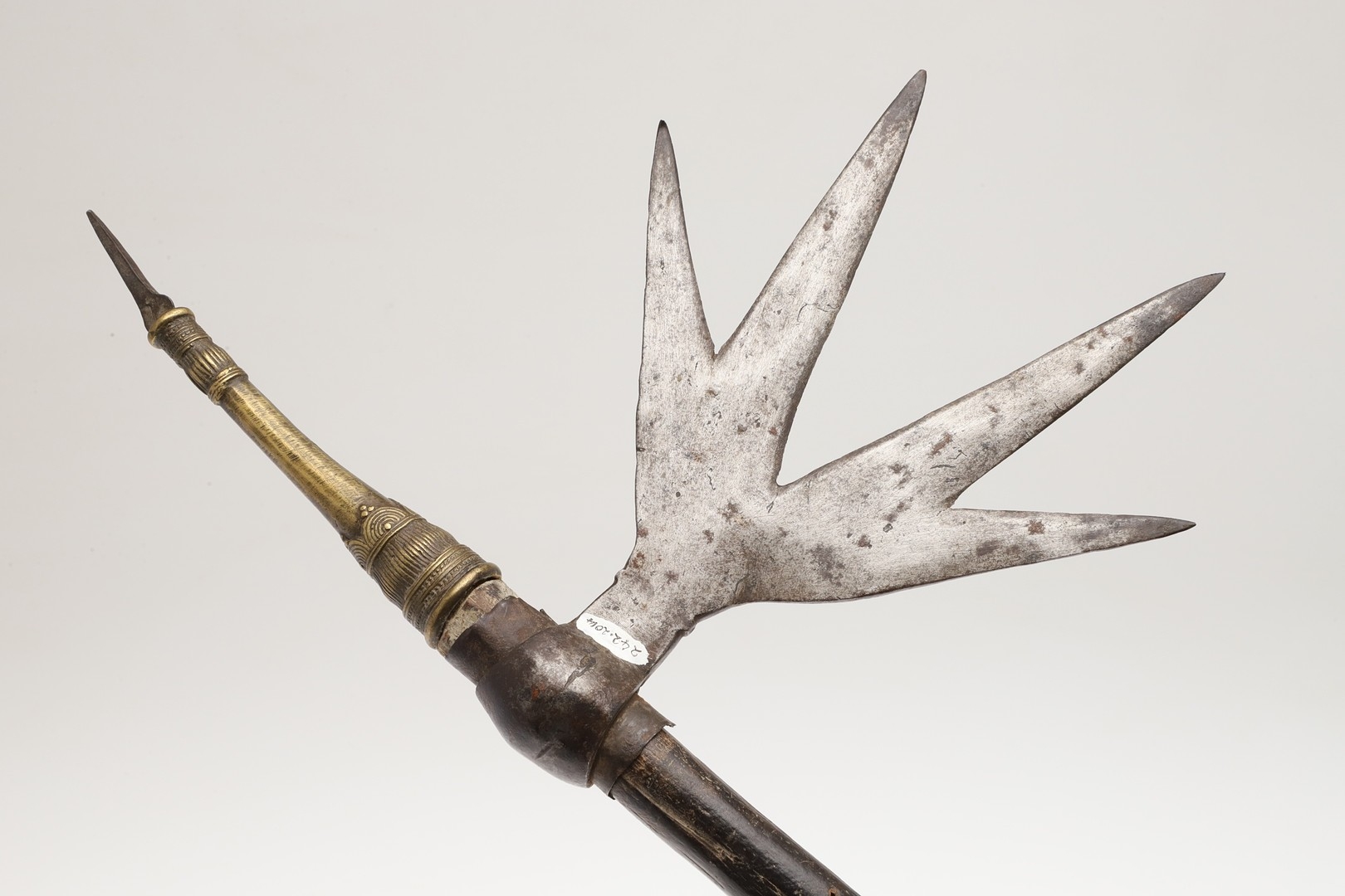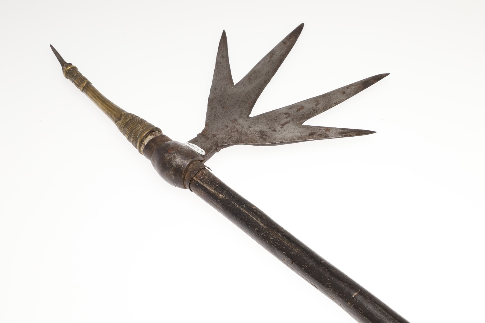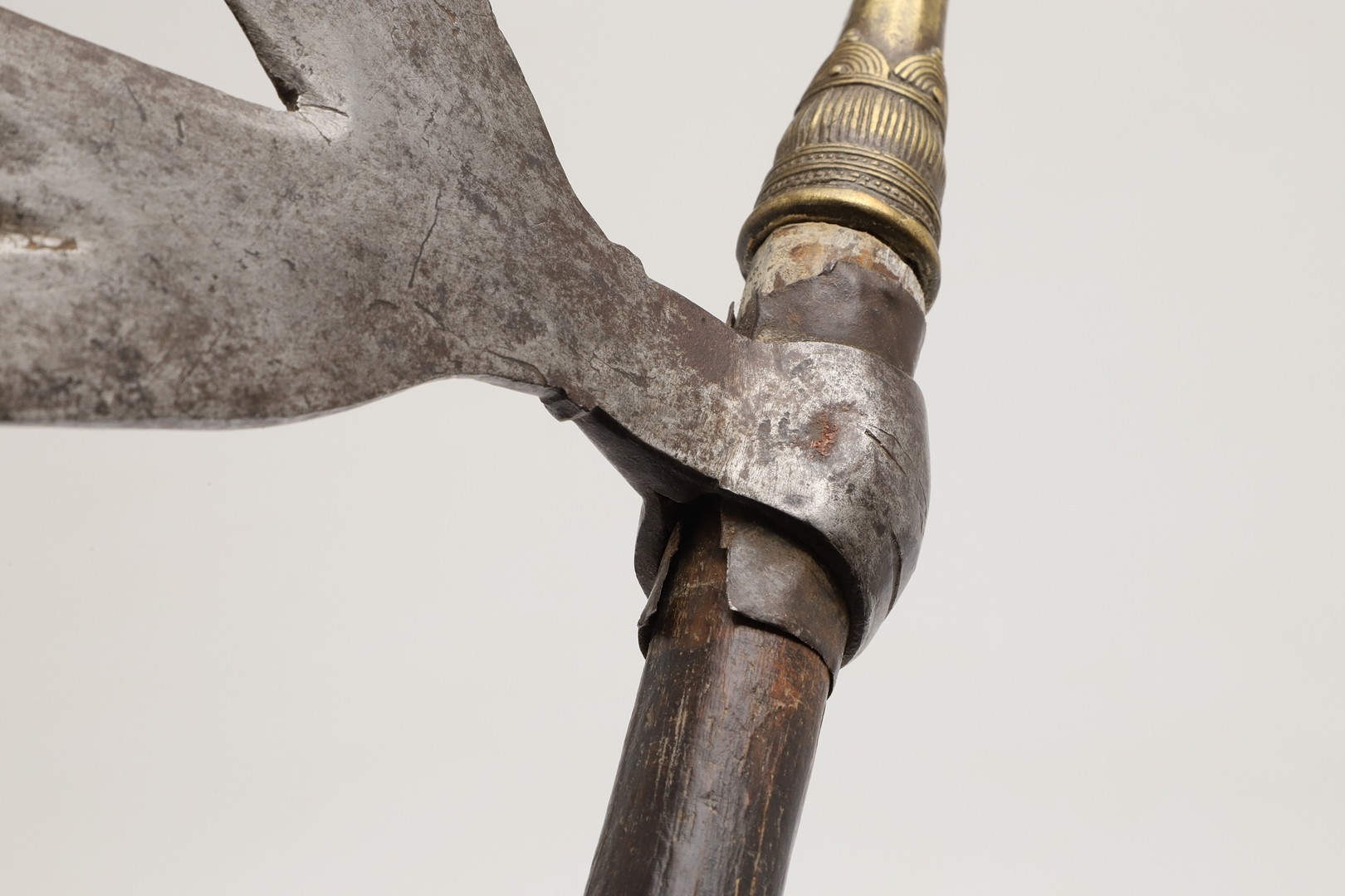 AN INDIAN KOND BULLOVA DAGGER AXE. An axe with a four pronged axe head. The blades 19 cm and similar. On a wooden shaft with brass mount and steel finial with offset point. 99 cm.