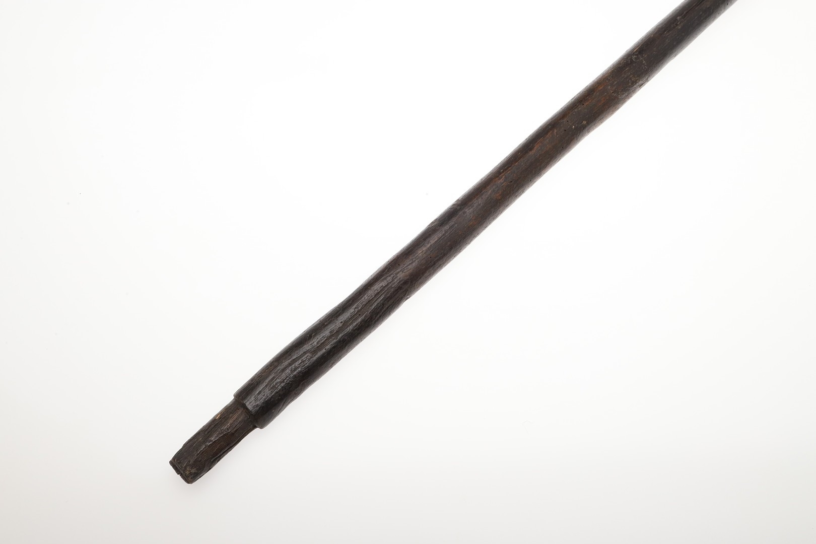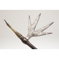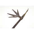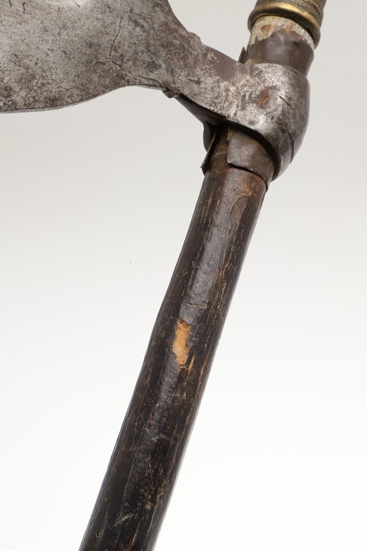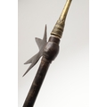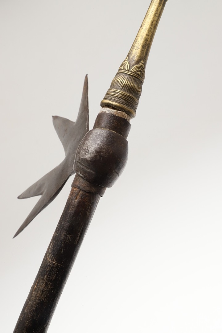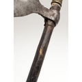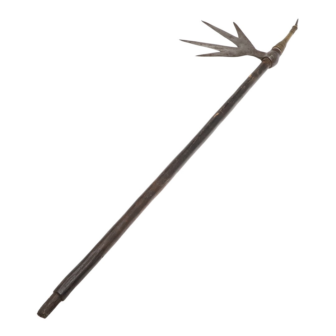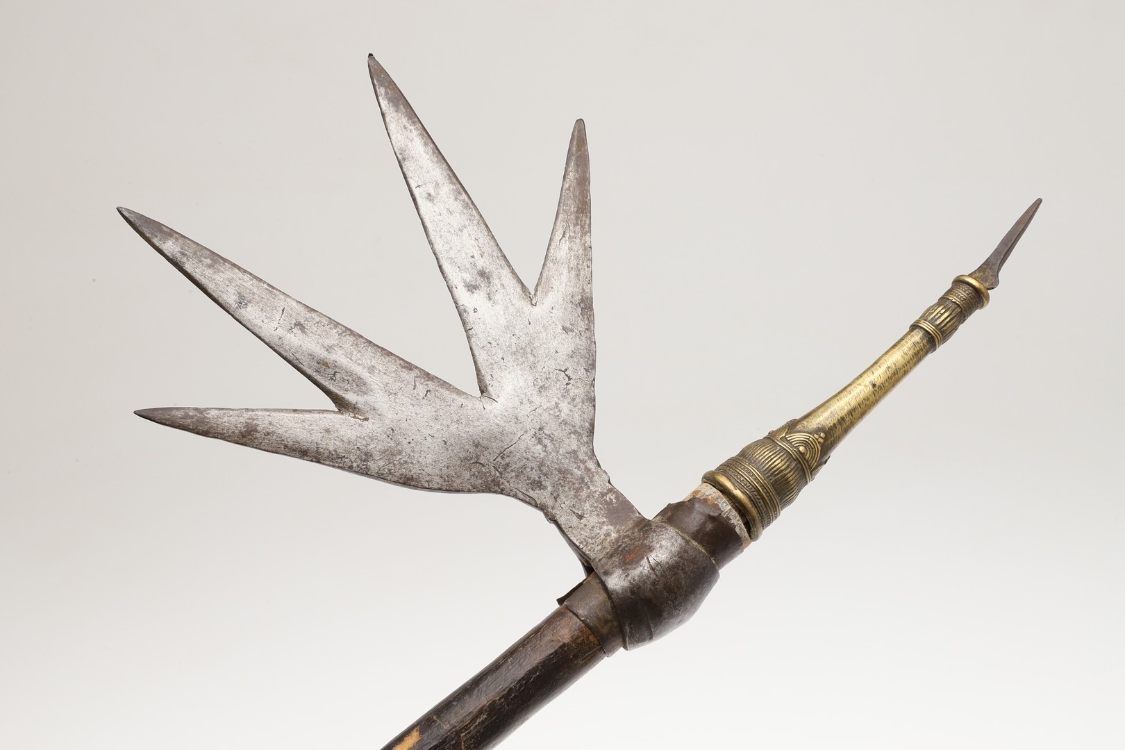 AN INDIAN KOND BULLOVA DAGGER AXE. An axe with a four pronged axe head. The blades 19 cm and similar. On a wooden shaft with brass mount and steel finial with offset point. 99 cm.