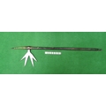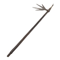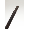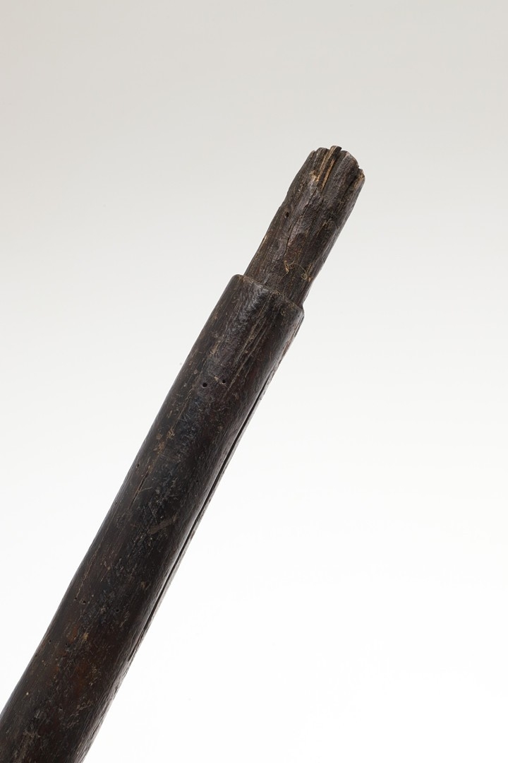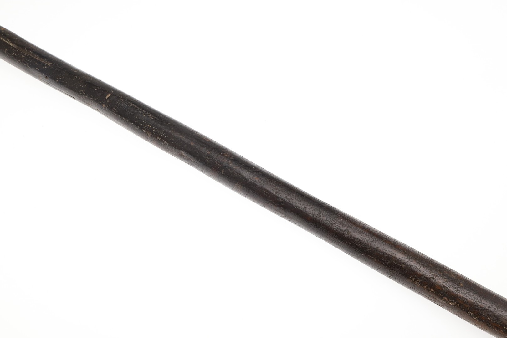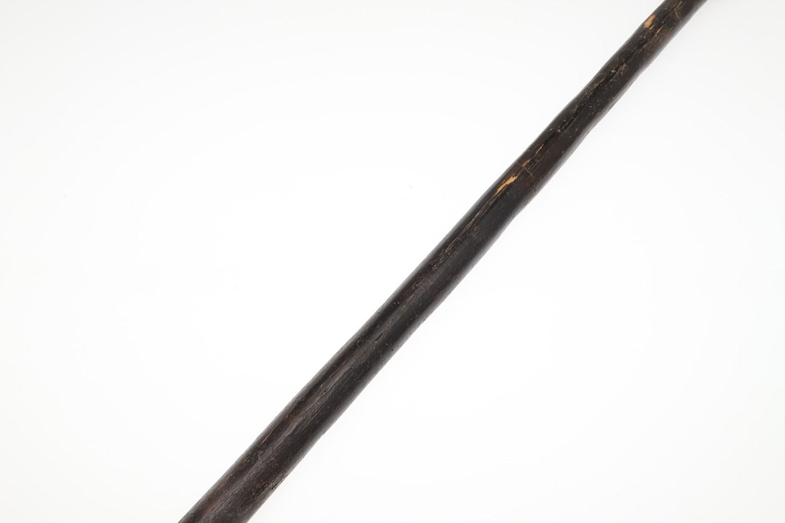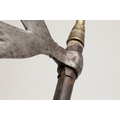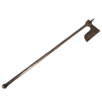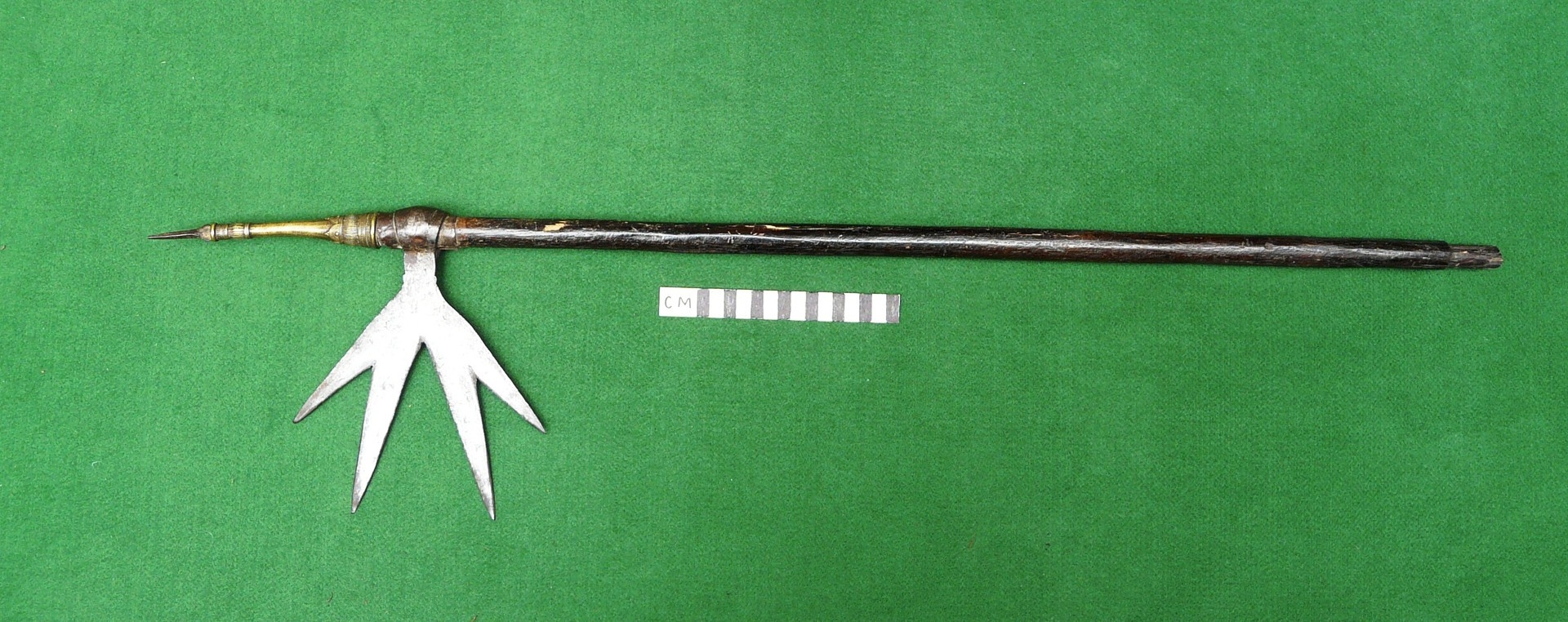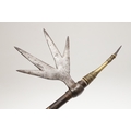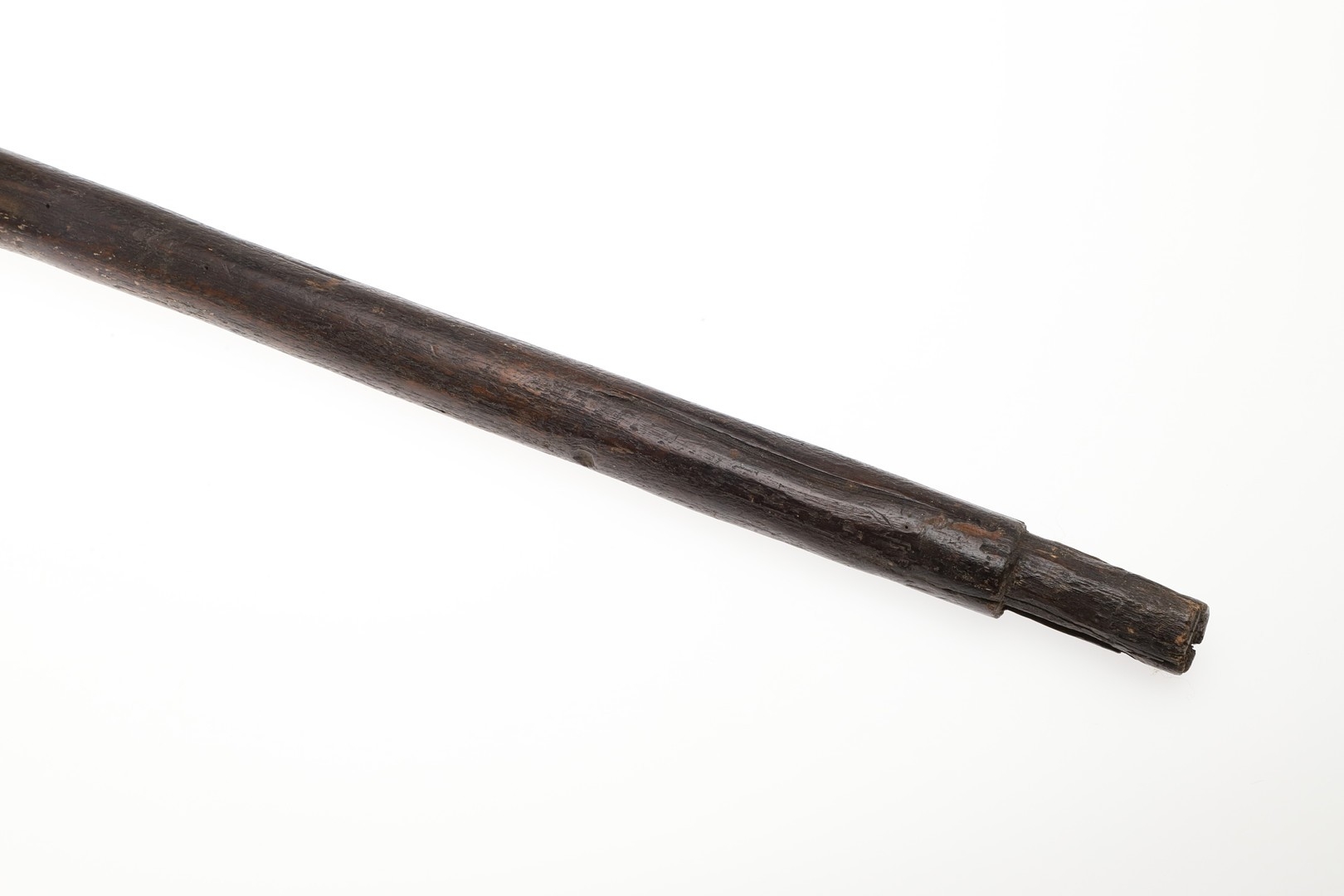 AN INDIAN KOND BULLOVA DAGGER AXE. An axe with a four pronged axe head. The blades 19 cm and similar. On a wooden shaft with brass mount and steel finial with offset point. 99 cm.