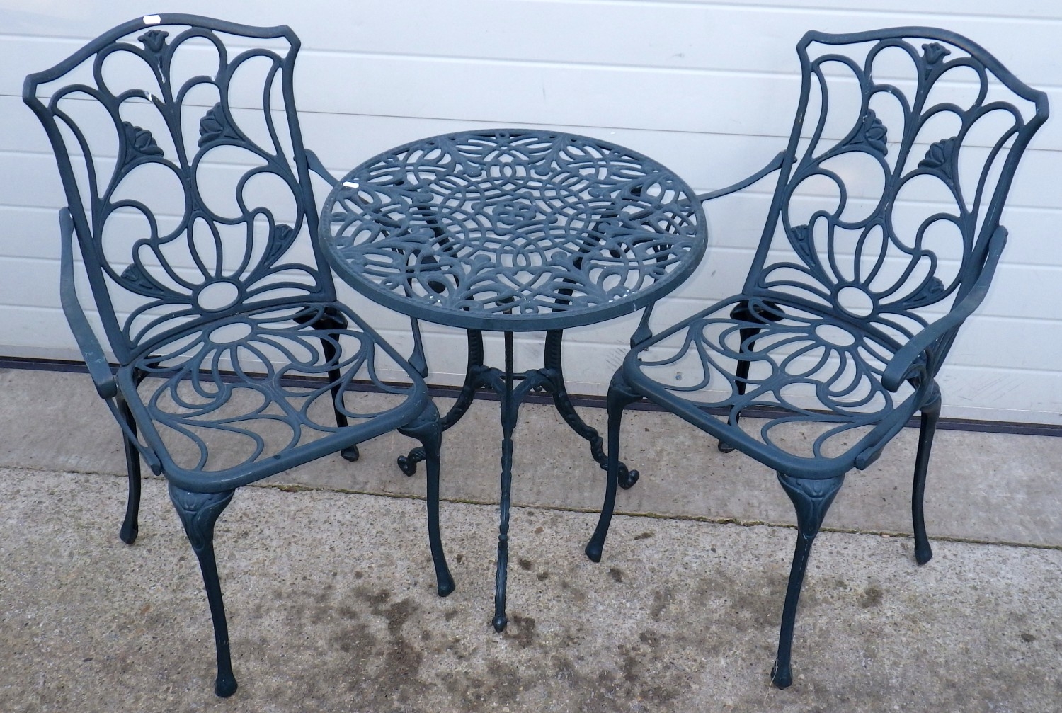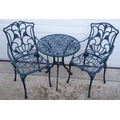 A green painted aluminium garden table, 61cm across, with pair of chairs (3)