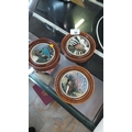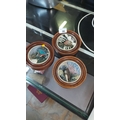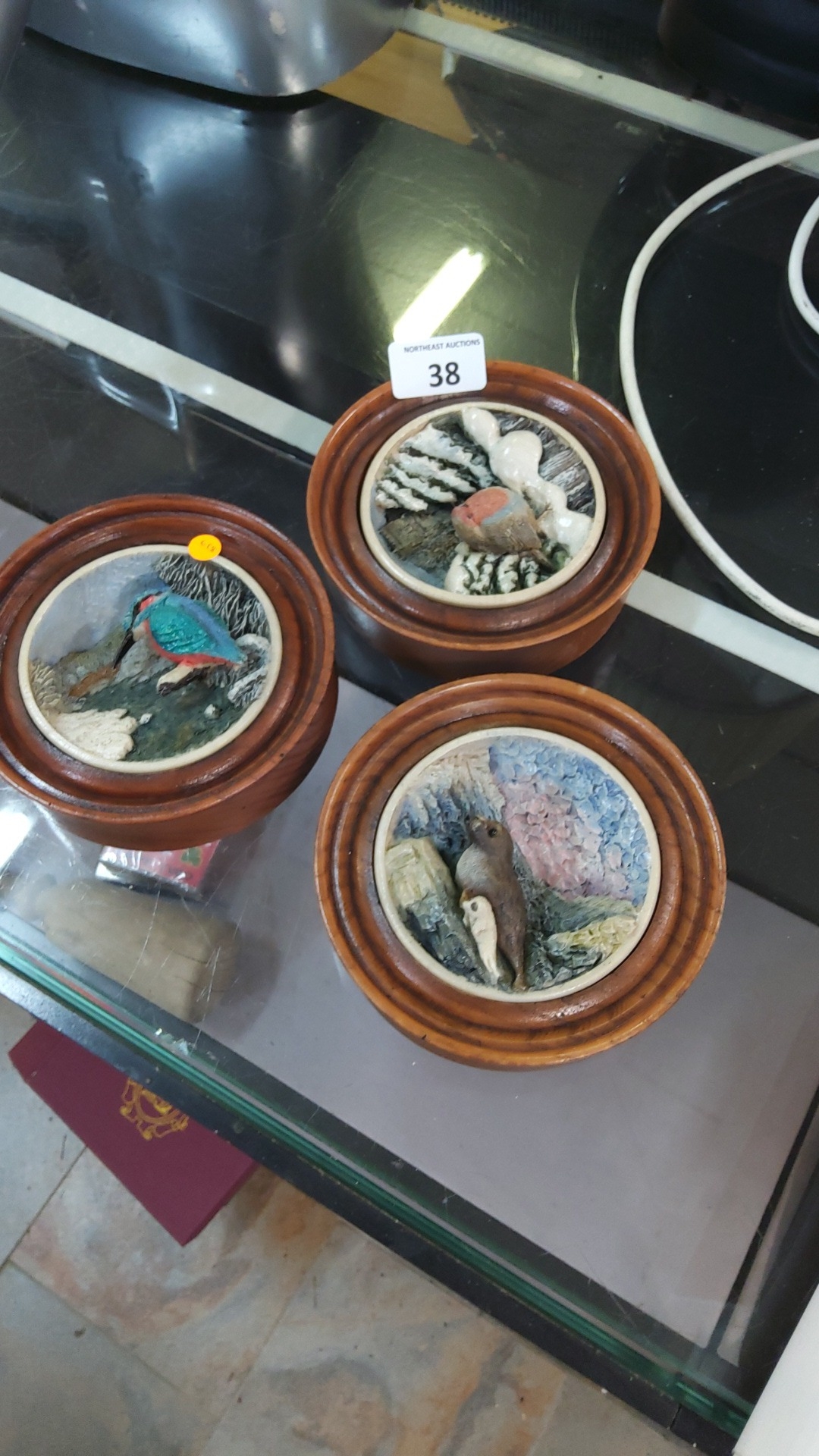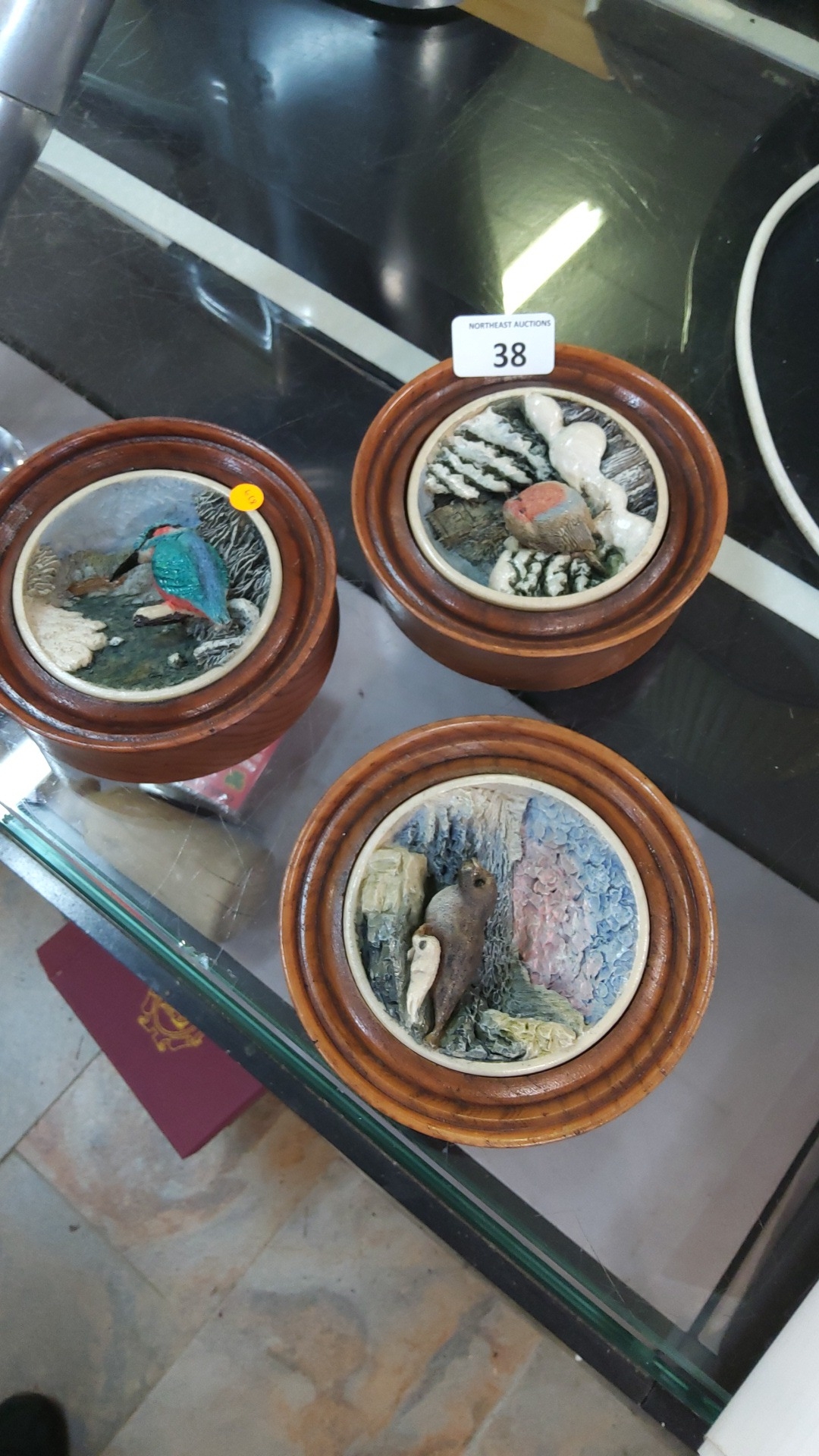 Set of three small turned wood circular reliefs,inset with hand-painted ceramic bas-relief panels depicting British birds amid naturalistic landscapes.