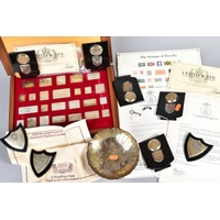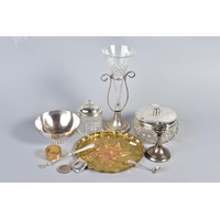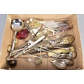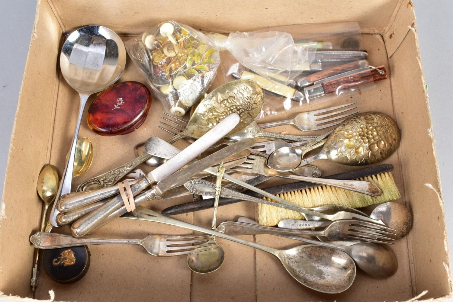 A SMALL QUANTITY OF COSTUME JEWELLERY, loose, stainless silver and plated cutlery, folding pen knives, coins, etc