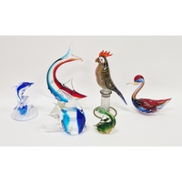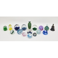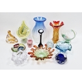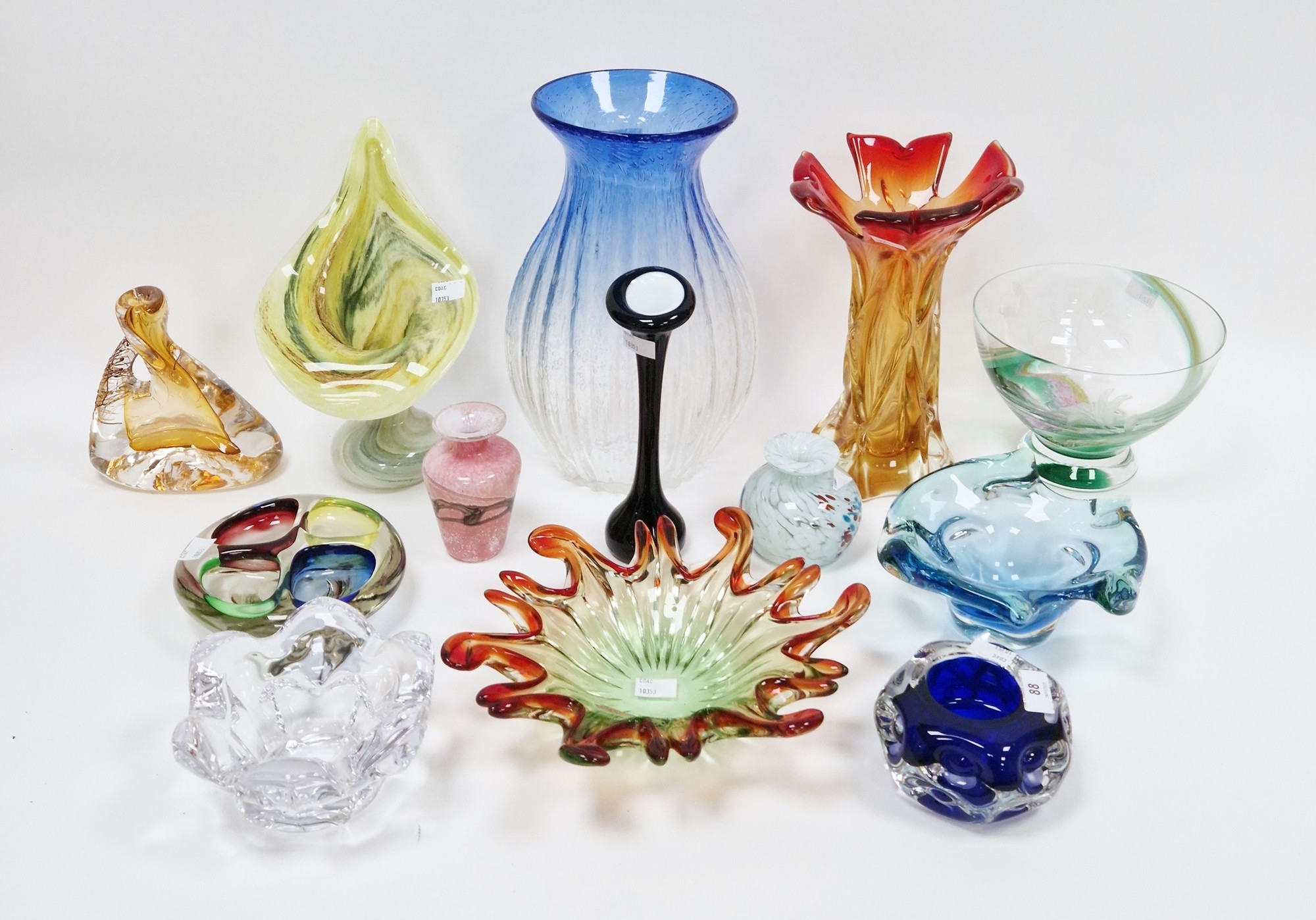 Quantity of art glass comprising a Murano glass bowl or organic form in green and red colourway, a Czech blue cased glass bowl, possibly by Joseph Hospodka for Chribska, a blue and clear glass vase of flattened baluster form with controlled bubble decoration, height 31cm, a Murano-style cased vase of organic form in red and yellow colourway, height 26cm, an Alum Bay jack-in-the-pulpit glass vase in mottled yellow and green colourway, a blue cased and dimpled glass bowl by Liskeard, a Mdina pink glass vase and others (13)