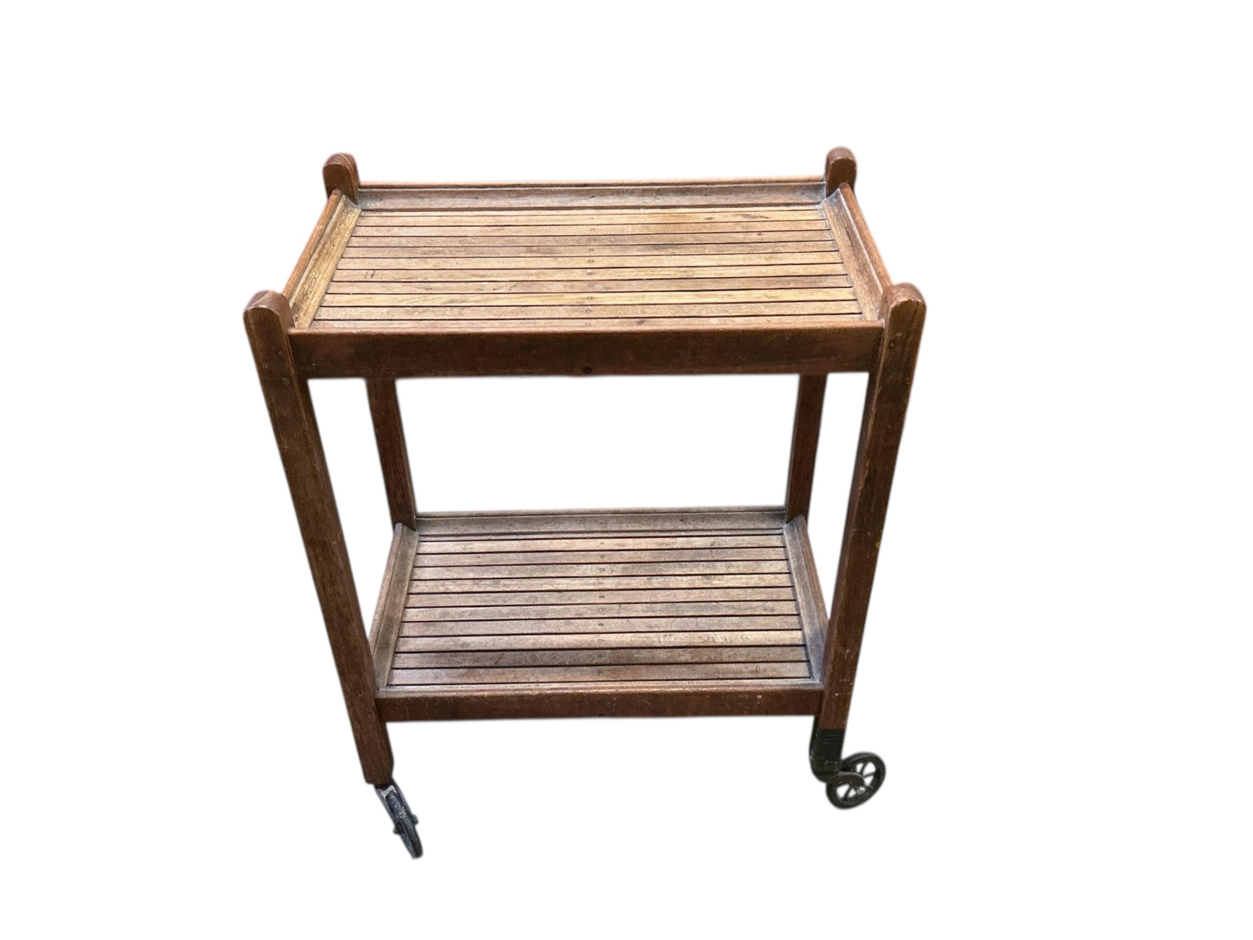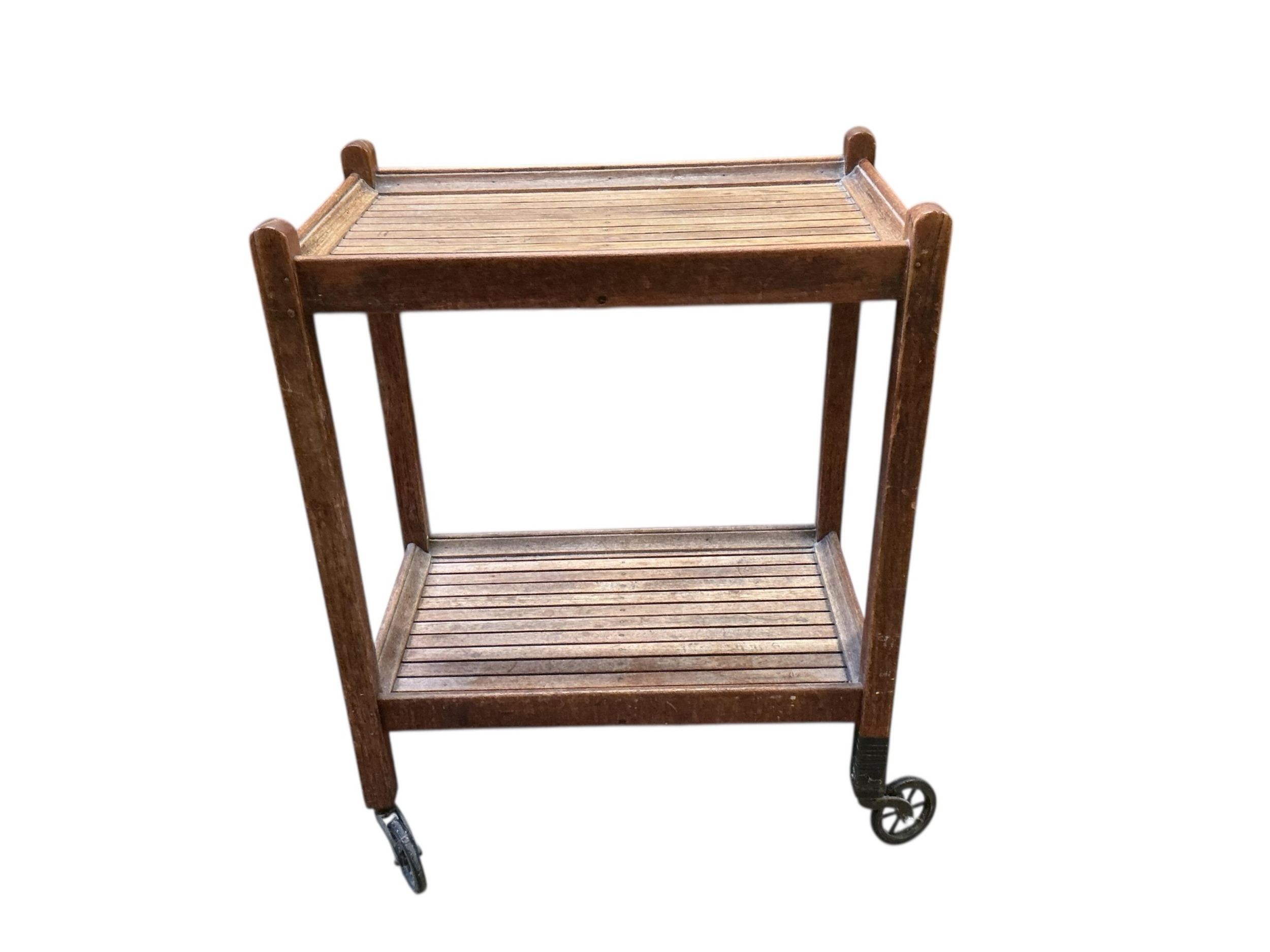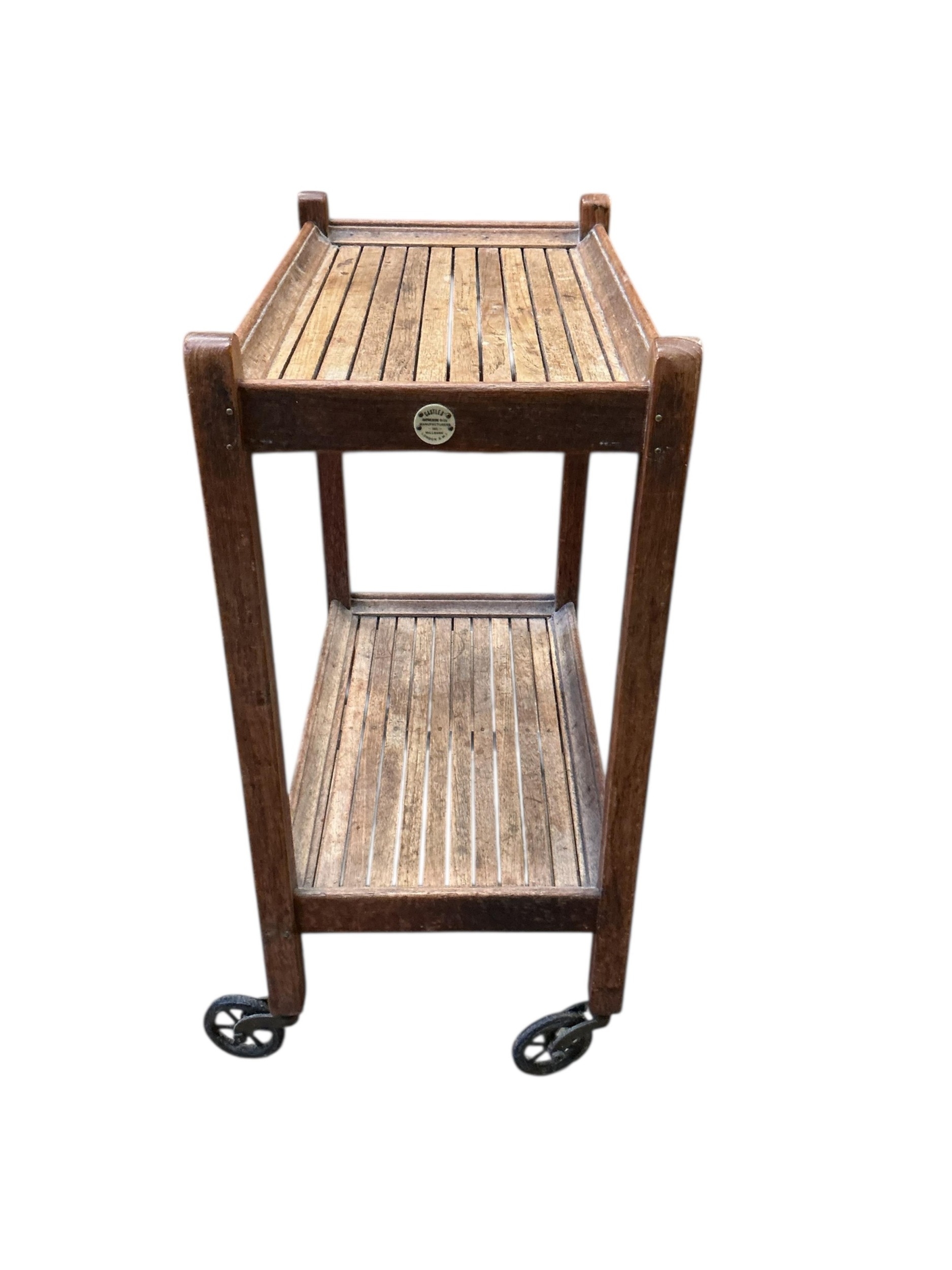 An early 20th century oak two tier trolley by Castles, London, width 55cm, depth 39cm, height 84cm
