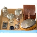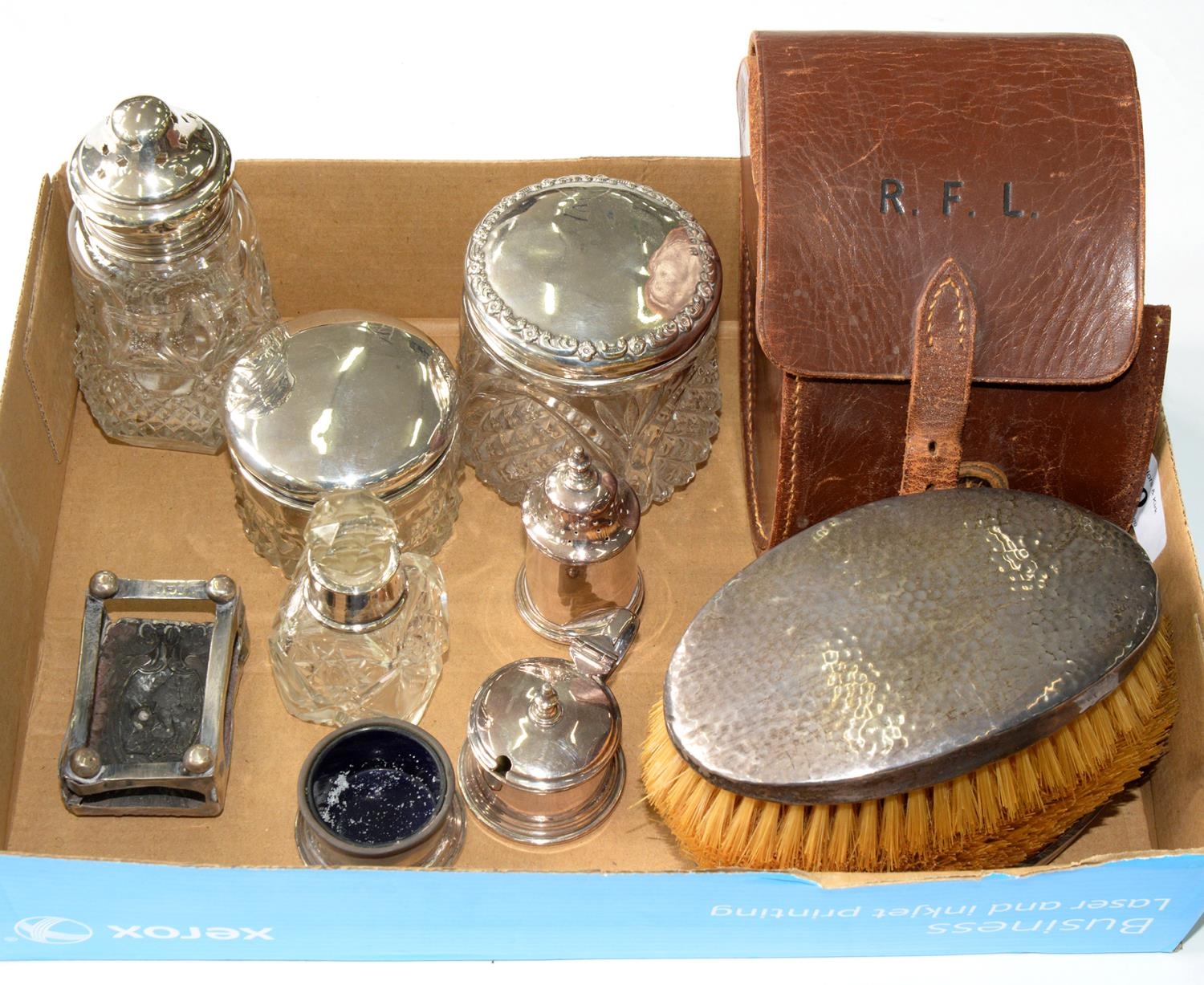 A PAIR OF GEORGE V SILVER GENTLEMEN'S HAIR BRUSHES WITH DIMPLED BACK, BY HORTON & ALLDAY, BIRMINGHAM 1927 AND OTHER SILVER ARTICLES, TO INCLUDE A CUT GLASS CASTER WITH SILVER CAP, SEVERAL GLASS JARS AND BOTTLES EACH WITH SILVER LID, MATCHBOX SLIDE, MUSTARD POT AND SALT CELLAR
