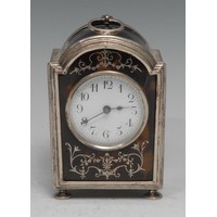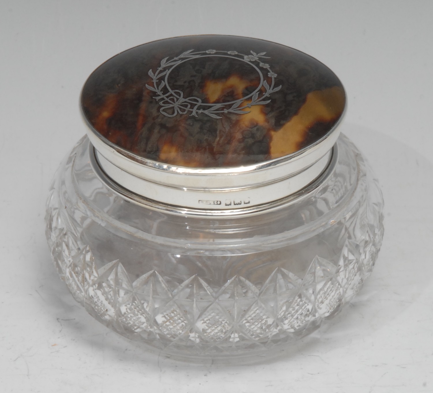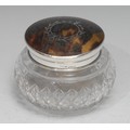 A George V silver, tortoisehell and pique mounted bowed circular cut glass powder bowl, push-fitting ciover inlaid with a ribbon-tied wreath, star-cut base, 10.5cm diam, Birmingham 1929