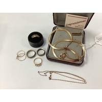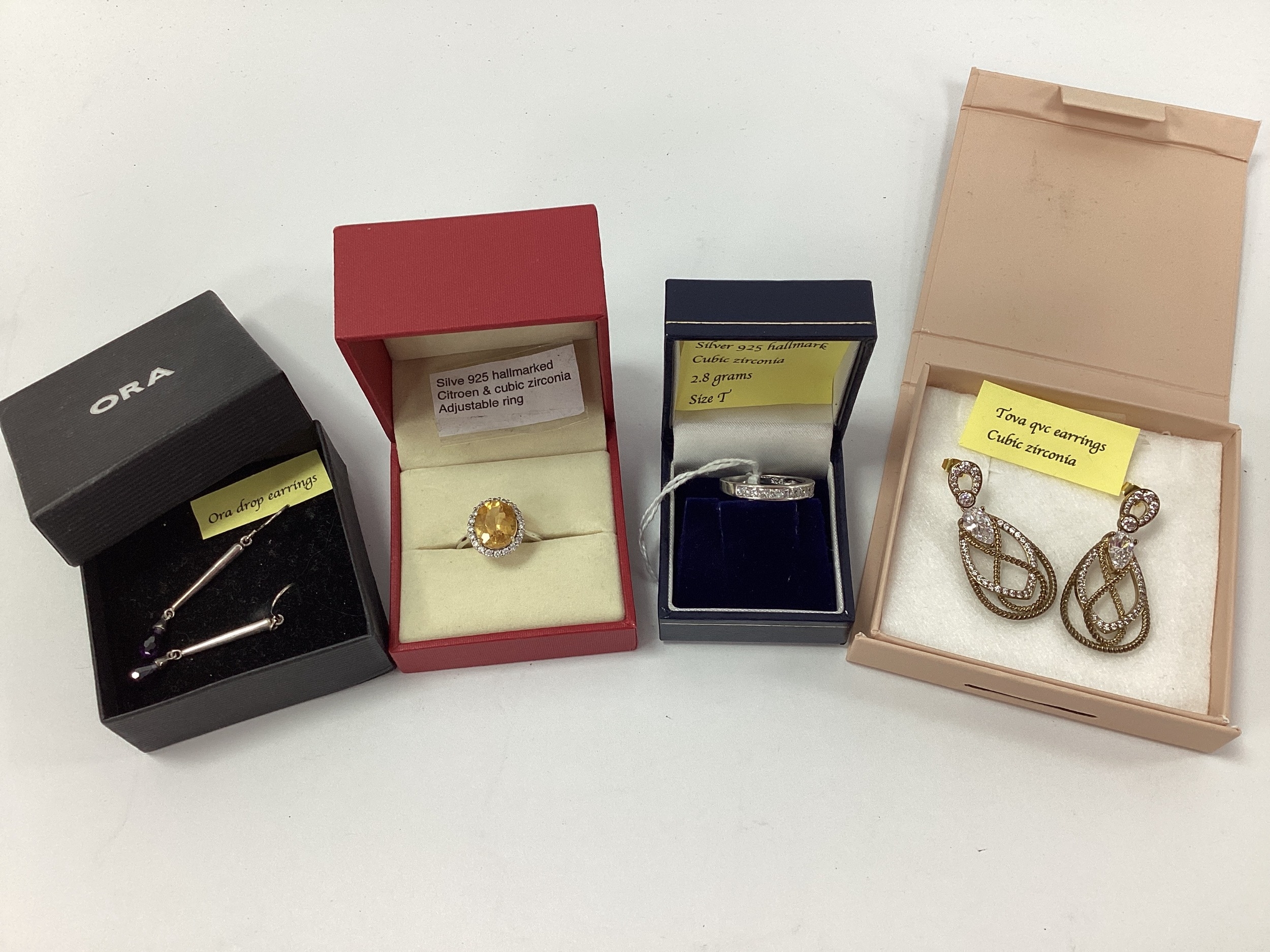 Modern QVC TOVA CZ Drop Earrings, of openwork design, gilt; together with a modern 925 cluster dress ring, a 925 CZ half eternity style ring and a pair of modern ORA (Sheffield) drop earrings.