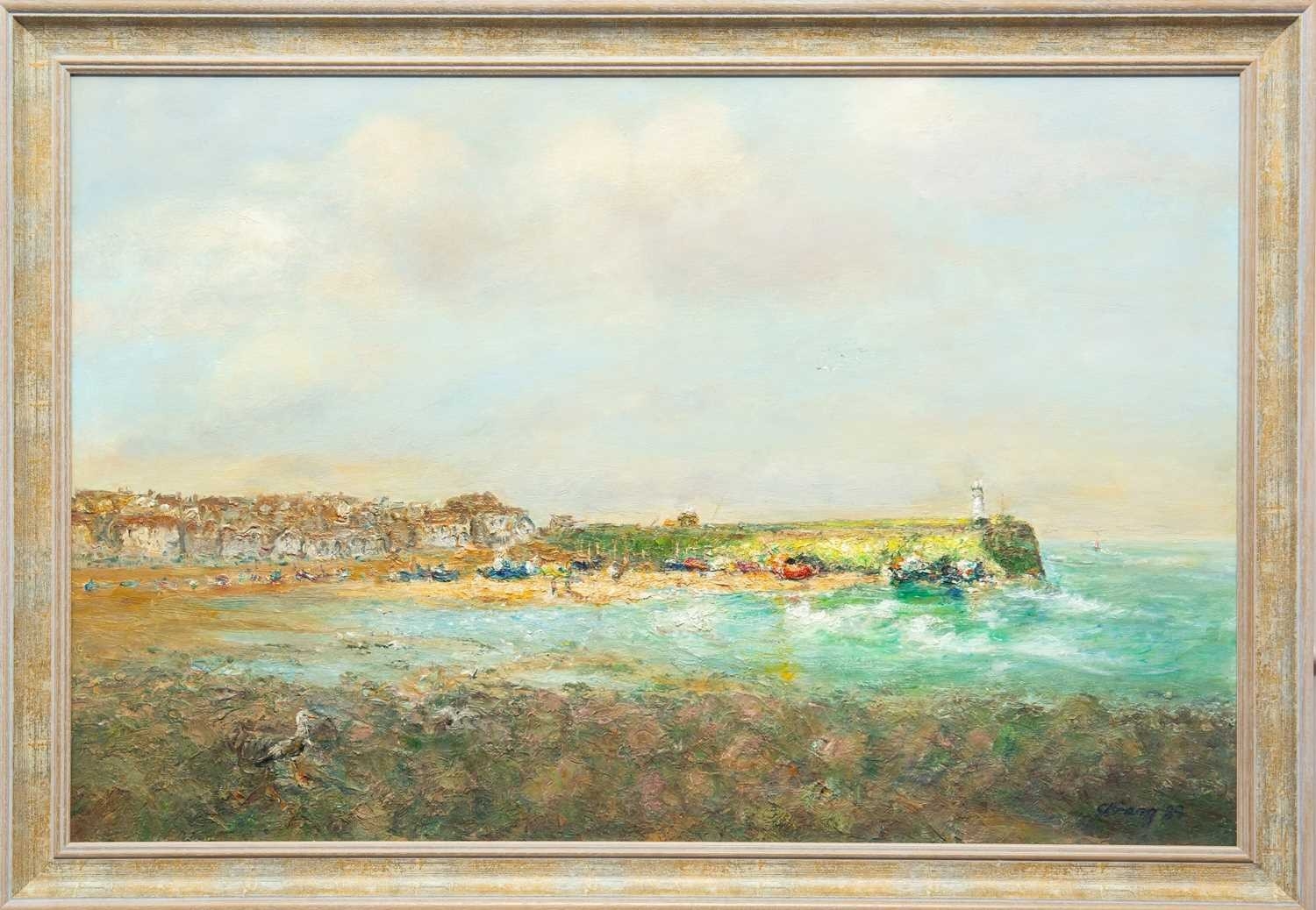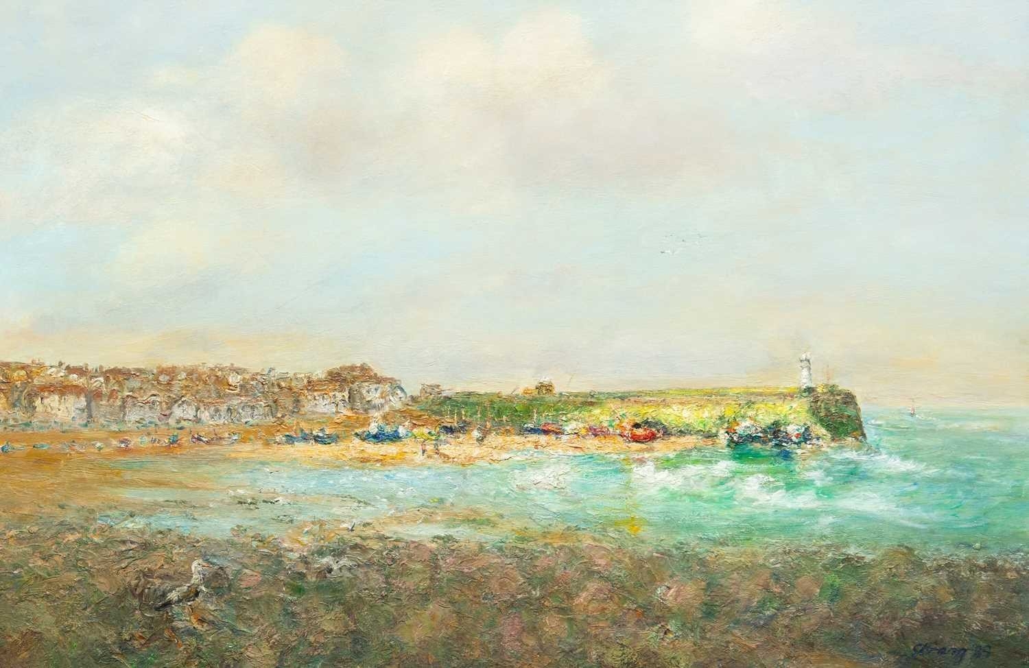 § Michael J. STRANG (1942-2021) Smeaton's Pier, St Ives (1989) Oil on board, signed and dated '89, 59 x 89cm, 70 x 100cm framed.