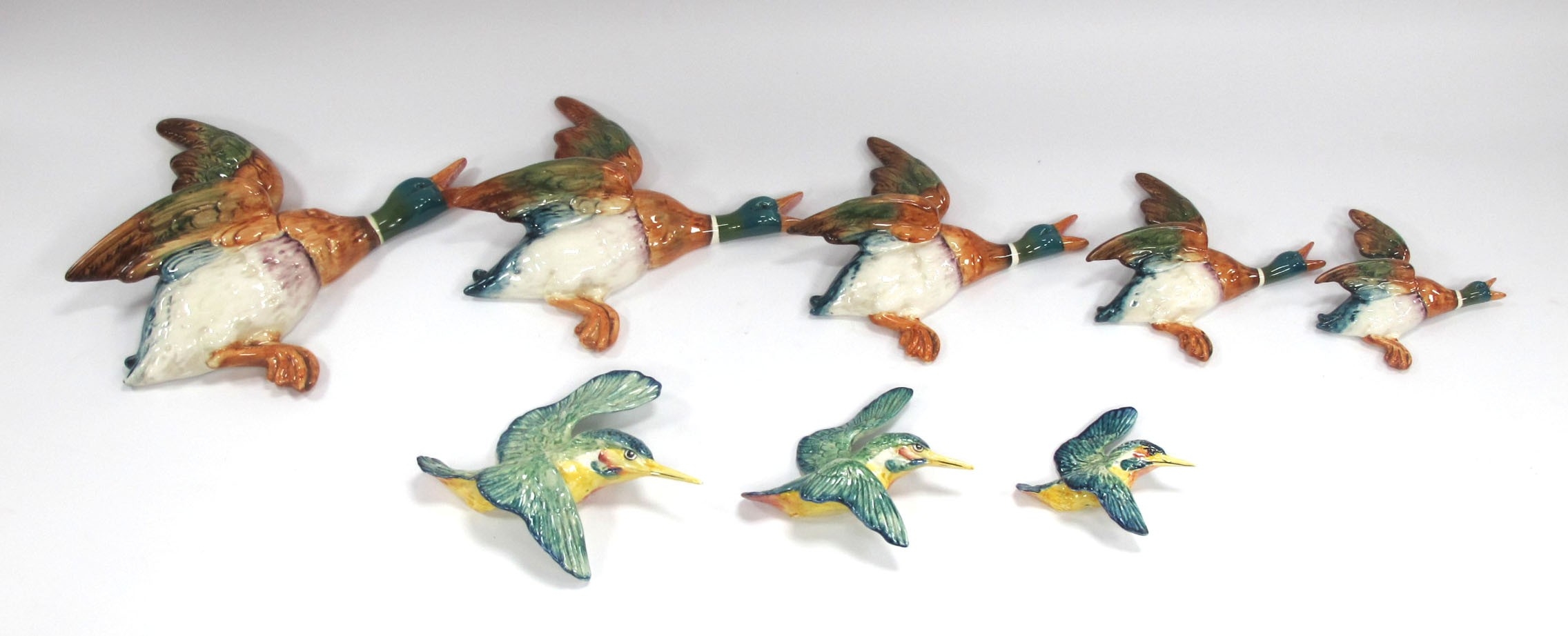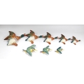 Three Graduated Beswick Wall Hanging Kingfishers, model number 729, printed and impressed marks, 12-20cm and a set of five graduated Beswick wall hanging ducks. (8)