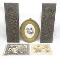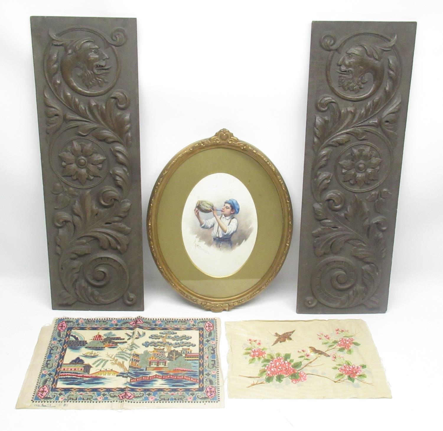 C20th oval gilt framed signed watercolour of a young boy drinking wine, 41cm x 32cm, silk picture of oriental design 27cm x 39cm and another of 2 birds on a blossom 24cm x 34.5cm and 2 wood carvings 63cm x 20cm (5)