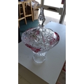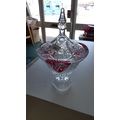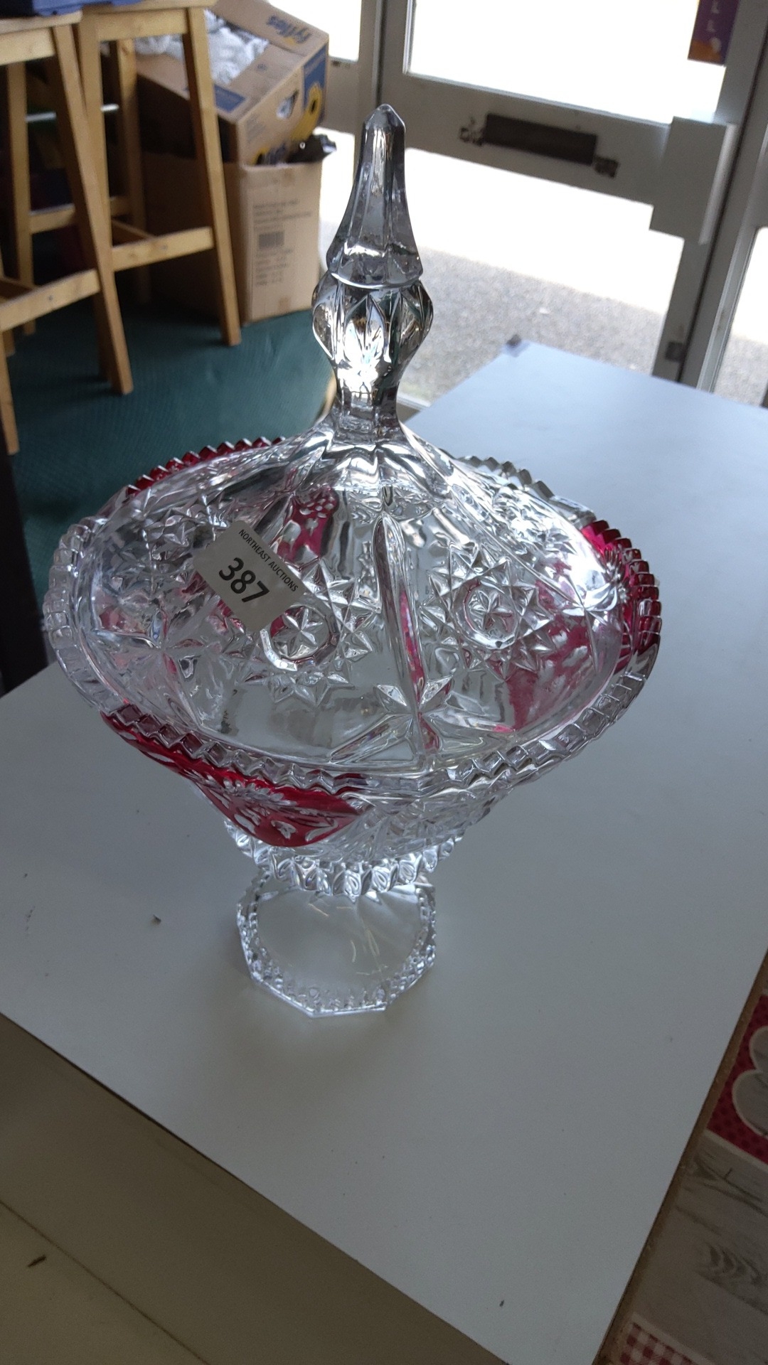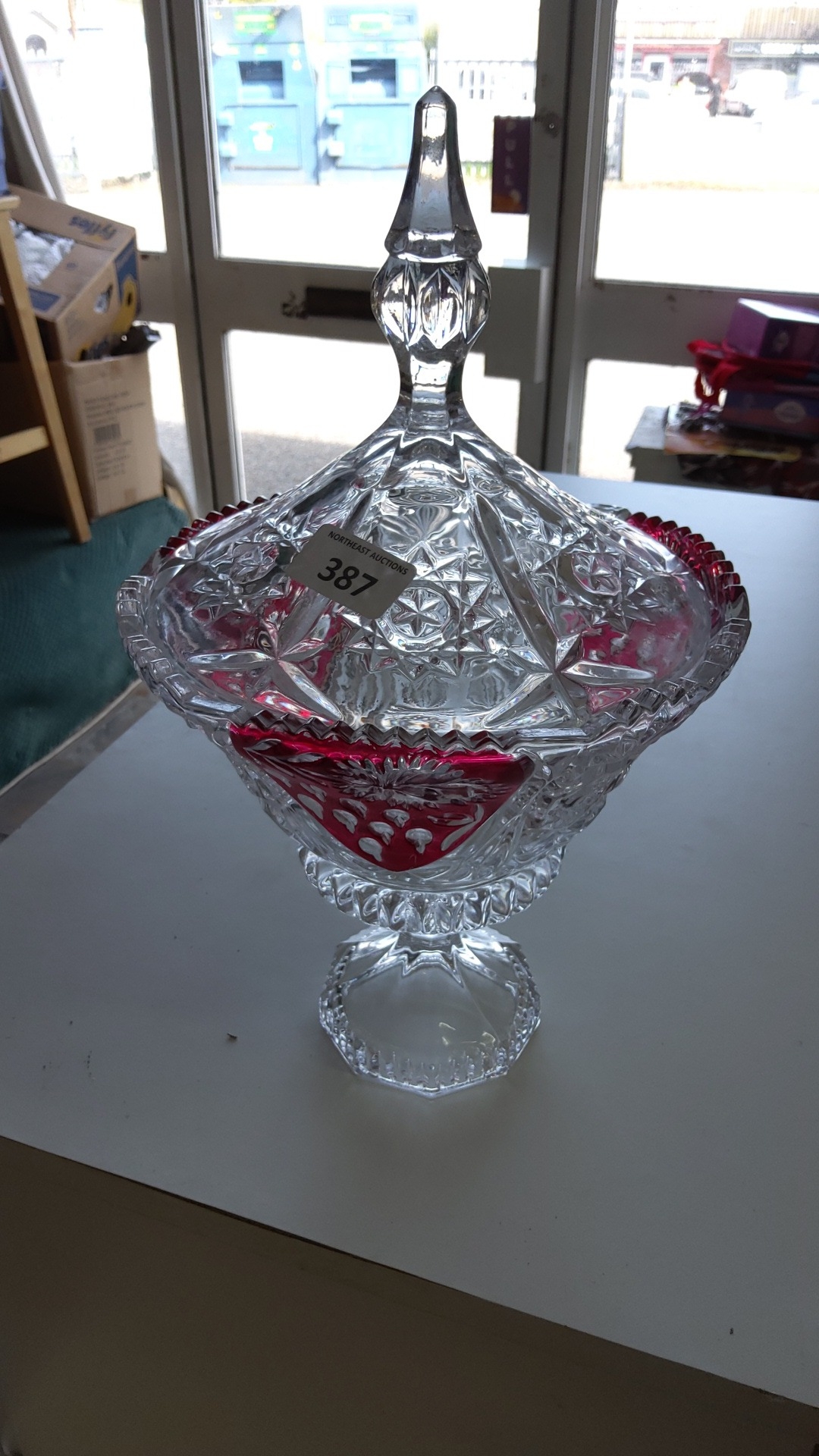 Footed pressed-glass lidded bonbonnière, the domed cover with starburst and diamond-cut motifs and a faceted finial; the bowl with banded ruby-stained panels and scalloped rim, on a stepped pedestal foot.
