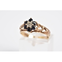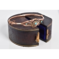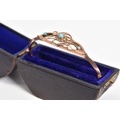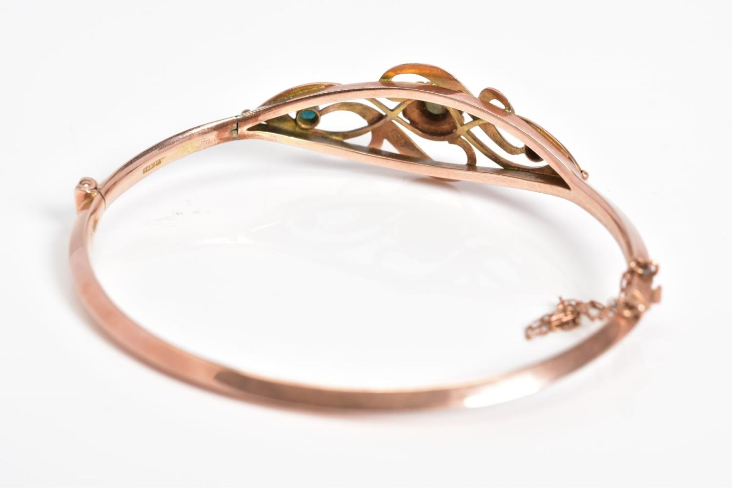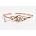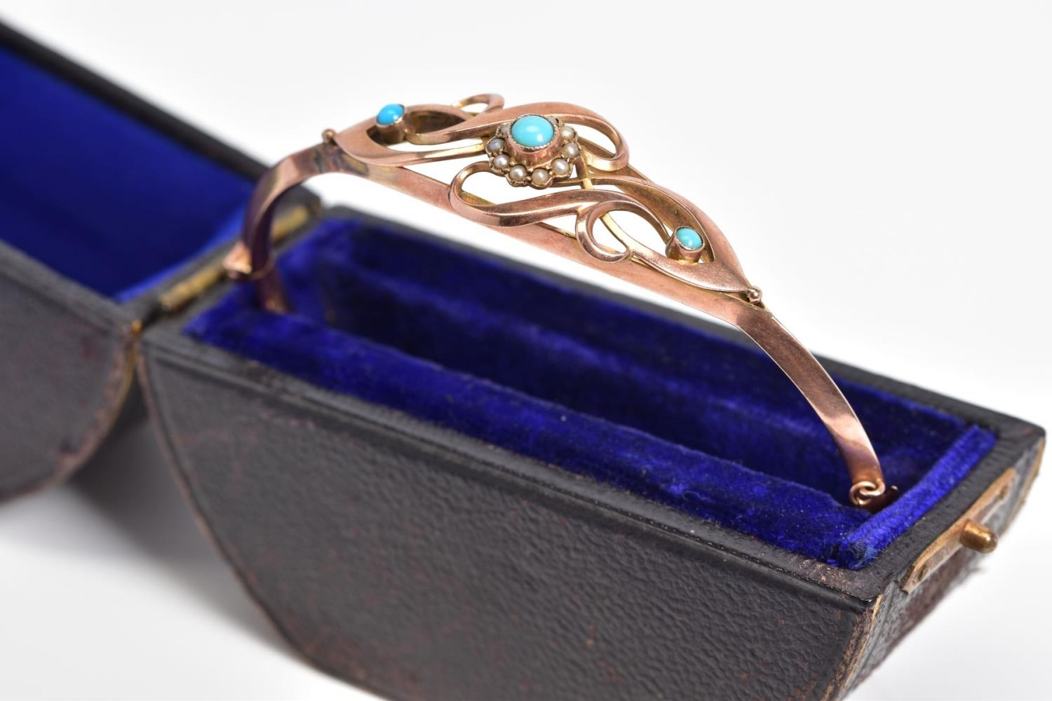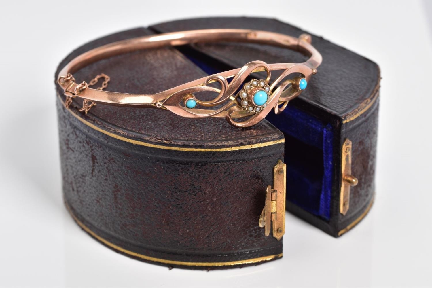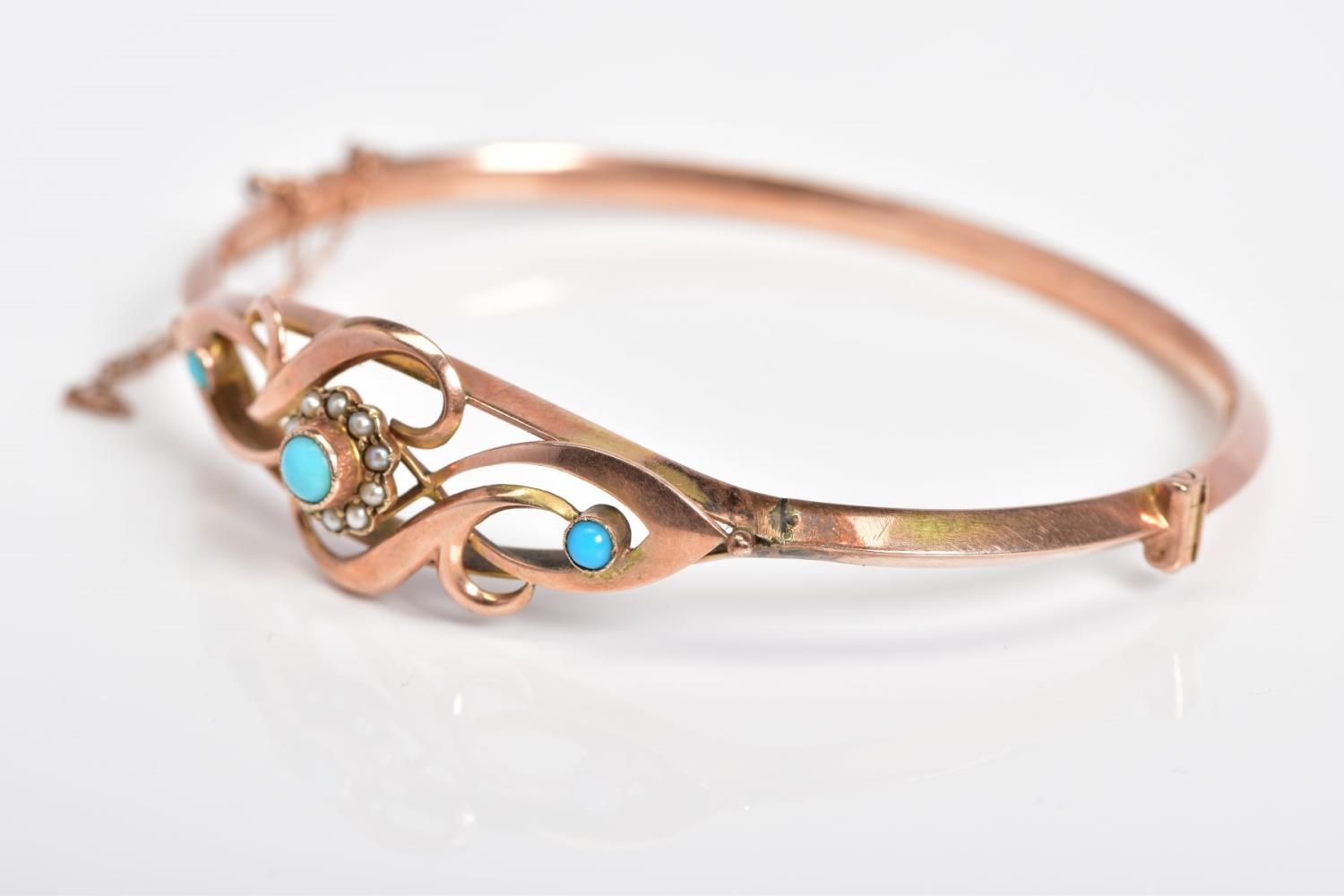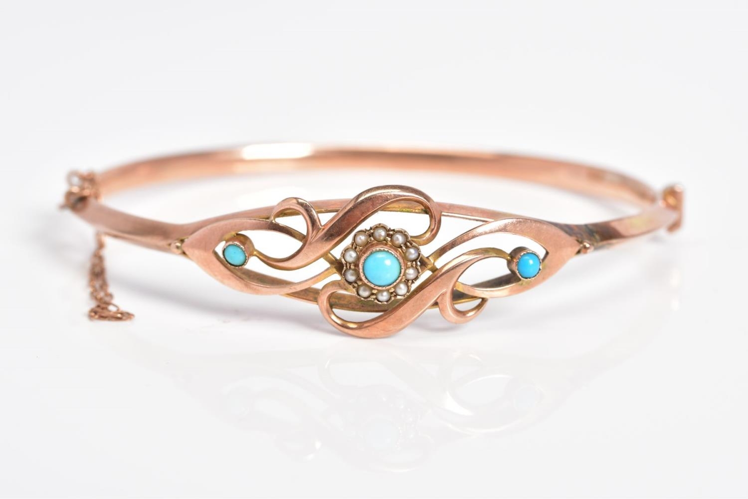 A 9CT ROSE GOLD EDWARDIAN BANGLE, the hinged bangle with an openwork scroll design front, central raised flower set with circular cabochon turquoise and split pearl surround flanked with two further turquoise, with a push pin clasp and safety chain, Birmingham hallmark, approximate diameter 62mm, approximate weight 7.2 grams, accompanied with box (condition: signs of re-soldering to one side)