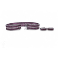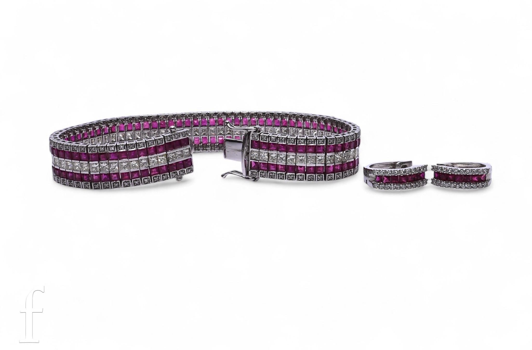 A ruby and diamond line bracelet, set with an articulated row of princess-cut diamonds between step-cut rubies, to outer row of circular-cut diamonds, integral clasp, marked '18K', total weight 28.4g, 17.3cm, and a pair of ruby and diamond earrings of hoop design, set with a central row of step-cut rubies, between brilliant-cut diamonds, marked '750', total weight 5.7g.