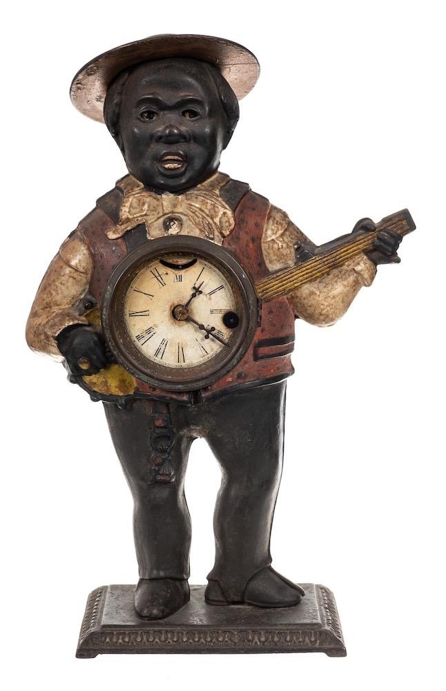 A Victorian American Blinking Eye automata clock: the cast iron case depicting a banjo player in typical dress with the lever escapement to the movement providing the up-and-down motion of the eyes, the paper dial with black Roman numerals and spade hands, attributed to Bradley and Hubbard, Meriden, Connecticut, height 41cm.