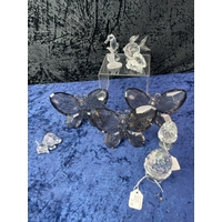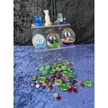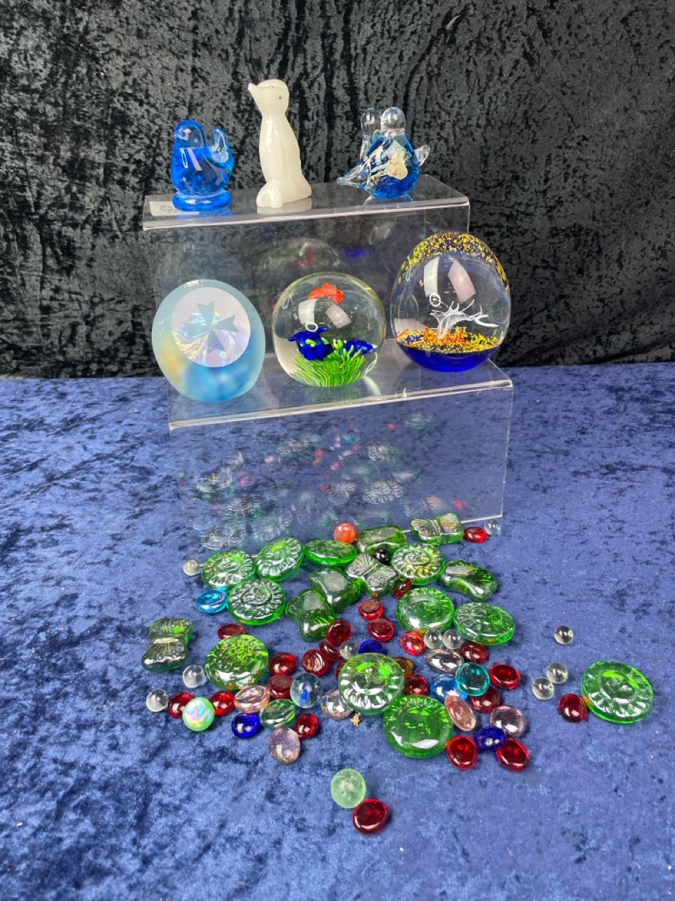 Three globular glass paperweights, two bird glass paperweights, a carved stone bird and selection of glass pebbles