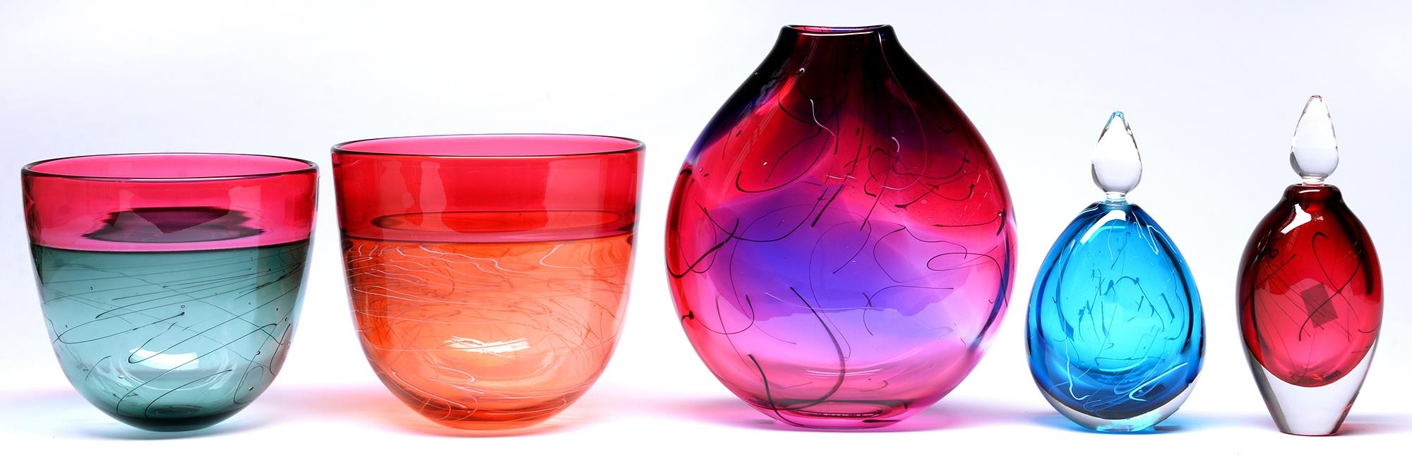 Studio glass. Stuart Akroyd. Vase, bowls and bottles, five, cased glass with abstract trails, vase 21cm h, all signed
