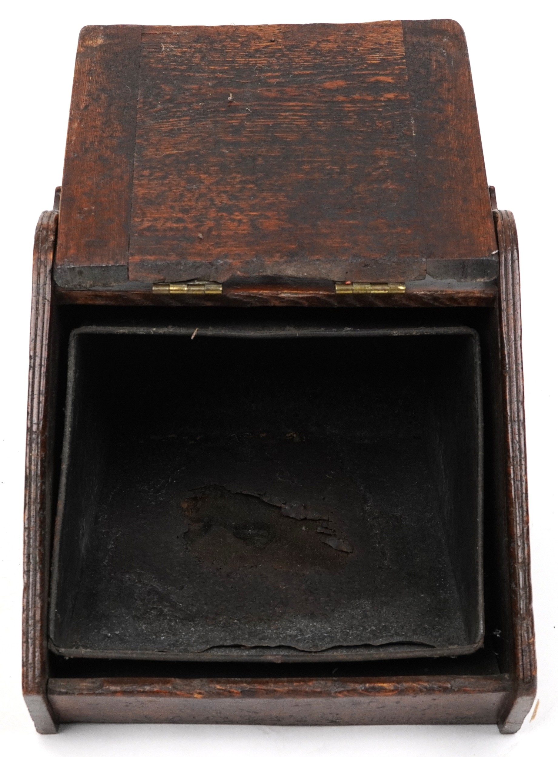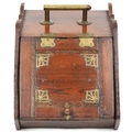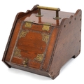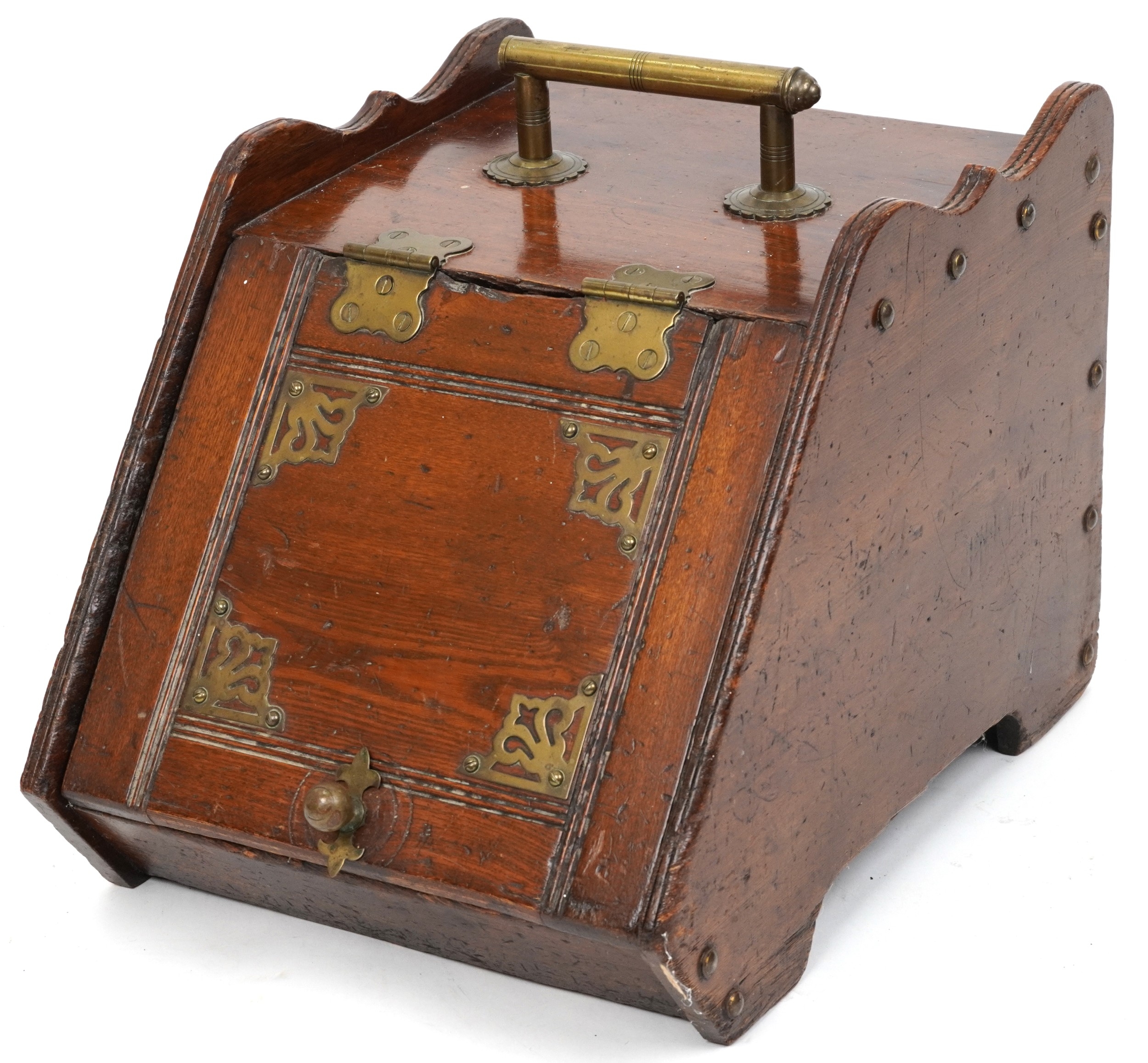A late Victorian aesthetic movement oak coal scuttle with applied brass hinges and carrying handle, 36cm H x 33cm W x 45cm D.