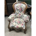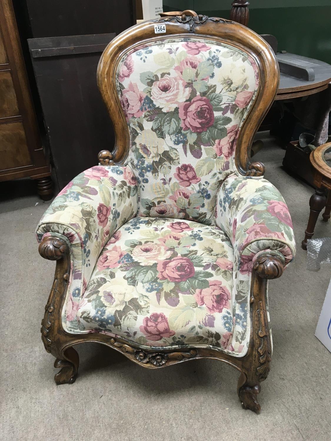 A Victorian walnut arm chair with carved scroll supports.- NO RESERVE