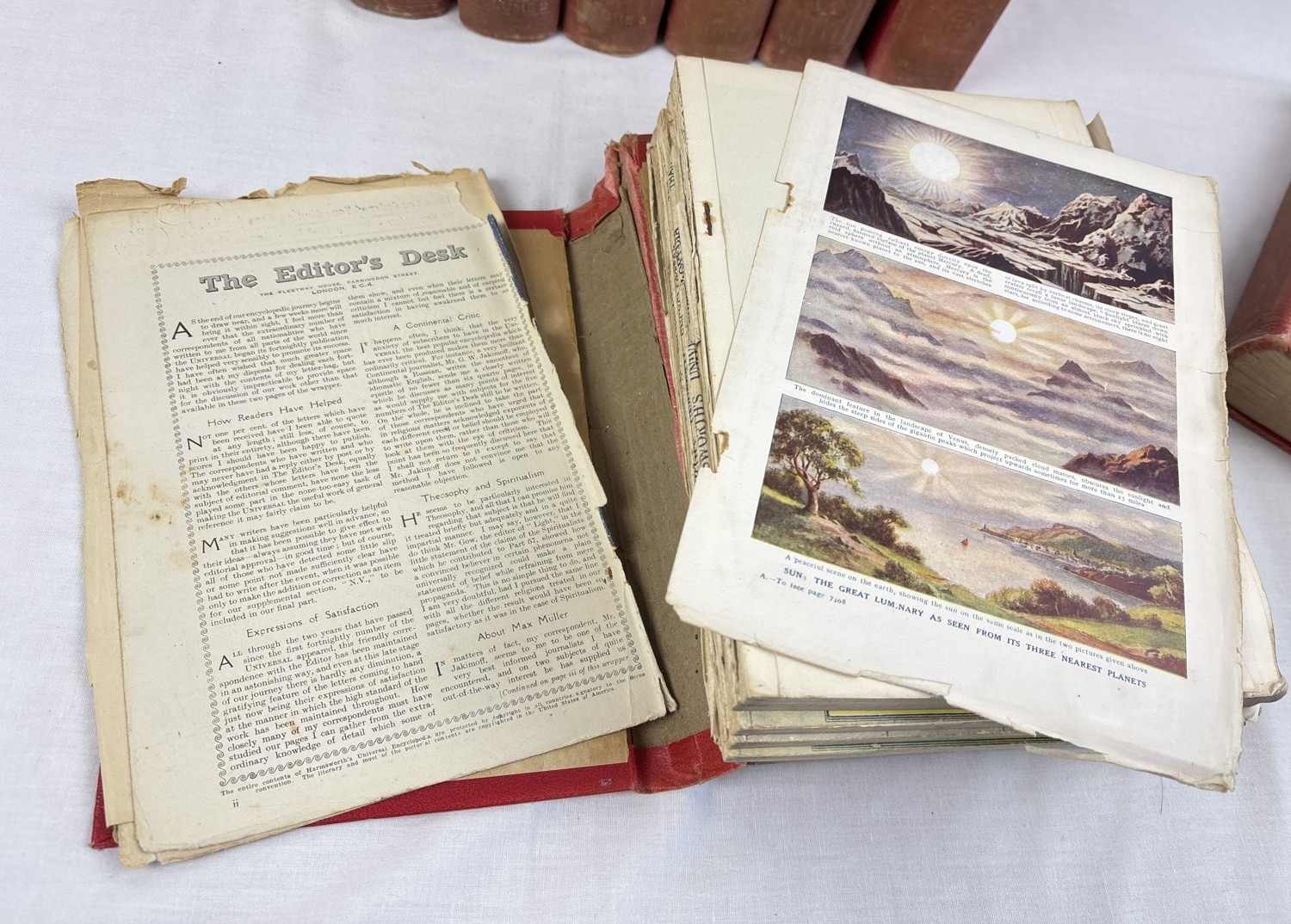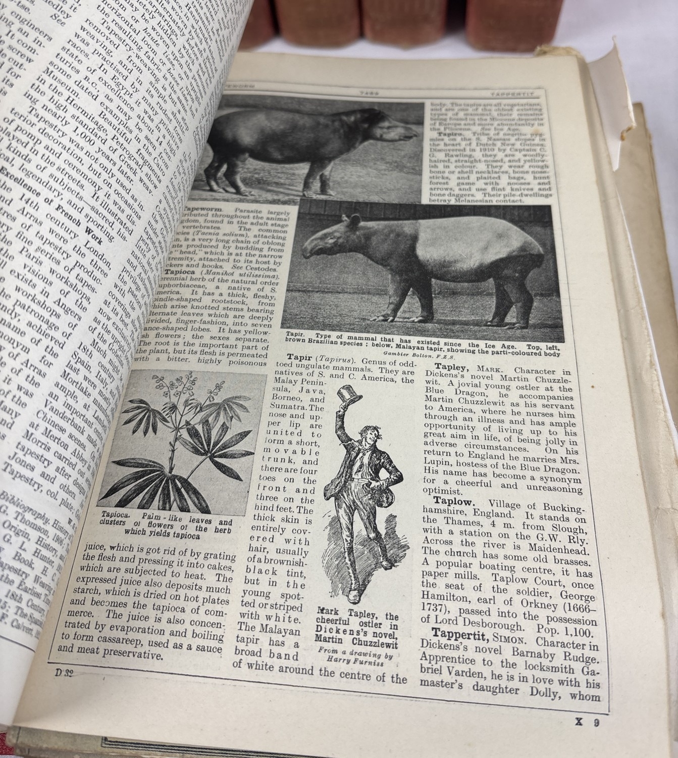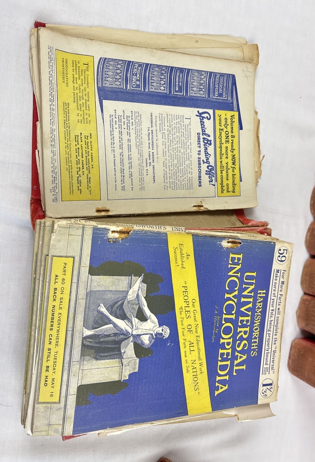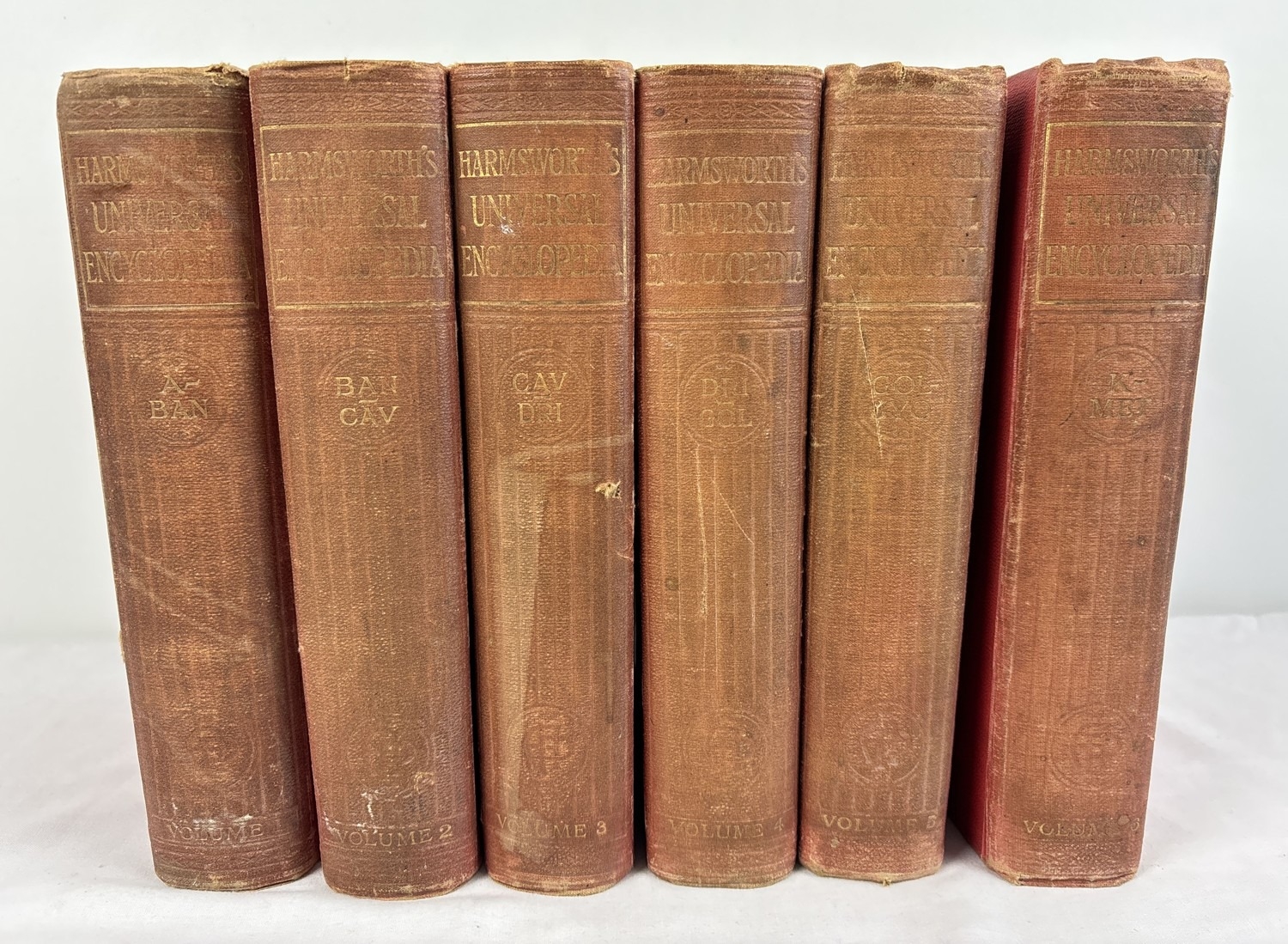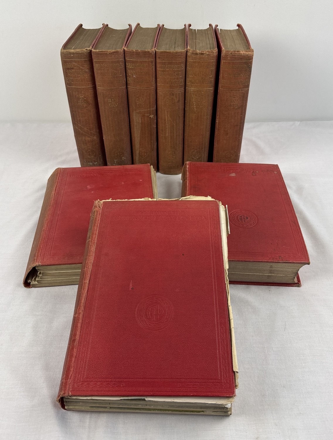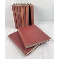 A set of 9 Harmsworth 1920's Universal Encyclopaedias, edited by J.A. Hammerton. All volumes are bound in red cloth with embossed name and details to spines. Volumes 1-4 monogrammed with gilt initials to front "L.P.F". With 20,000 colour and black & white illustrations throughout the volumes.