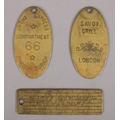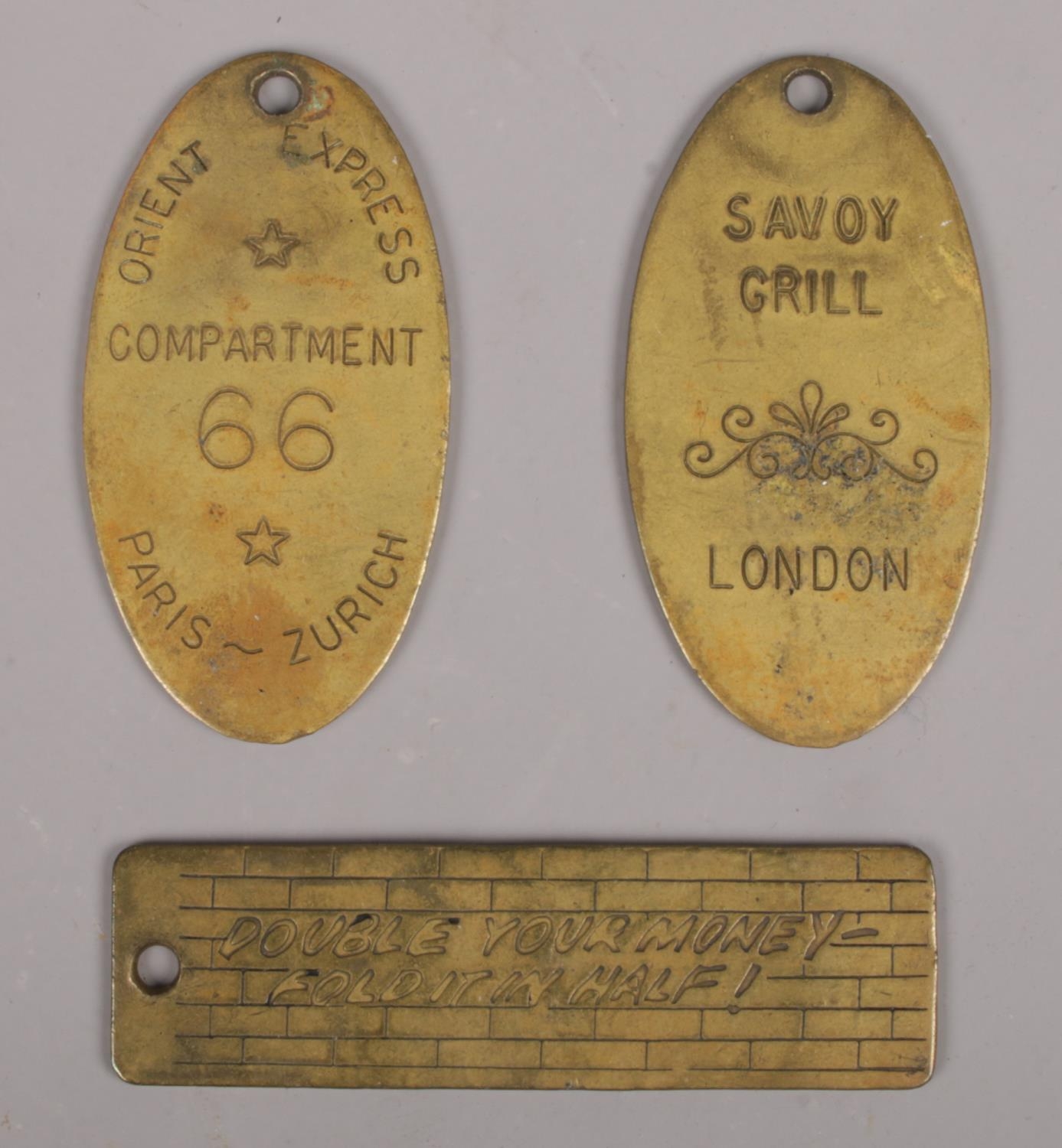 Three vintage brass key fobs to include Savoy Grill London, Orient Express Compartment 66 Paris-Zurich examples, both inscribed Luwell Sigmund 1976 to the reverse.