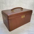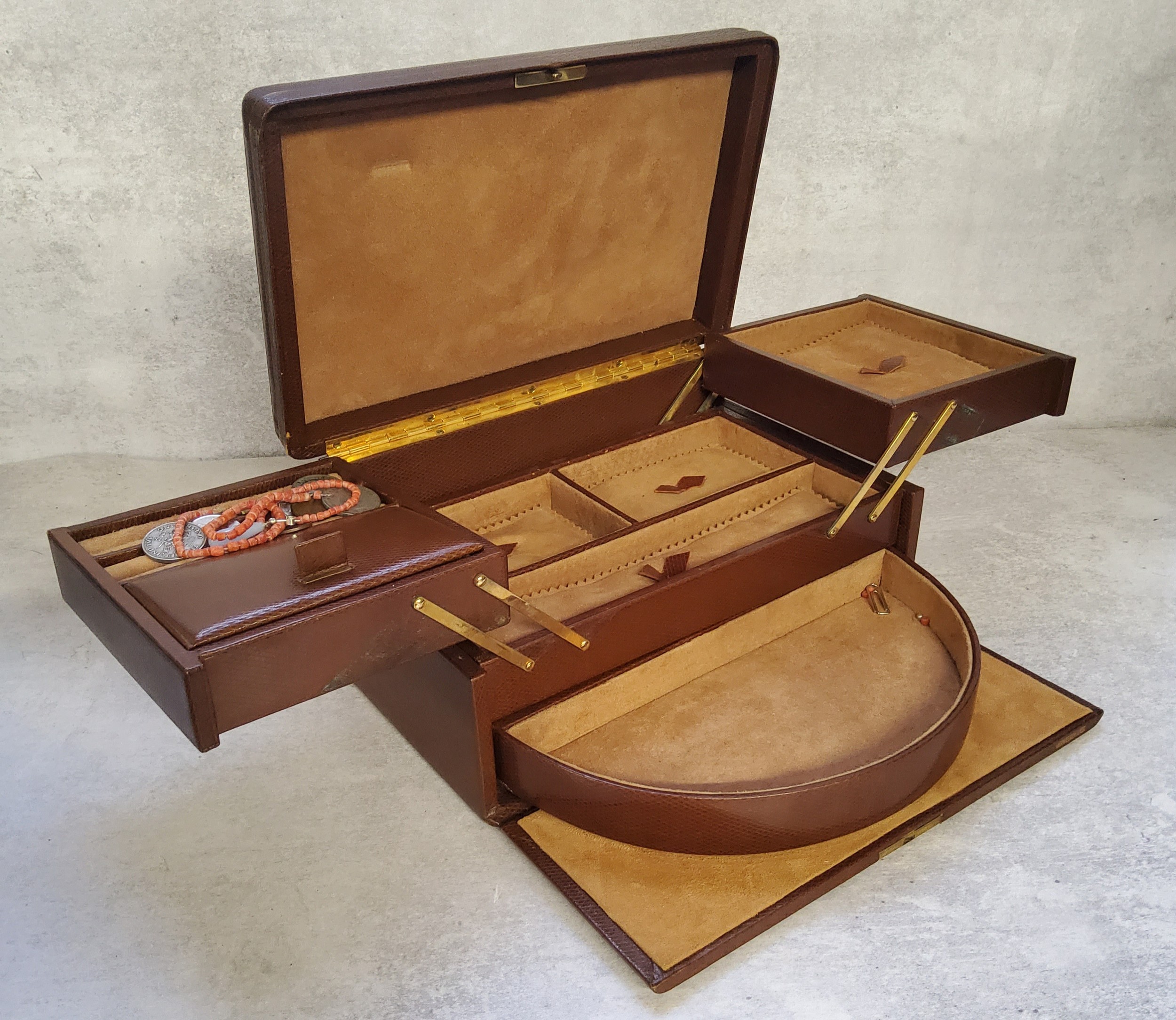 A Morrocan brown leather travel jewellery case, suede lined, fitted interior