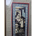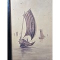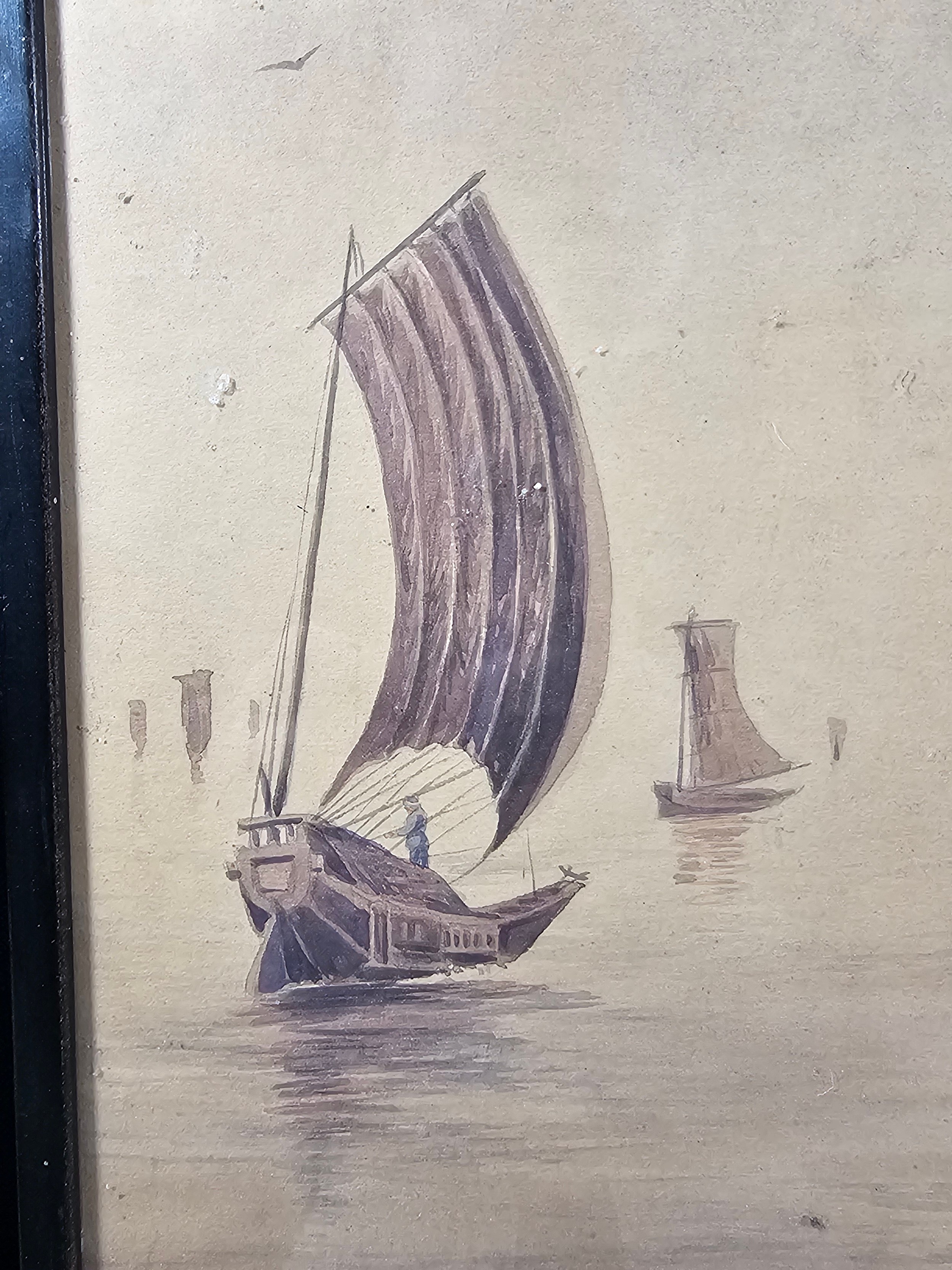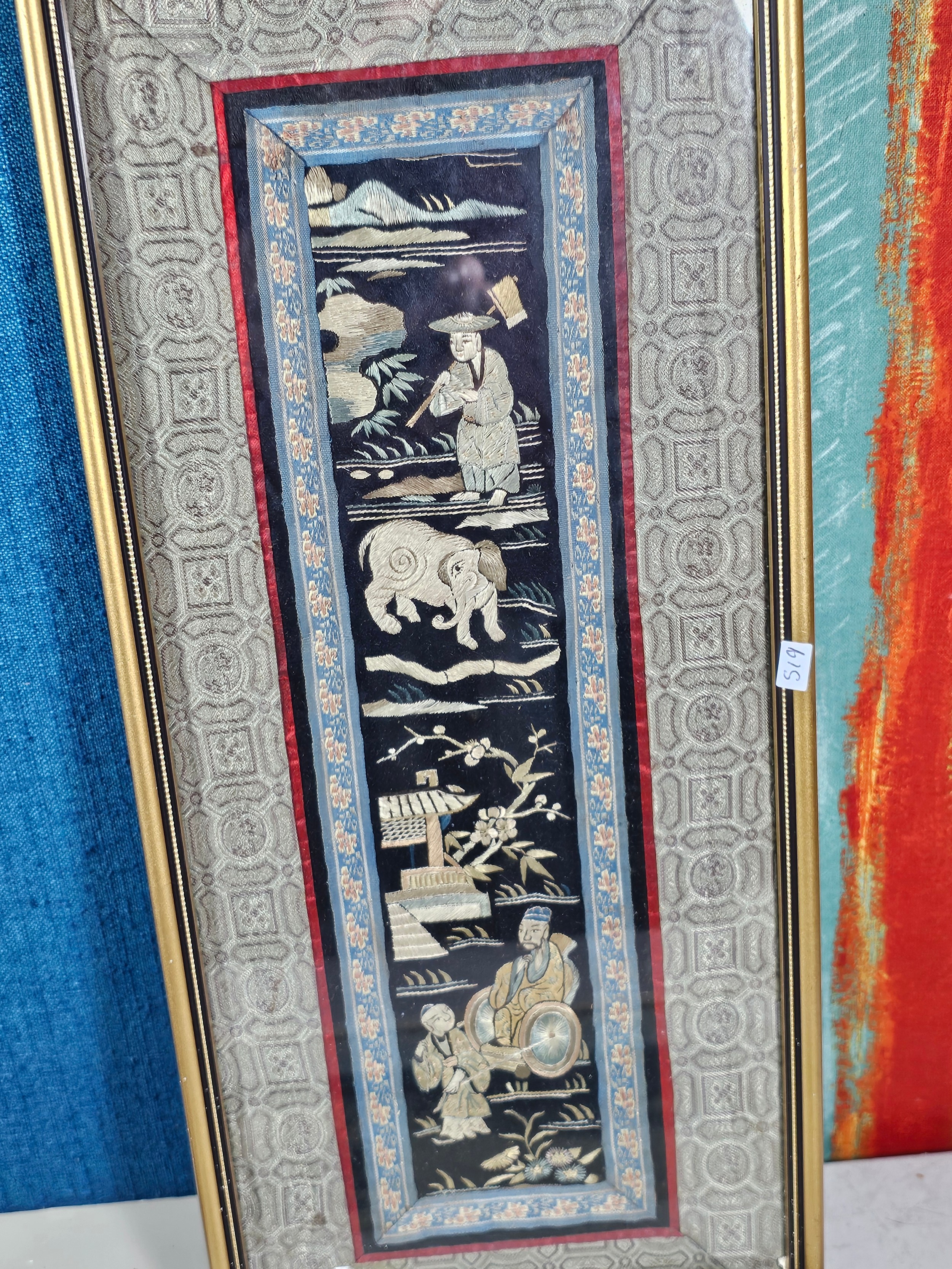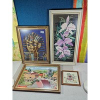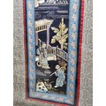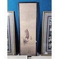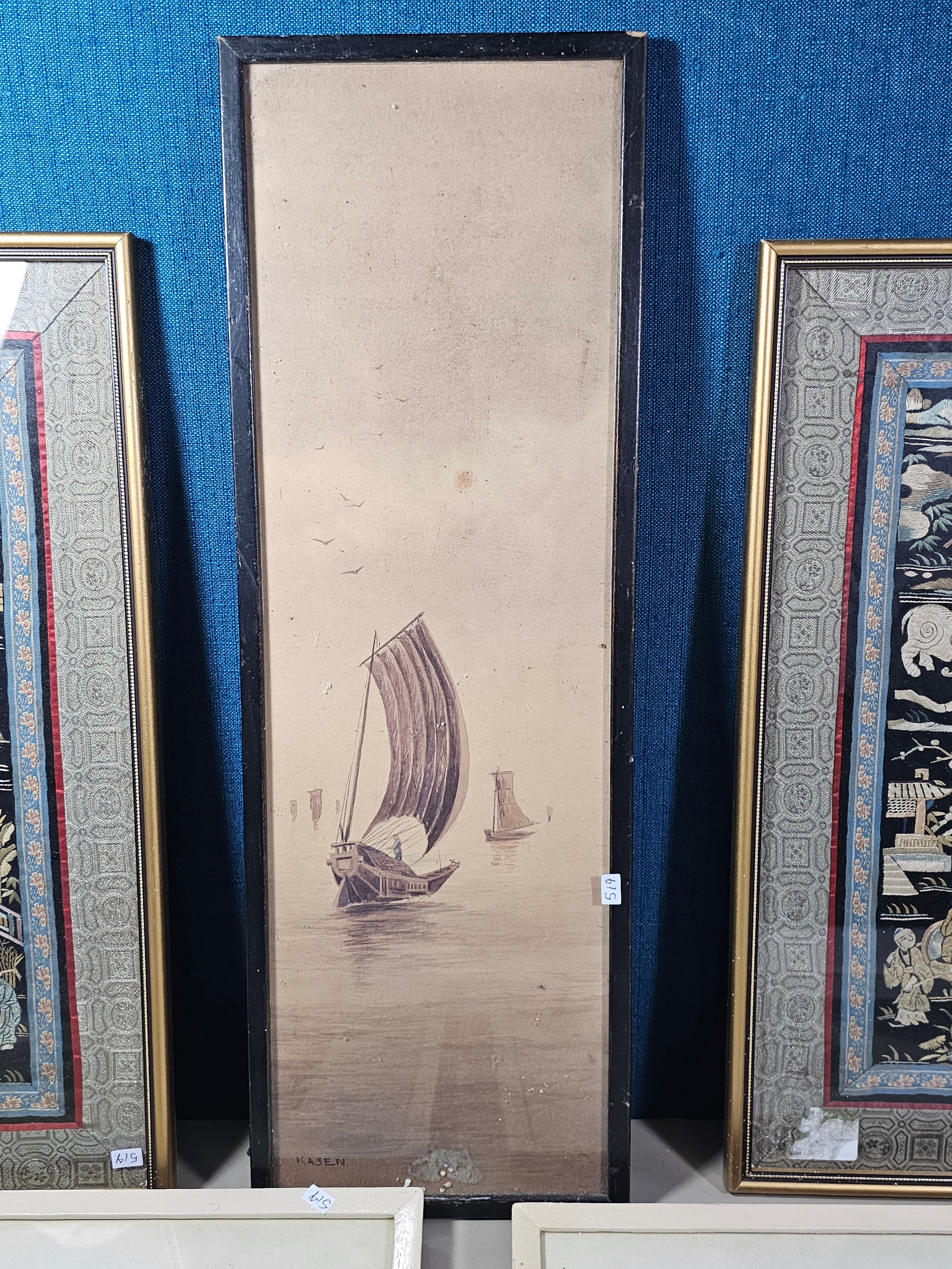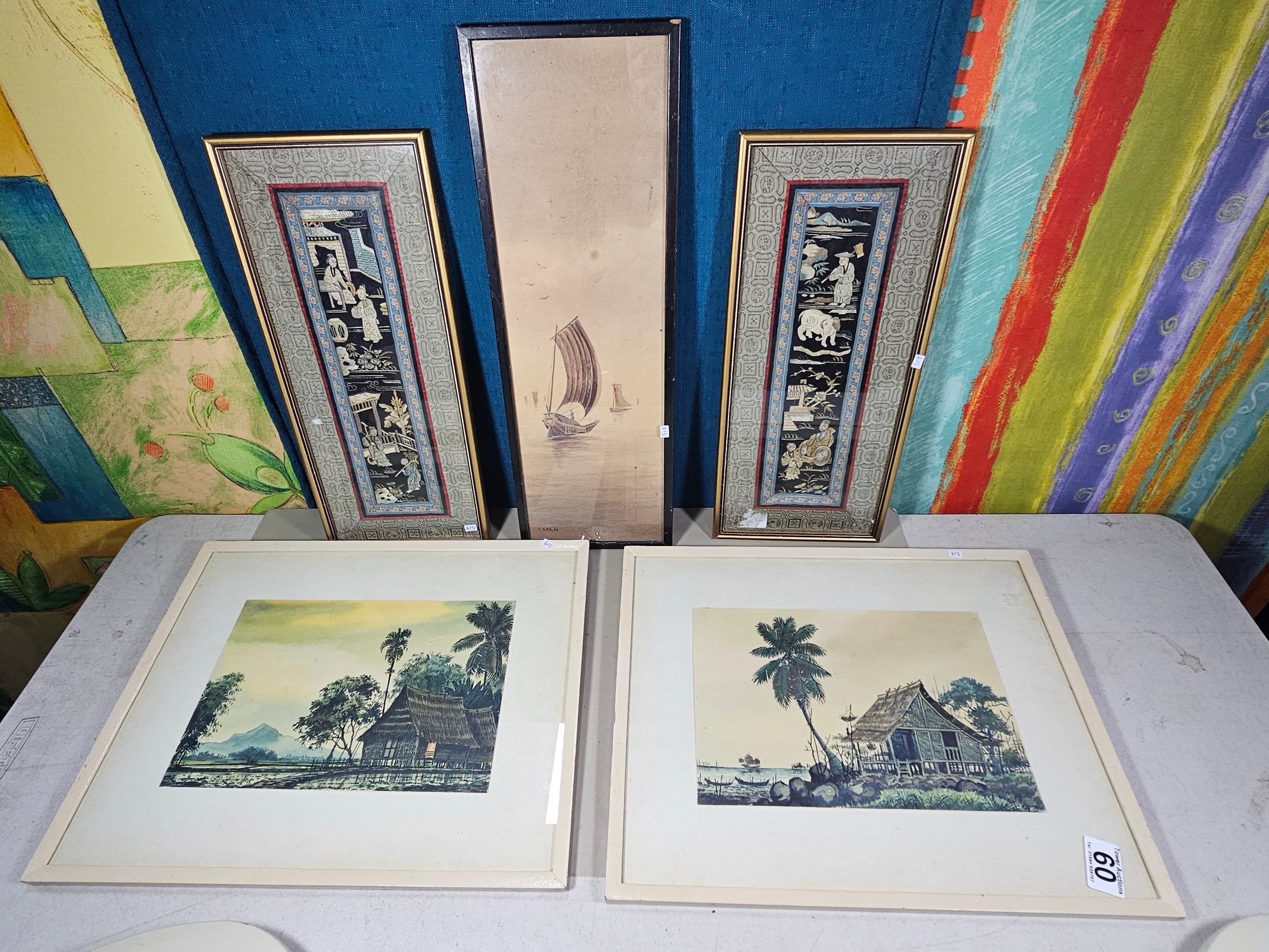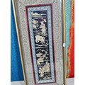 A collection of 5 framed and glazed pictures to include 2 Oriental silks depicting farm scenes, a watercolour of boats signed Kasen along with 2 white framed watercolours of Chinese river scenes. The largest pictures have a height of 34cm and have a width of 42cm.