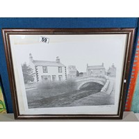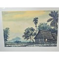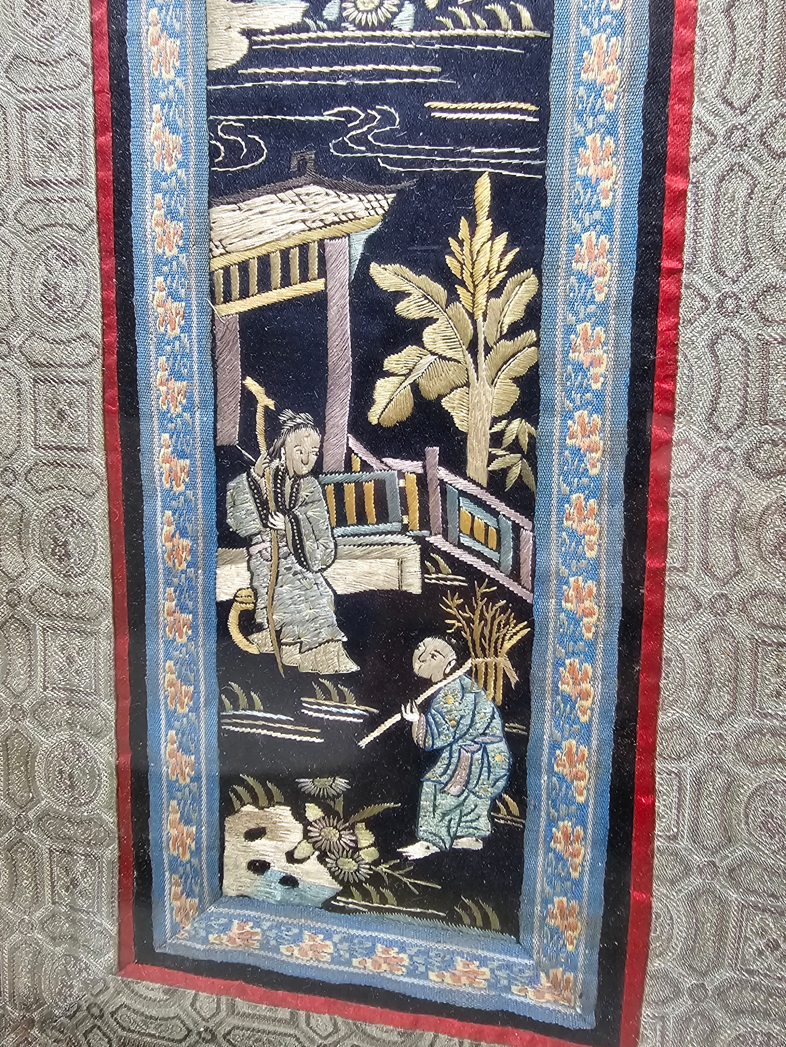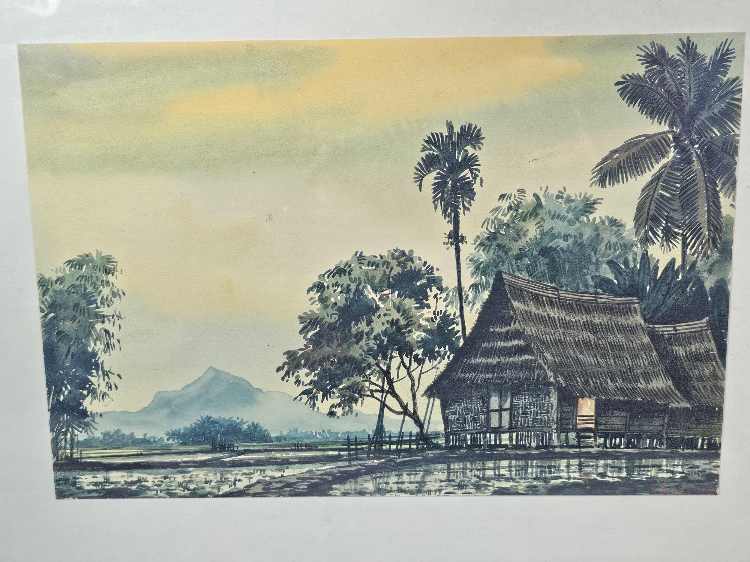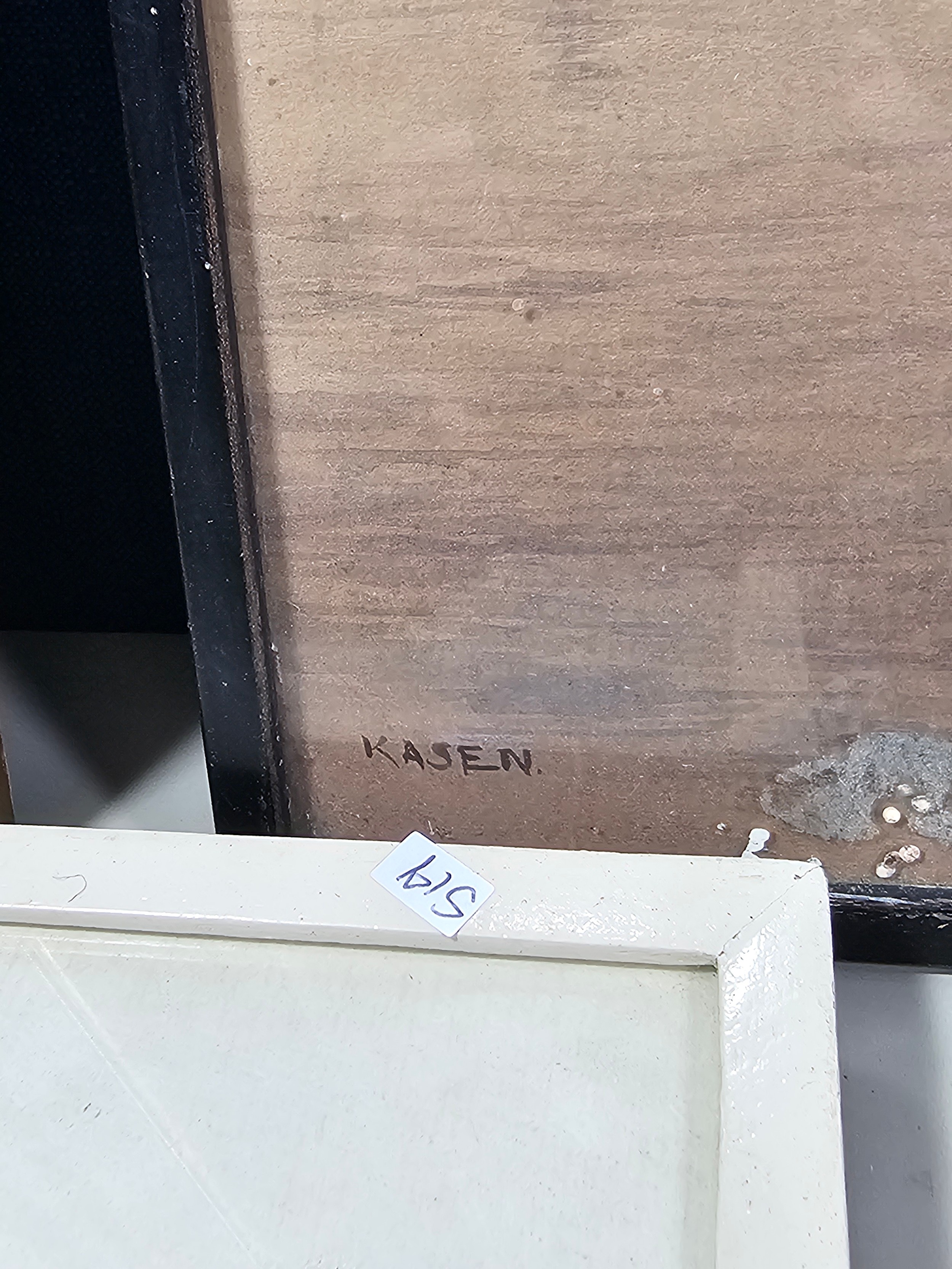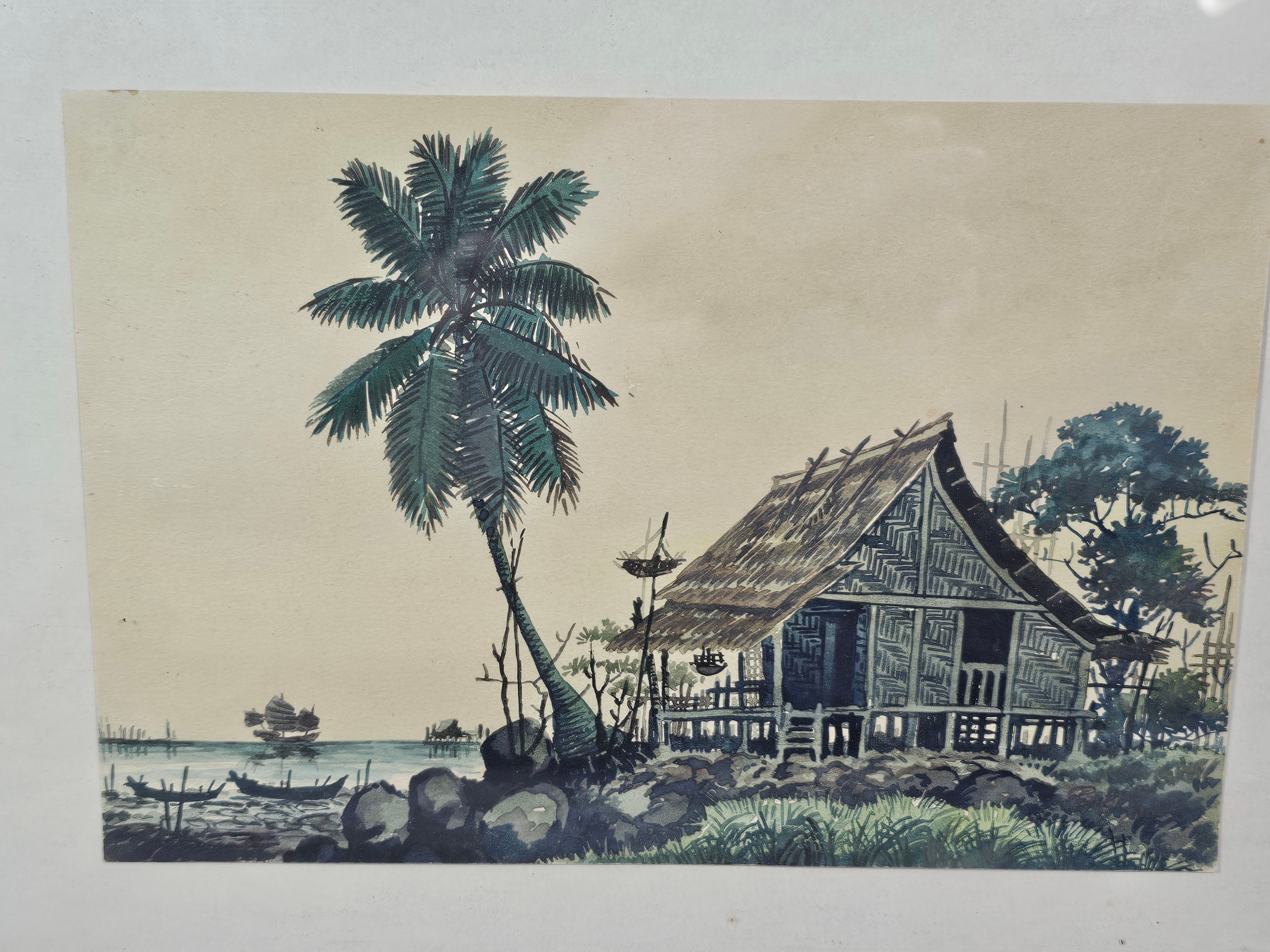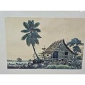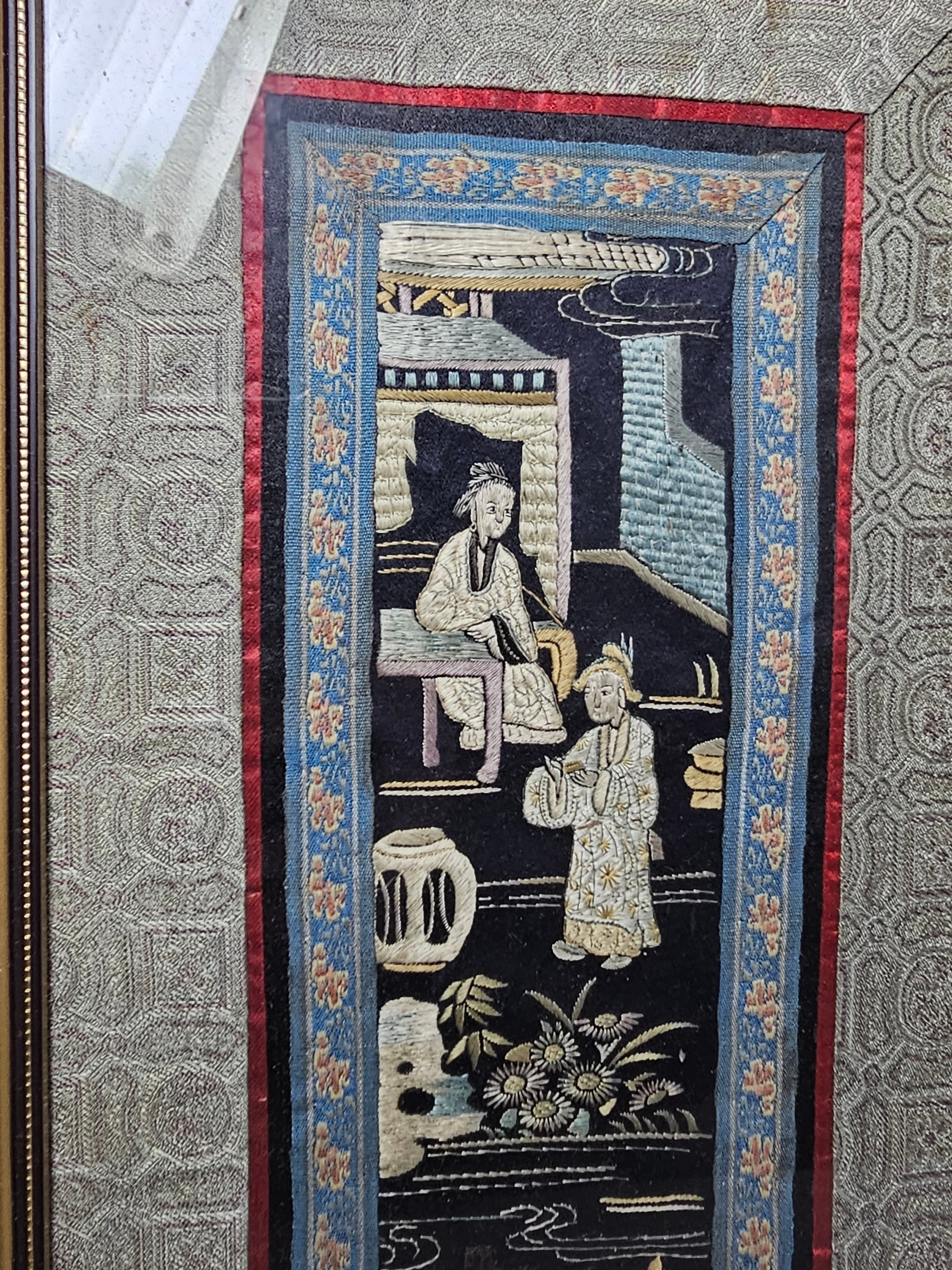 A collection of 5 framed and glazed pictures to include 2 Oriental silks depicting farm scenes, a watercolour of boats signed Kasen along with 2 white framed watercolours of Chinese river scenes. The largest pictures have a height of 34cm and have a width of 42cm.