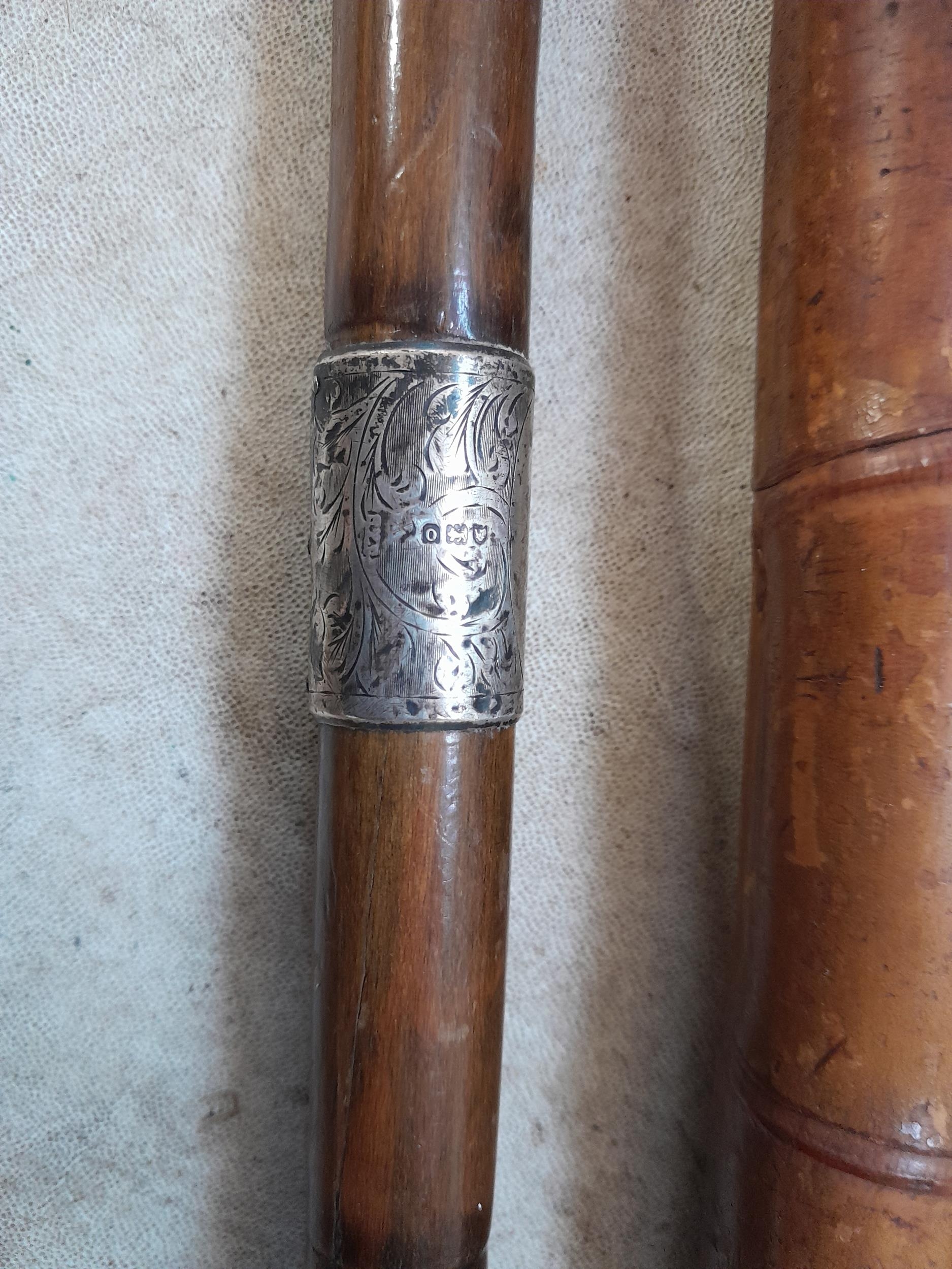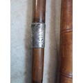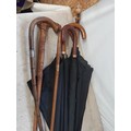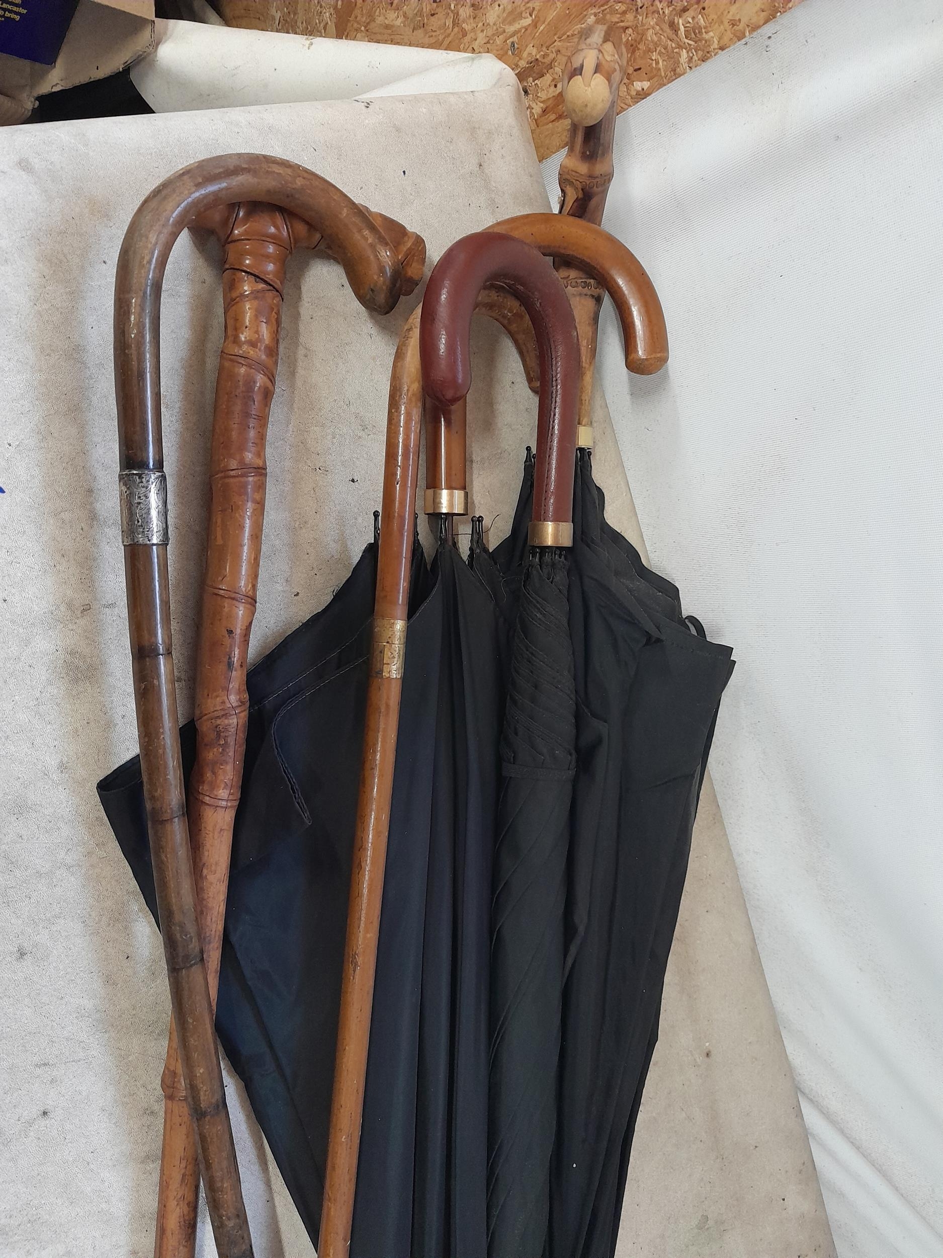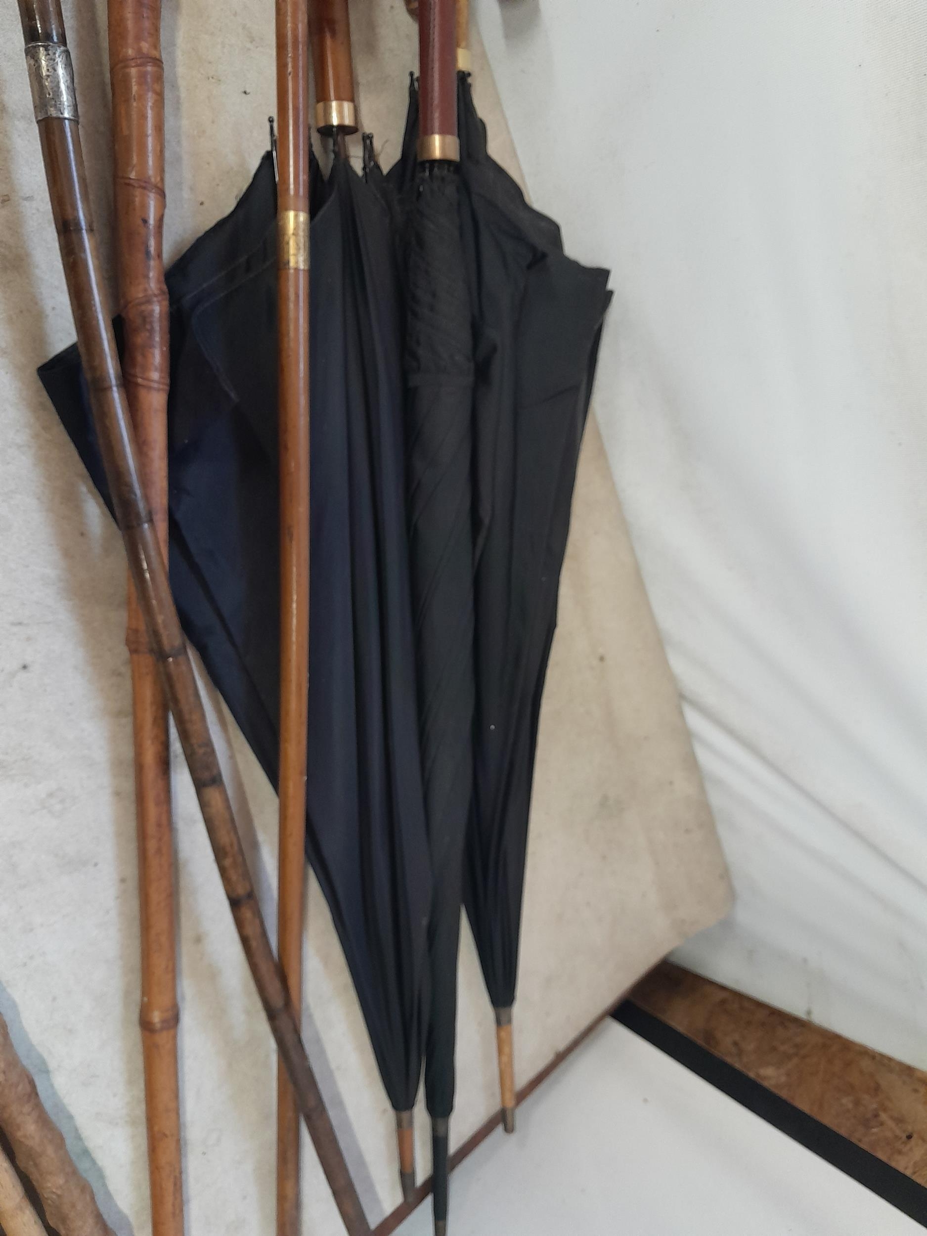 Collection of mixed era walking sticks, canes and umbrellas : Gold plated, rolled gold and silver collars
