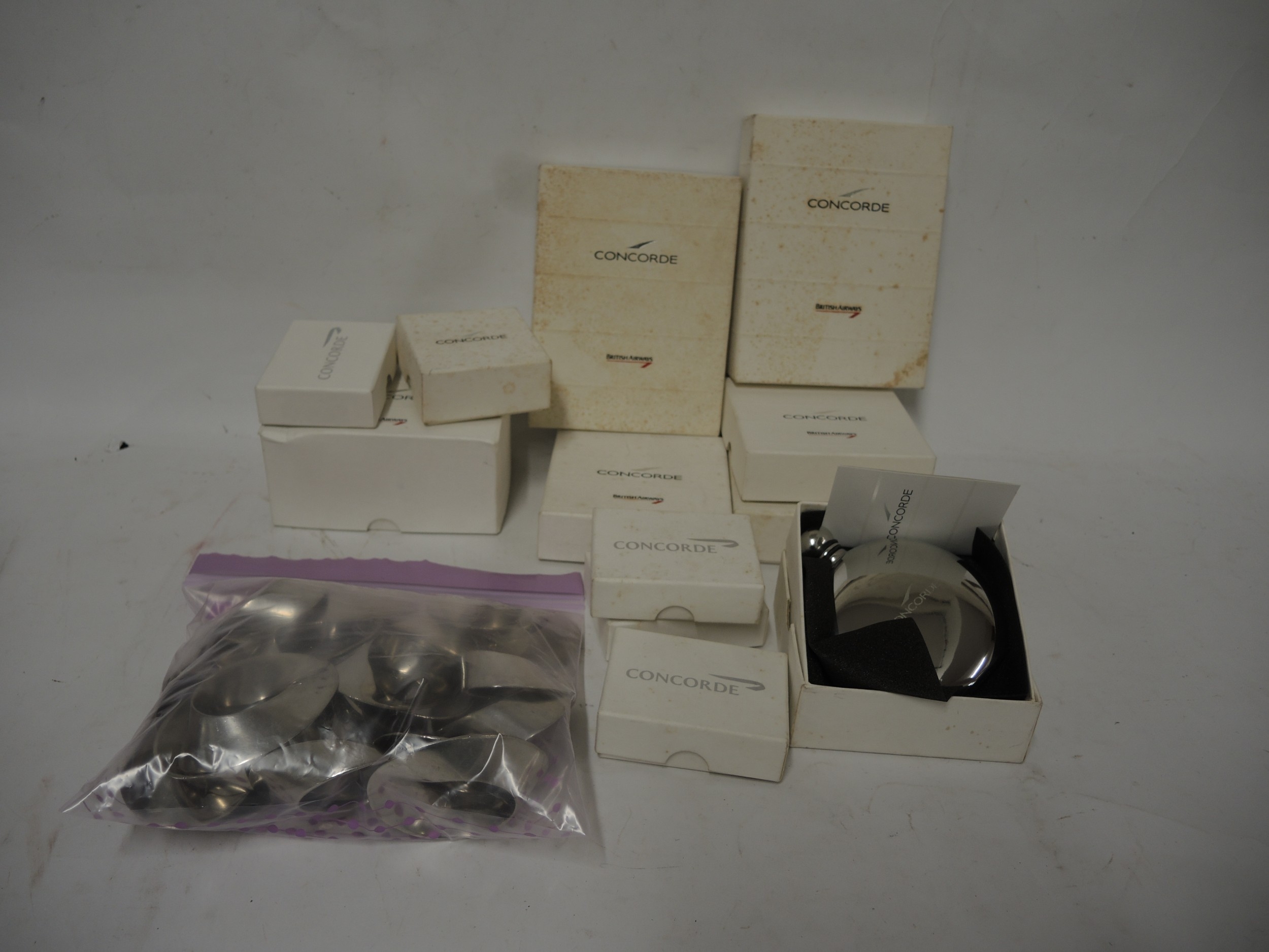 Quantity of Concorde boxed presentation stainless steel and silver plated items including hip flasks, napkin rings, keyrings and bottle openers