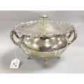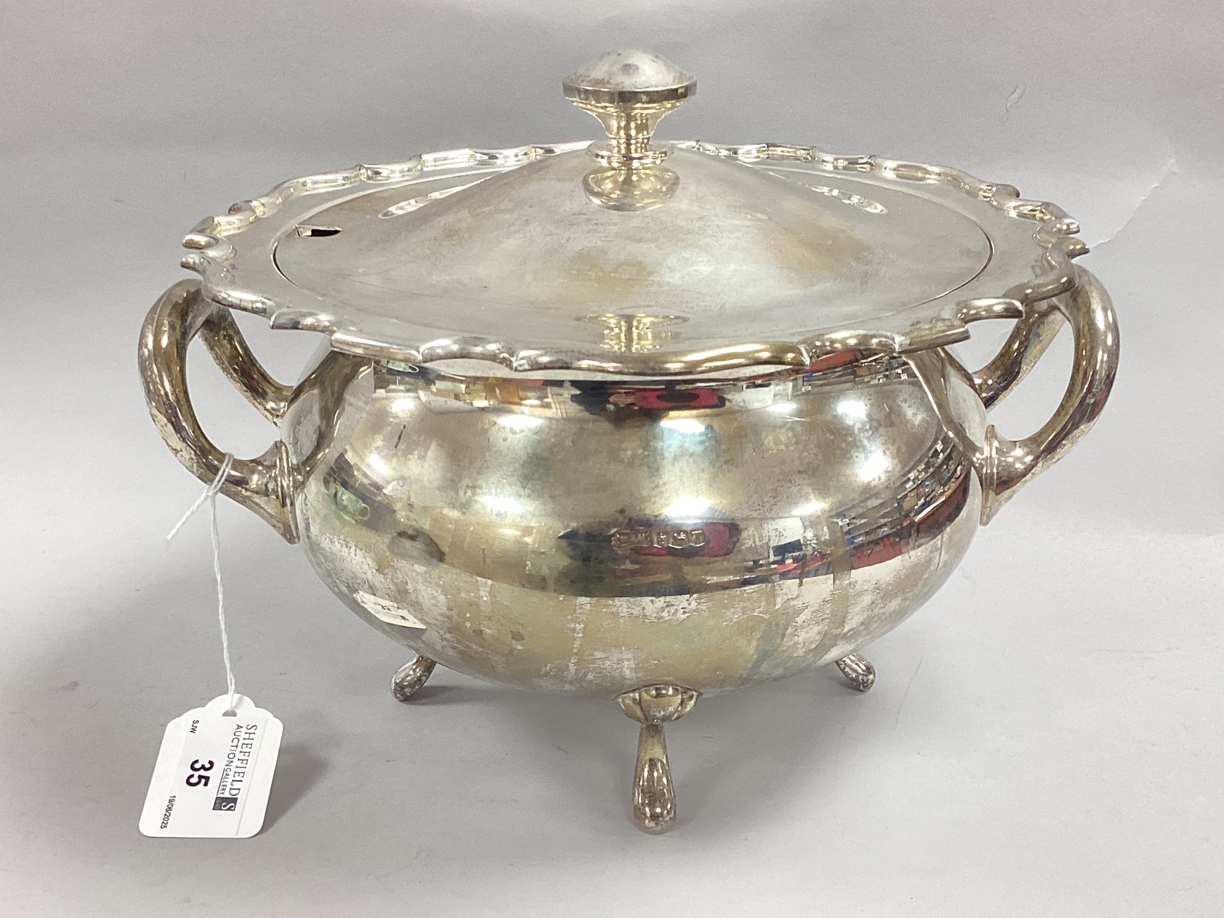 A Hallmarked Silver Twin Handled Soup Tureen, Walker & Hall, Sheffield 1961, of plain circular cauldron form, with shaped edge and pull off cover, raised on four pad feet, overall width over handles approximately 26cm (1590grams).
