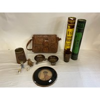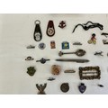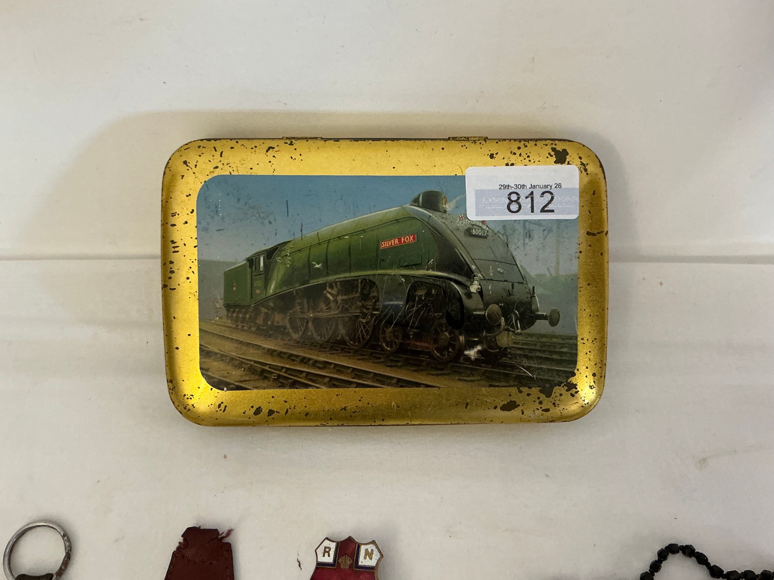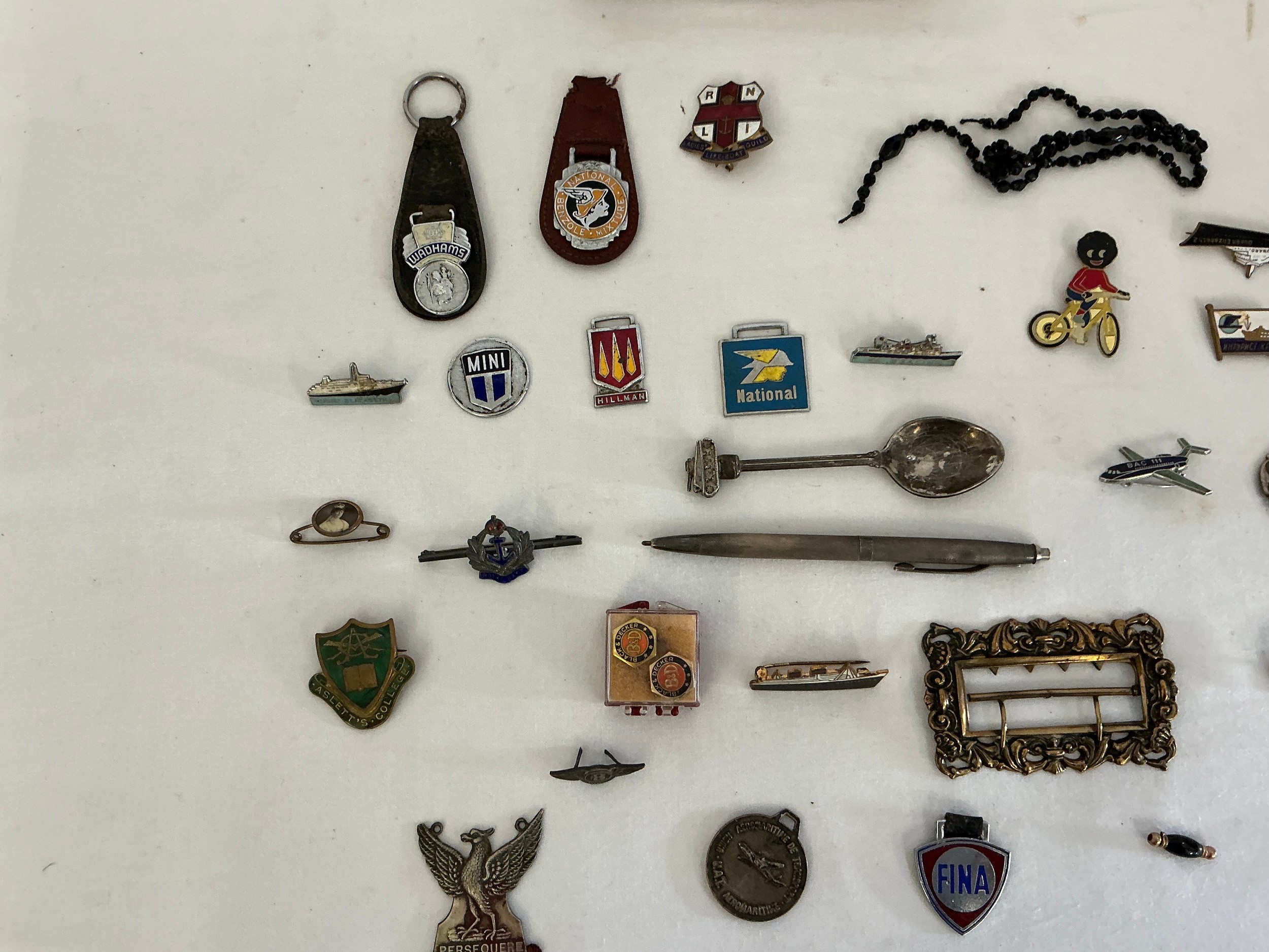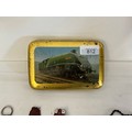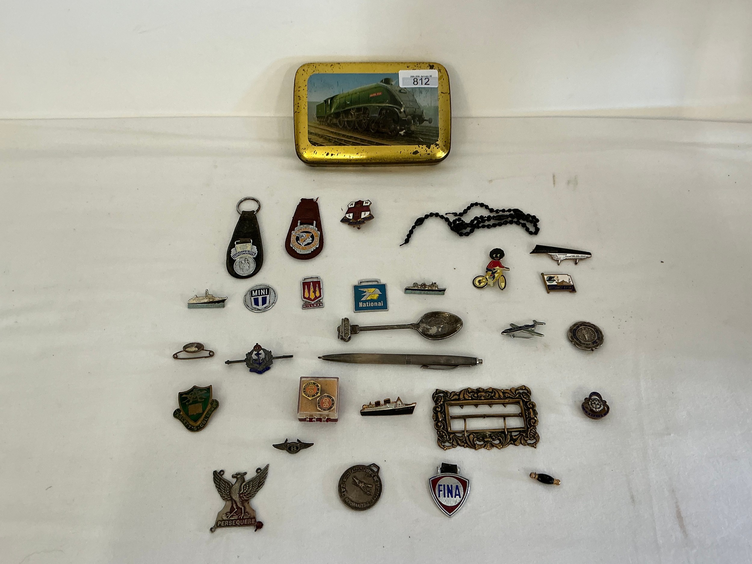 A Collection of Vintage Badges to include Enamelled Liner "Mauretania", "Queen Elizabeth", Russian Shipping, Bentley Badge, Golly on Bike, BAC 3, Watermans Silver Pencil, etc Contained in a Railway Loco Tin.