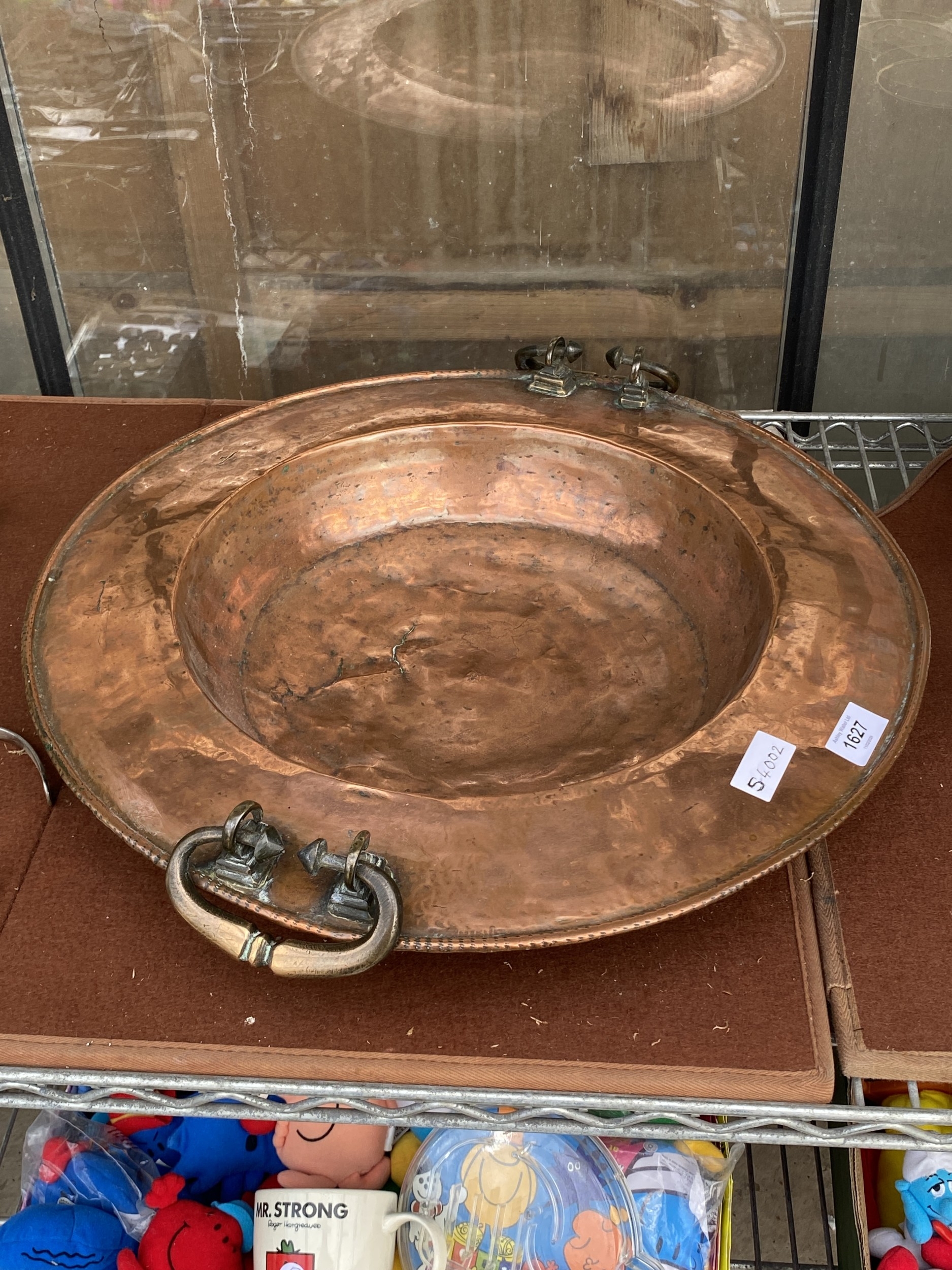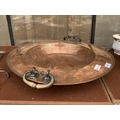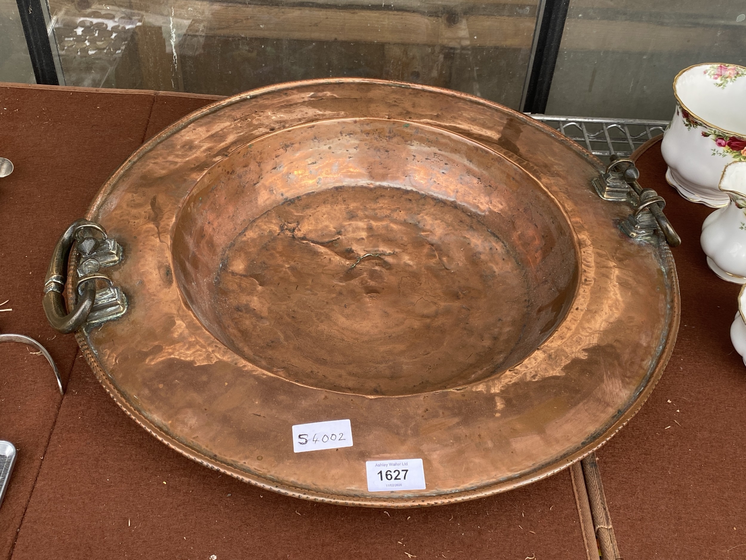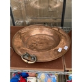 A LARGE VINTAGE COPPER BOWL WITH BRASS CARRYING HANDLES (D:5...