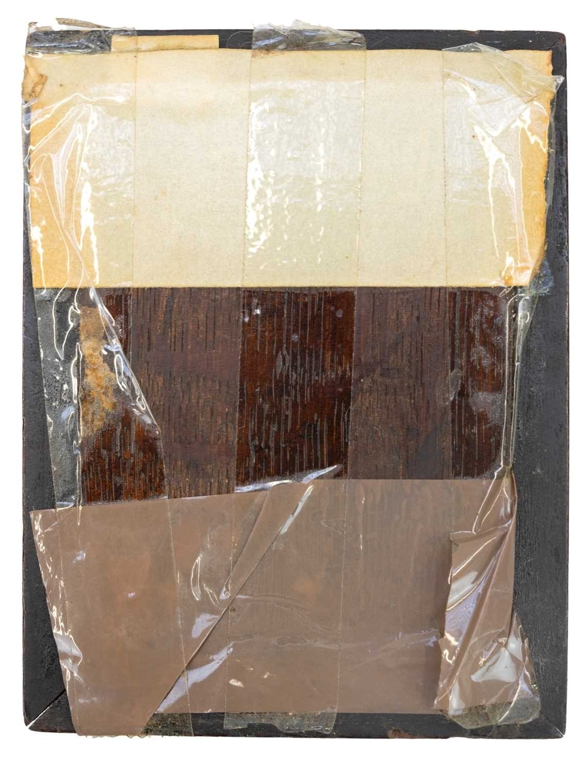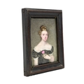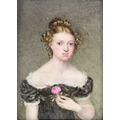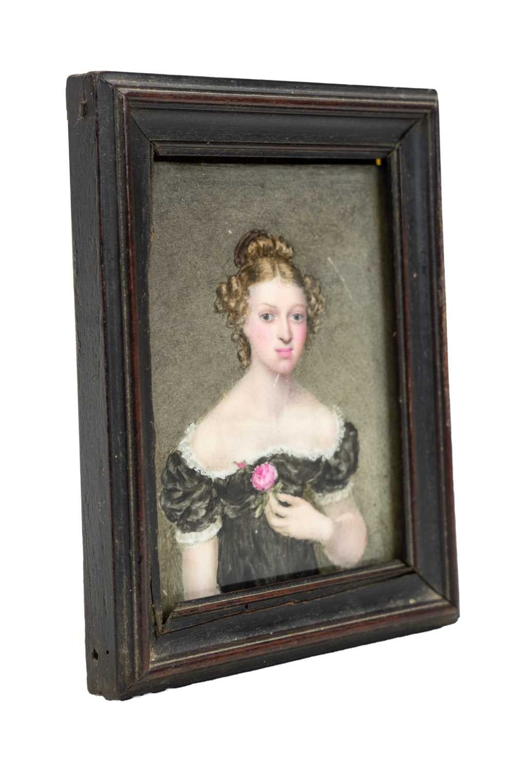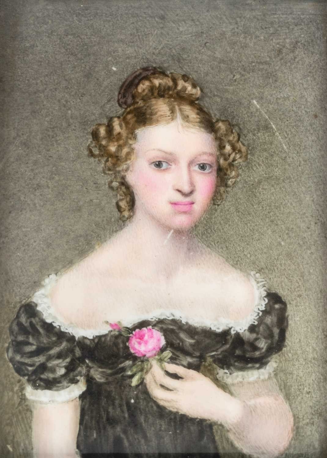 A portrait miniature on porcelain of a young woman. Mid 19th century, wearing a lace trimmed black dress and holding a rose, 10.3 x 9cm, framed. j