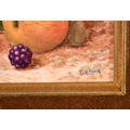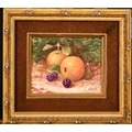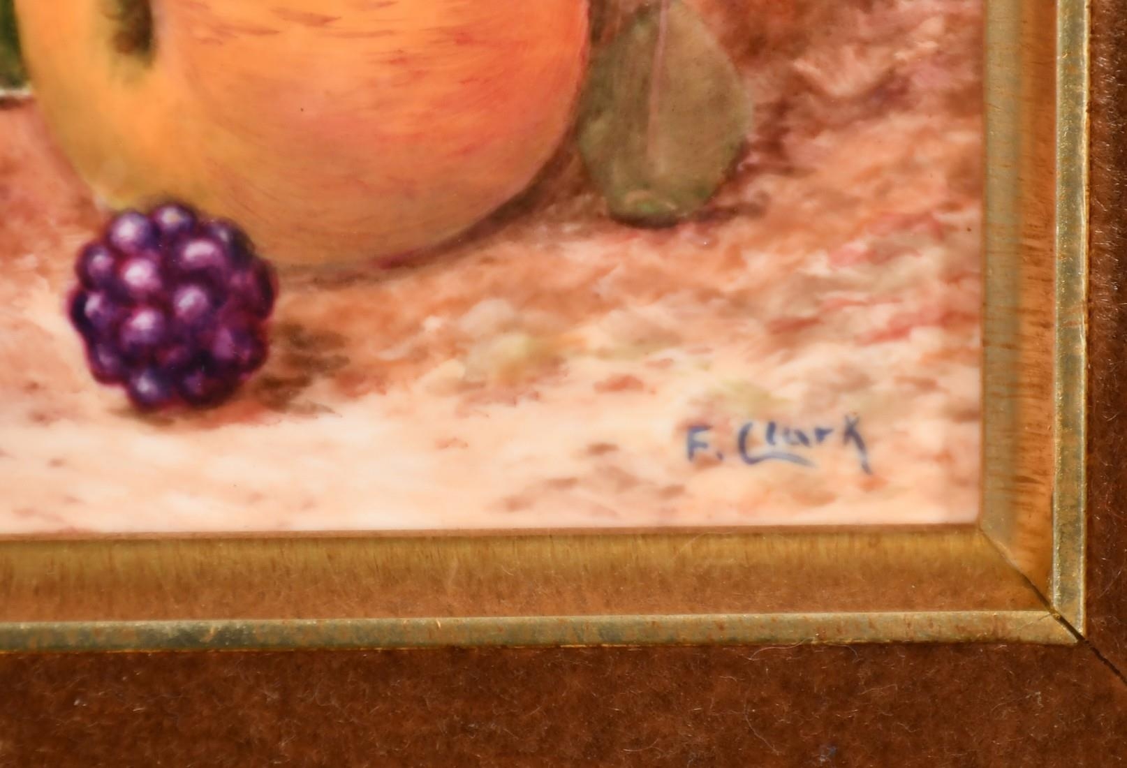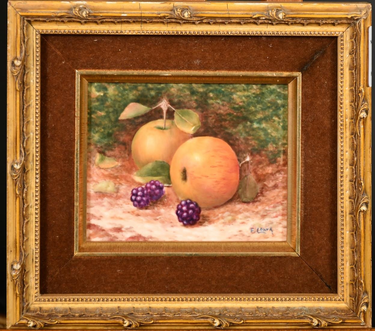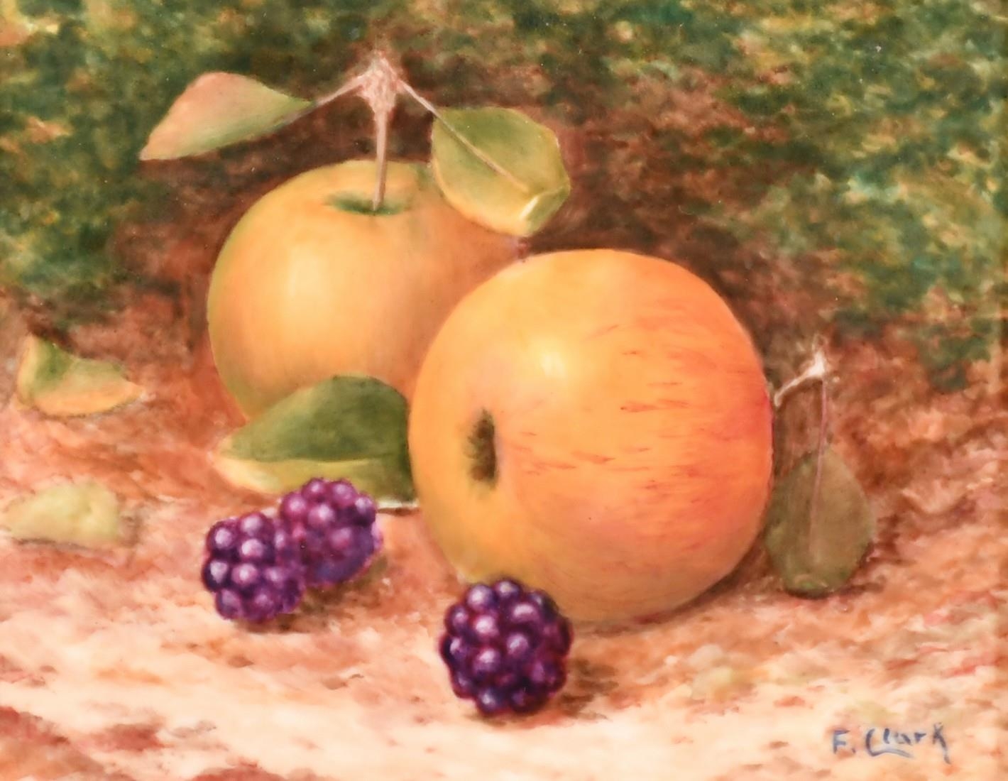 F. Clark, a painted porcelain tile of apples and blackberries, signed, 3.25" x 4", (8x10cm).