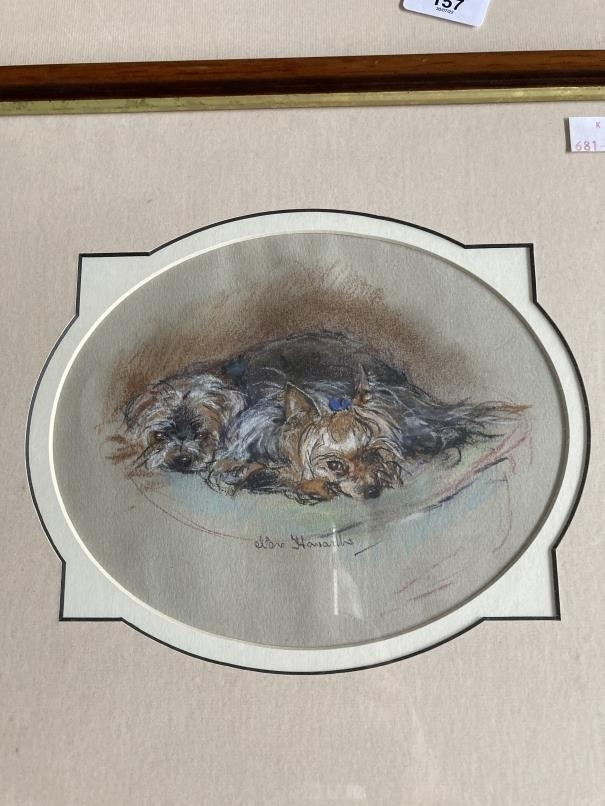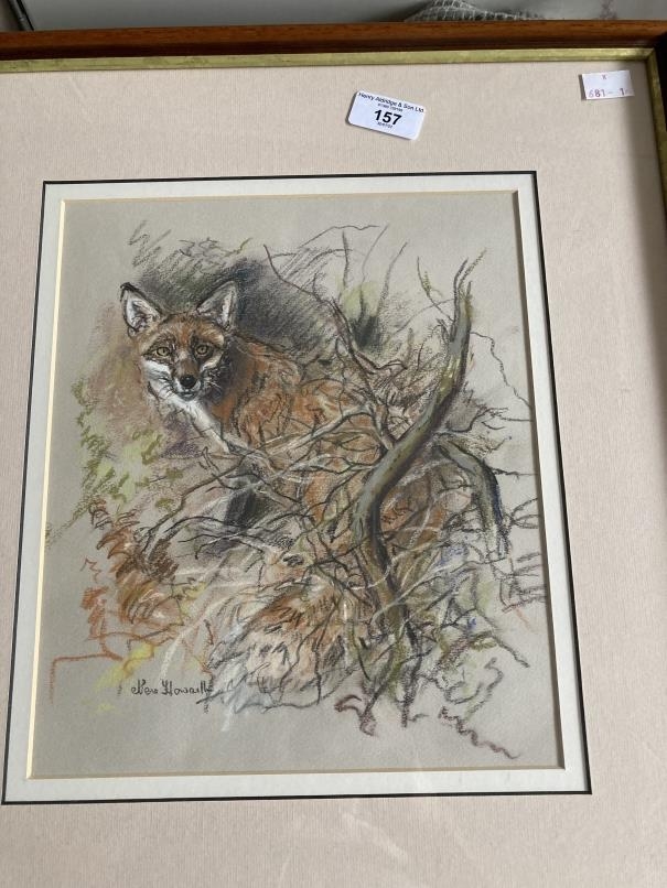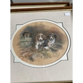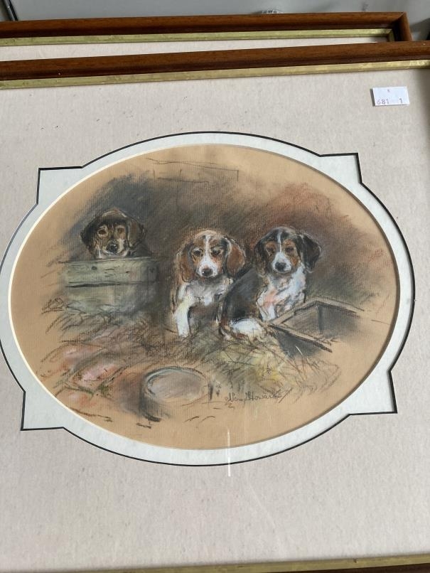 Nora Howarth: Pastels on paper, fox in undergrowth, signed, framed and glazed. 11ins. x 9ins. Jack Russell terriers waiting for food, framed and glazed, oval. 8¼ins. x 10¼ins. Terriers resting, signed, framed and glazed, oval. 5½ins. x 8ins. (3)