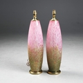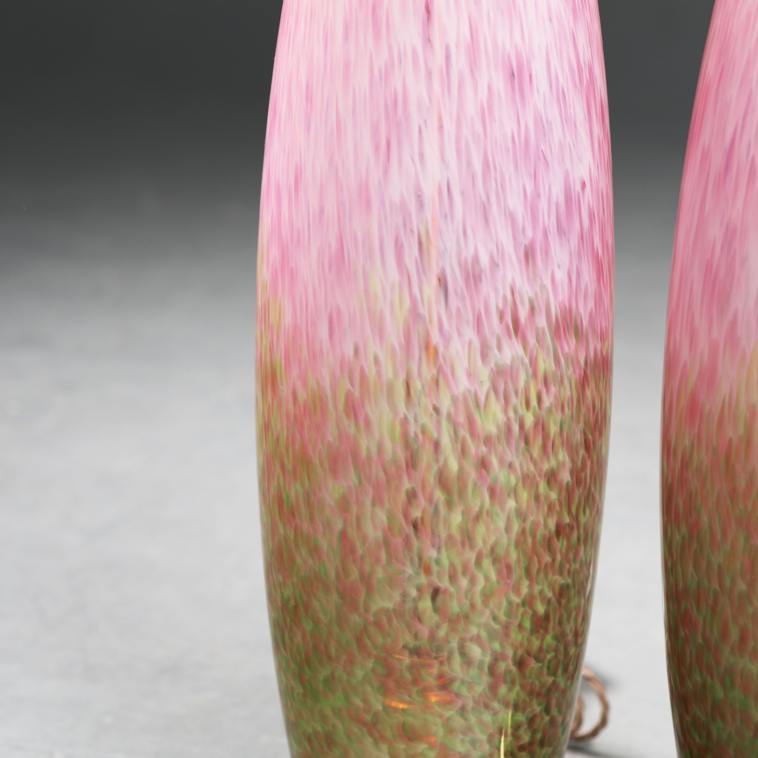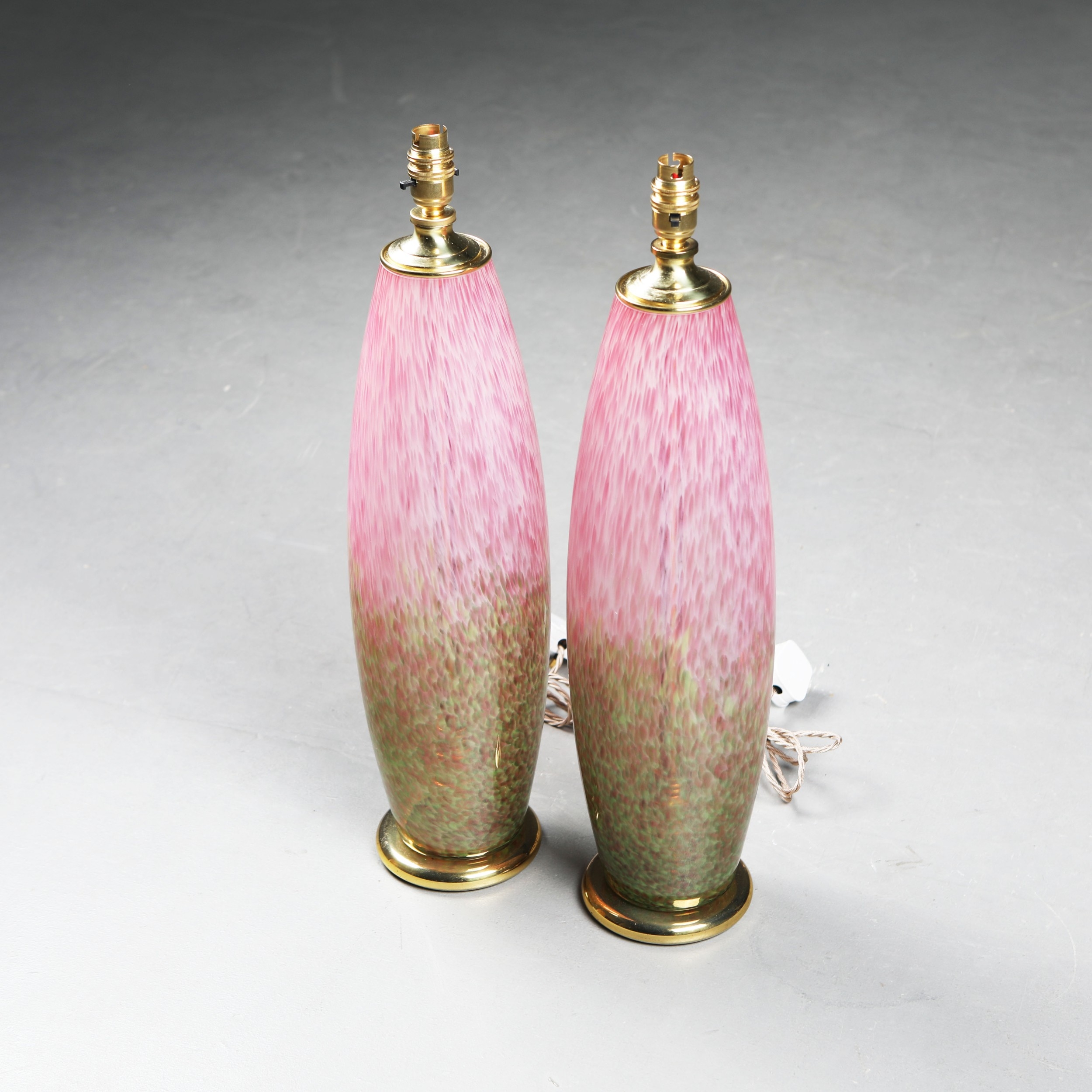 MURANO STYLE PINK CONFETTI GLASS TABLE LAMPS, A PAIR. brass mounts, 60cm H approx. (2).