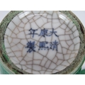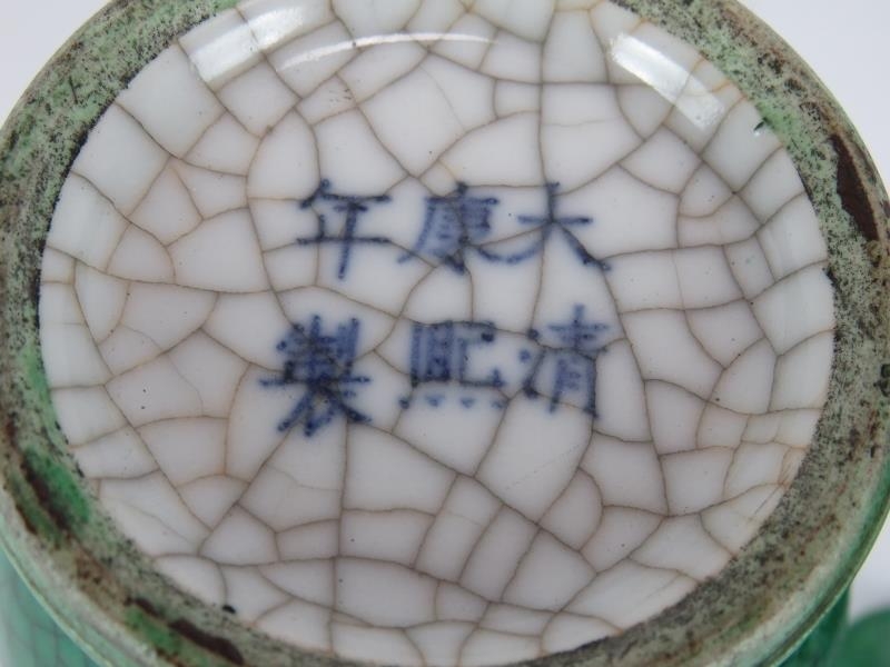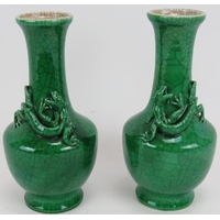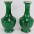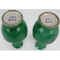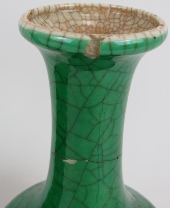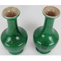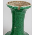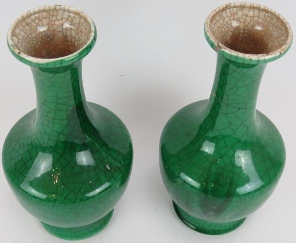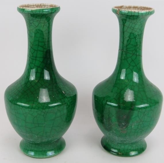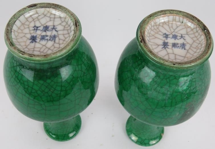 A pair of 20th century Chinese green crackle glaze baluster vases with six character marks to base. Height 23.5cm. (pr).