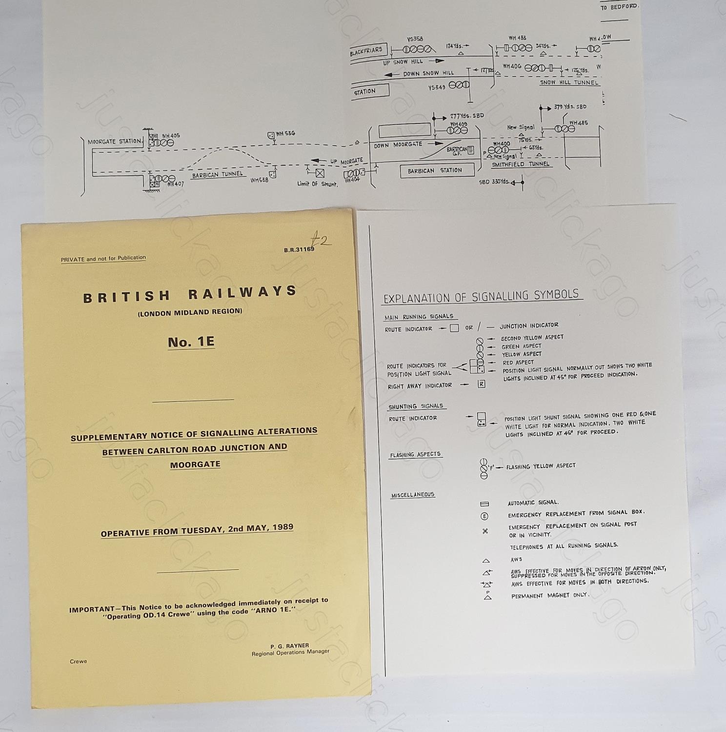 Railway. A B.R. London Midland Region notice. No 1E, signalling alterations between Carlton Road Jnt. and Moorgate. 1989. With good sized fold out, associated signalling diagram.