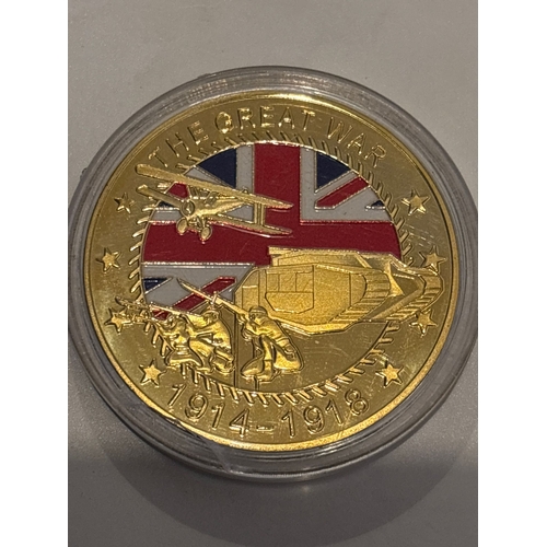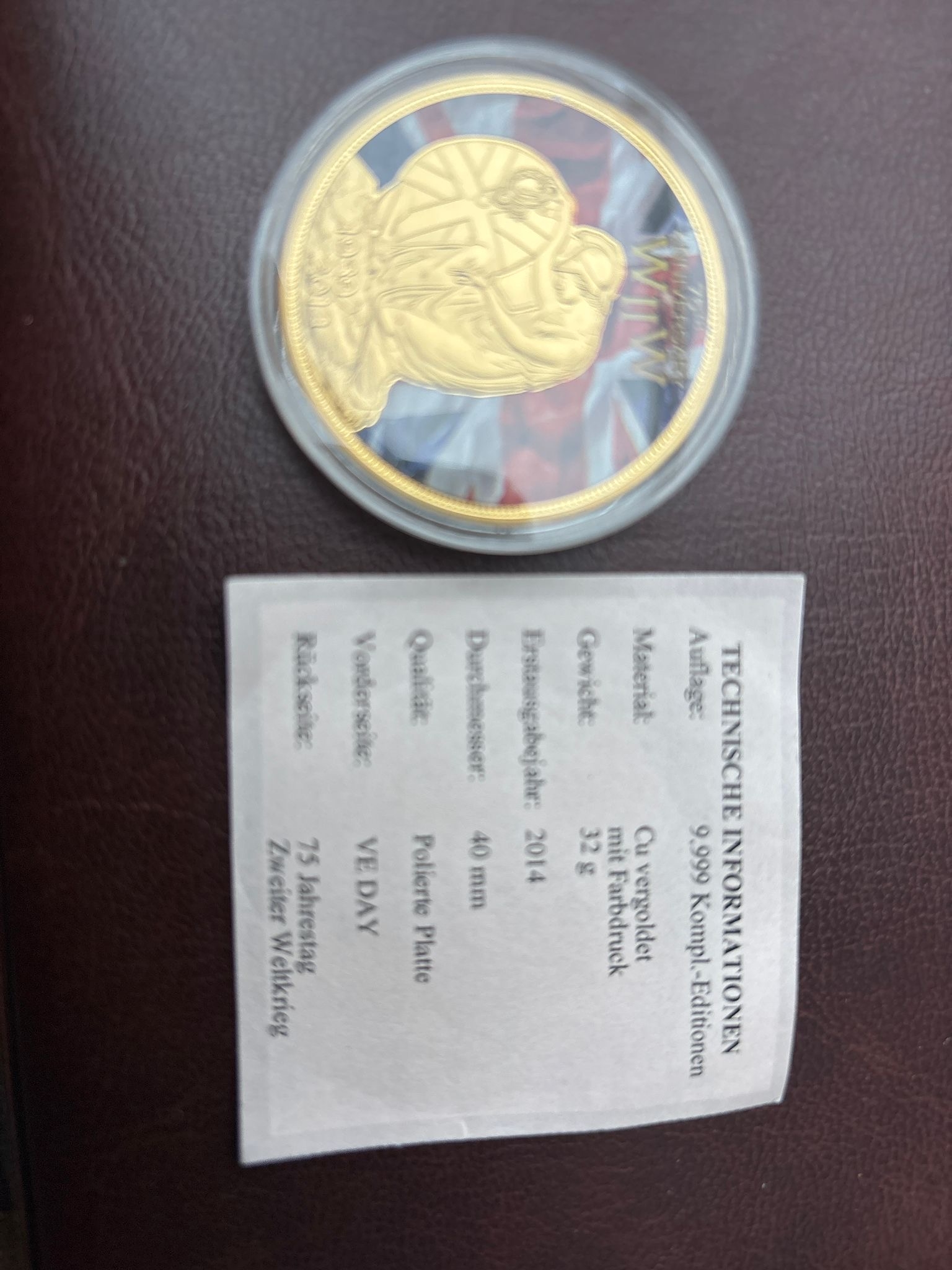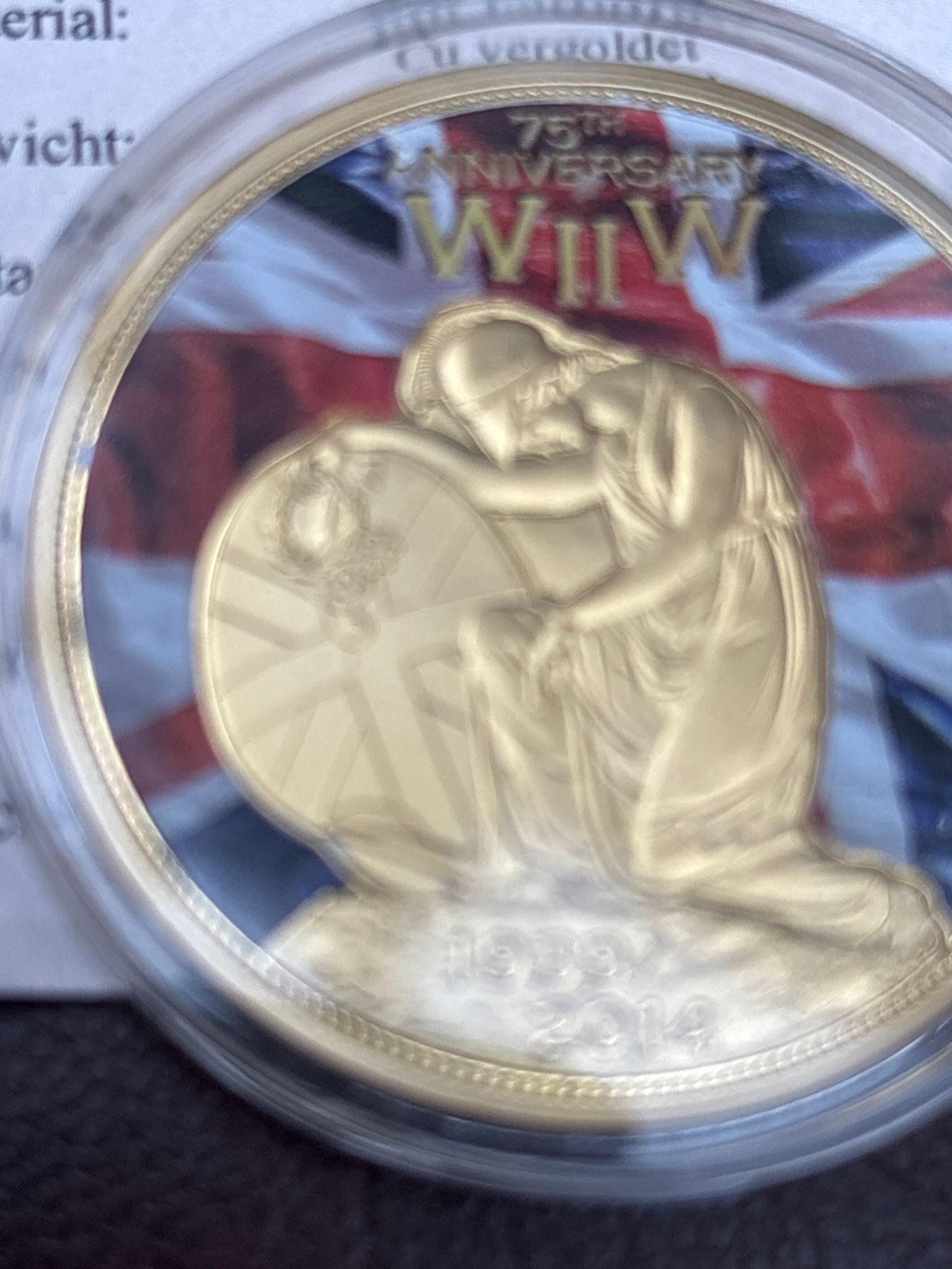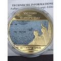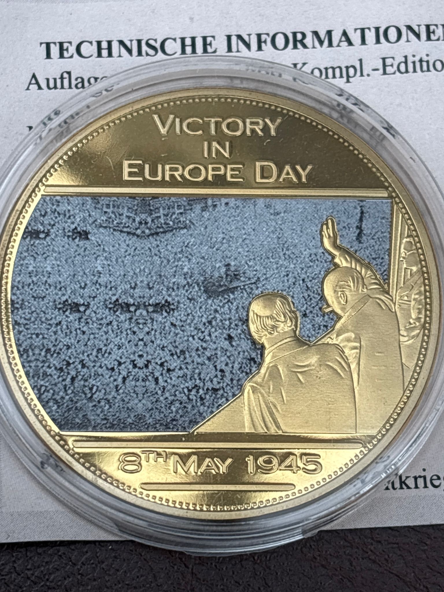 75th Anniversary WWII – VE Day Commemorative Medal (2014) Large proof-style commemorative medal marking the 75th anniversary of Victory in Europe Day. Gold-plated copper with colour Union Flag design, featuring Britannia and Winston Churchill celebrating 8 May 1945. Limited edition issue with certificate. Presented in capsule.