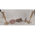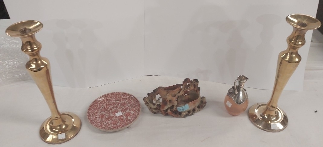 An oriental soap stone sculpture, 2 brass candlesticks, a Delft plate, a coloured glass and silver plated jug.