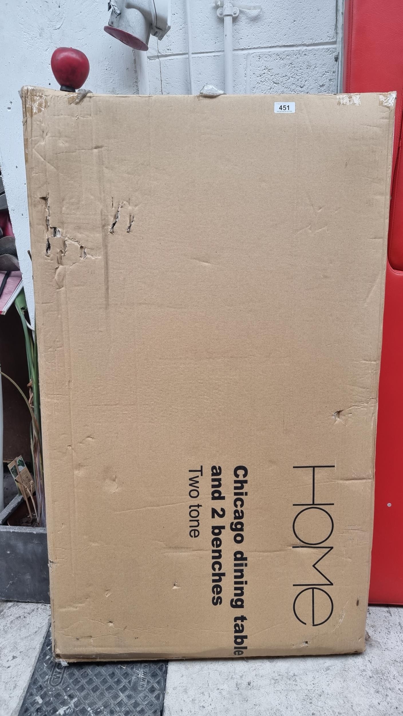 A large box containing a Chicago dining table and two benches in a two-toned finish. Needs assembling.