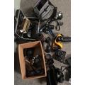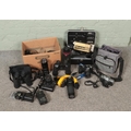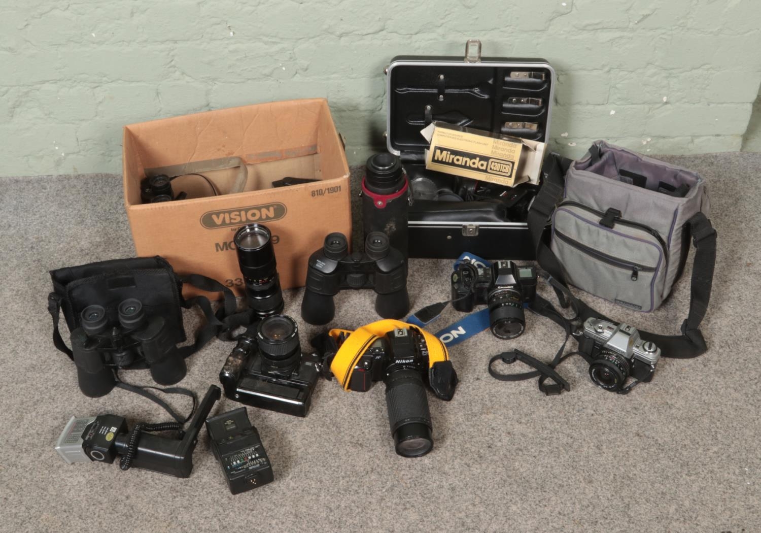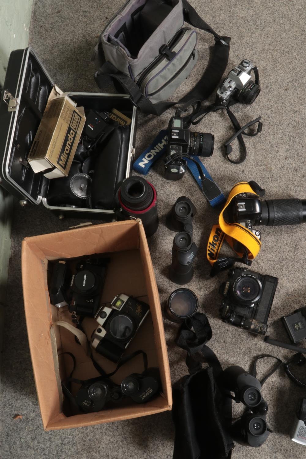 A collection of assorted vintage cameras, binoculars and photographic accessories to include Minolta X-300, Nikon F-601, Sakura, Minolta X-700, Miranda MS-1, etc.