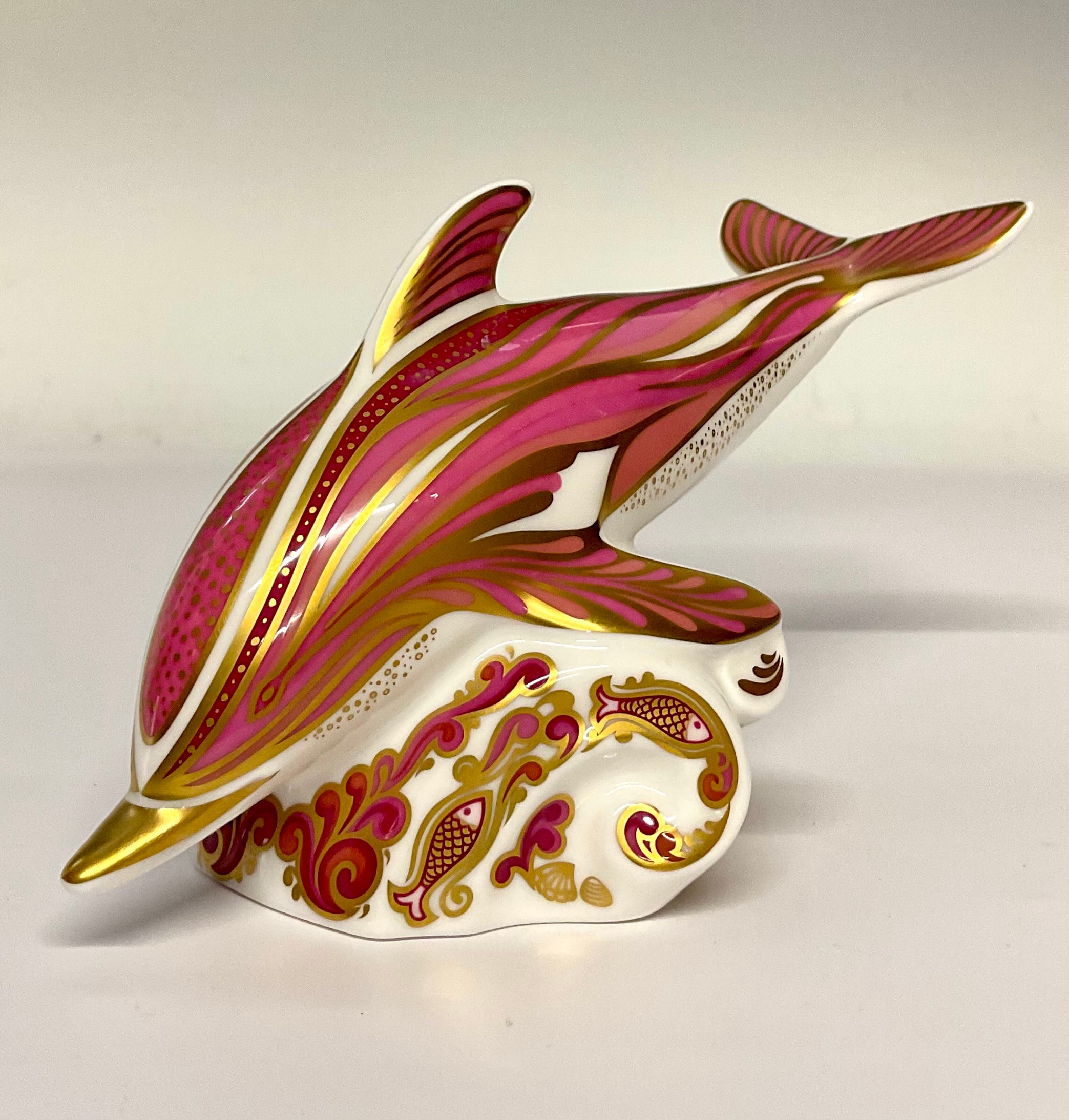 A Royal Crown Derby paperweight, Pink Dolphin, a limited edition of 150, gold stopper, 15cm long, printed mark in gold